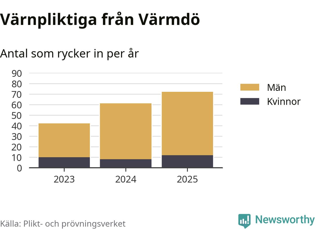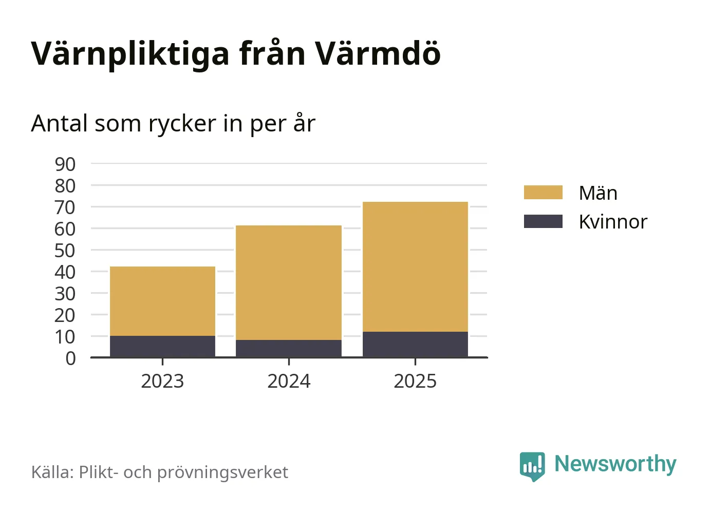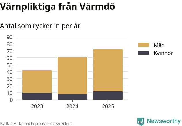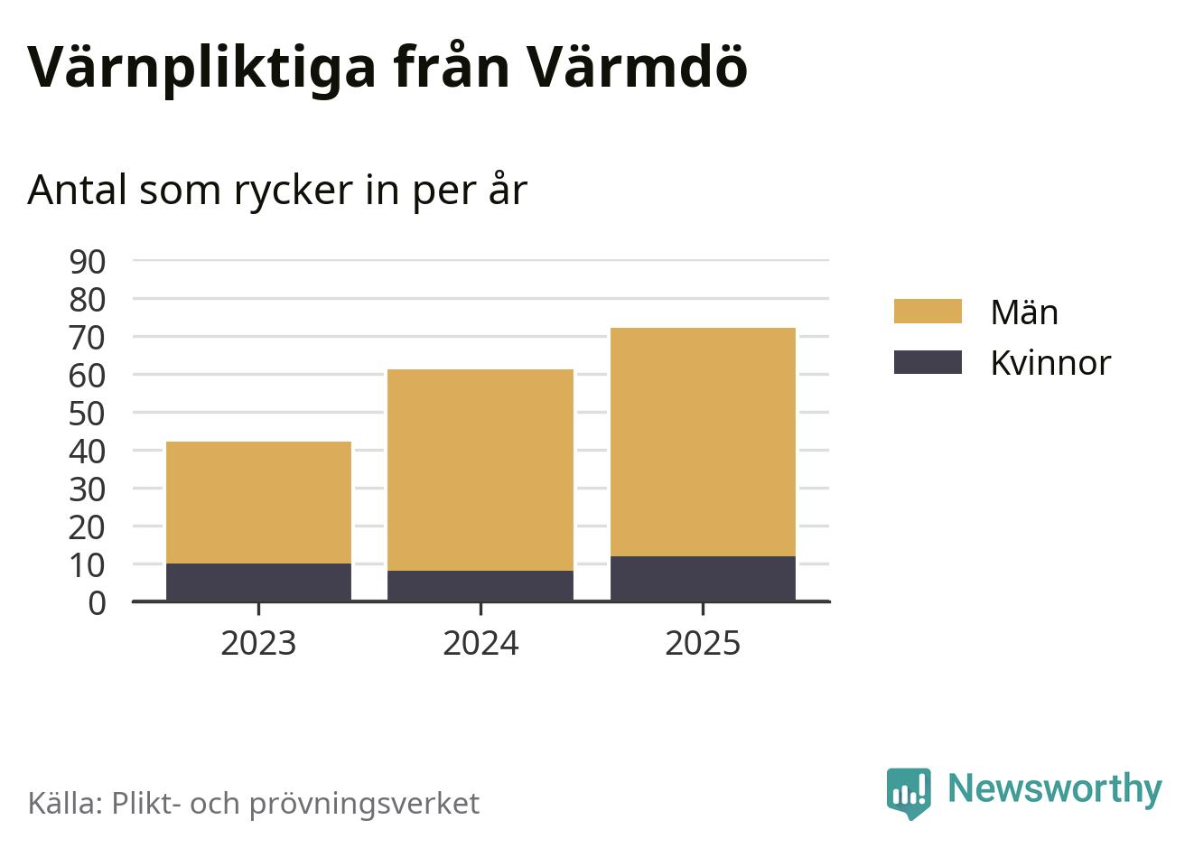 Sedan 2023 – som är det första året vi har jämförbara siffror för – har totalt 175 ungdomar från Värmdö påbörjat sin värnplikt. Av dem har 30 varit kvinnor.