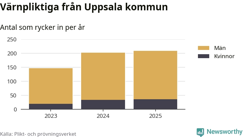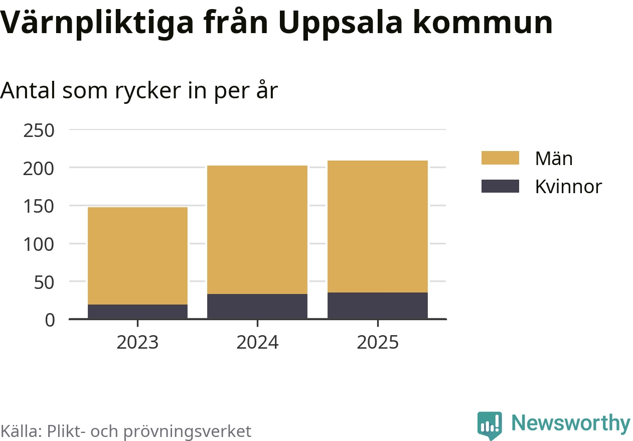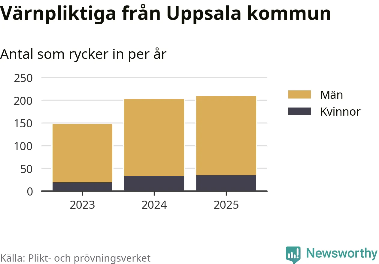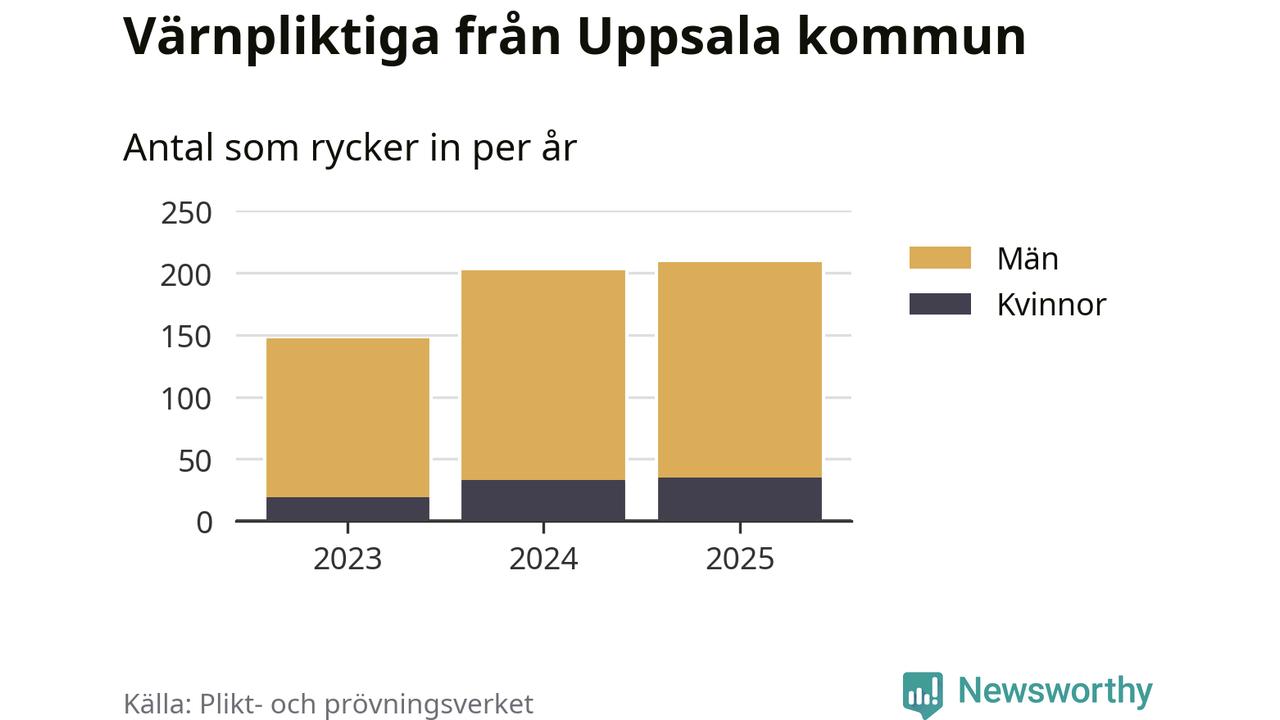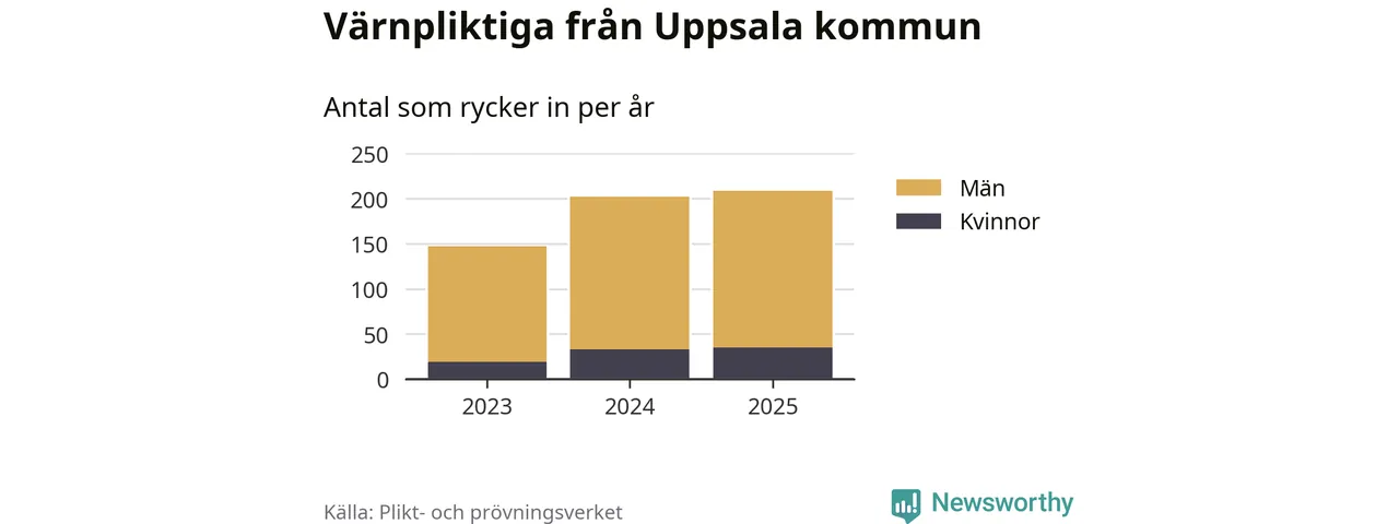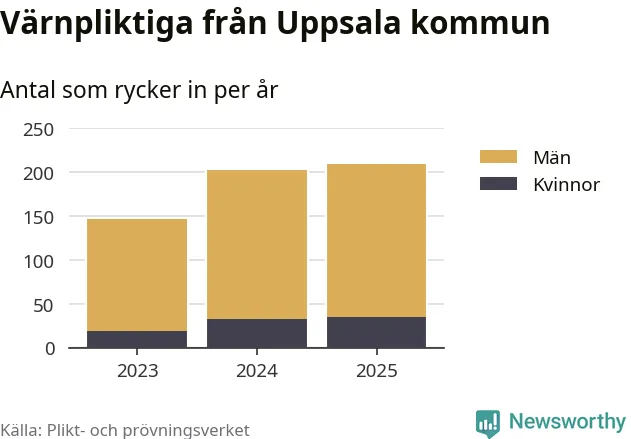 Sedan 2023 – som är det första året vi har jämförbara siffror för – har totalt 558 ungdomar från Uppsala kommun påbörjat sin värnplikt. Av dem har 87 varit kvinnor.