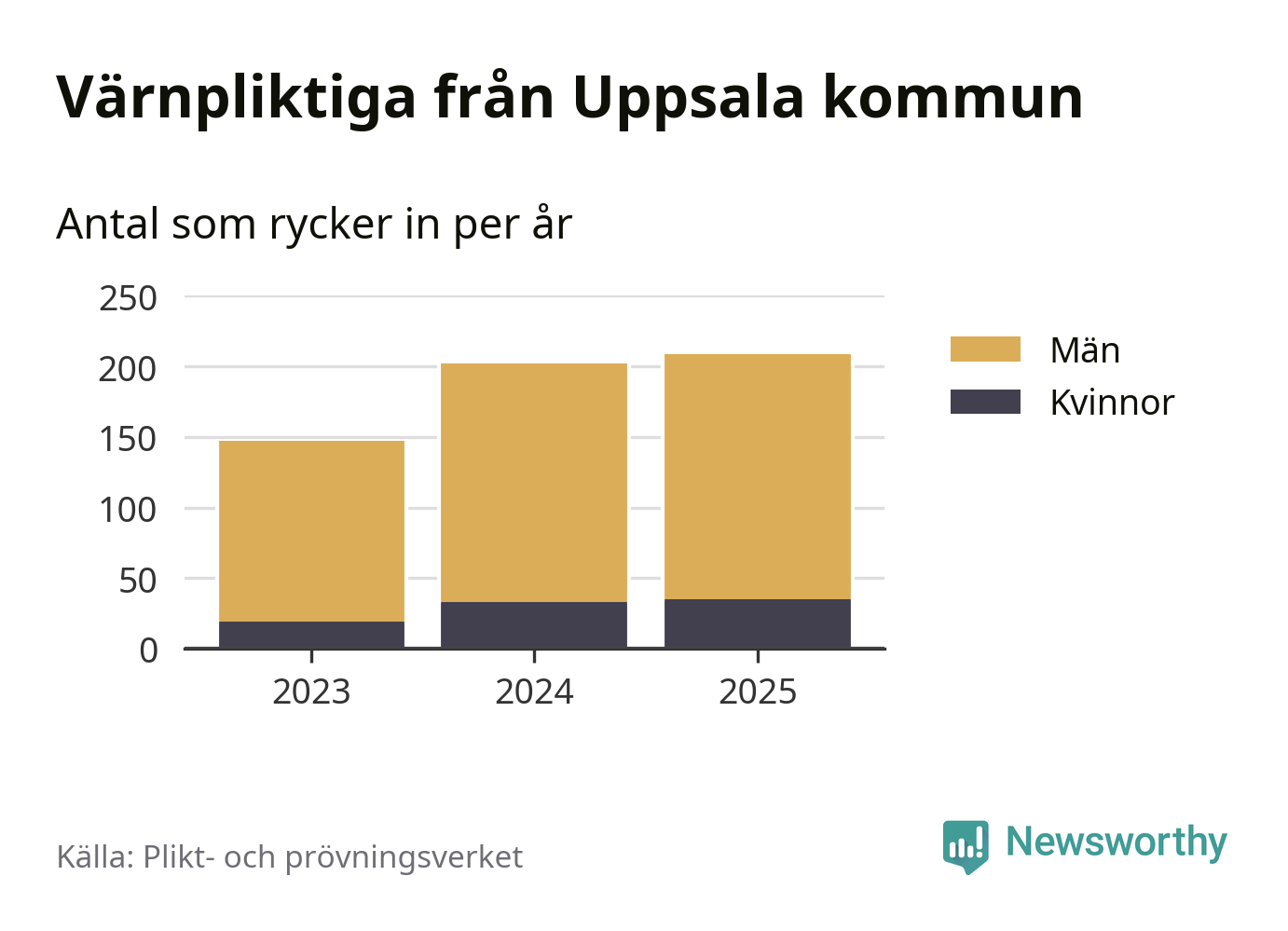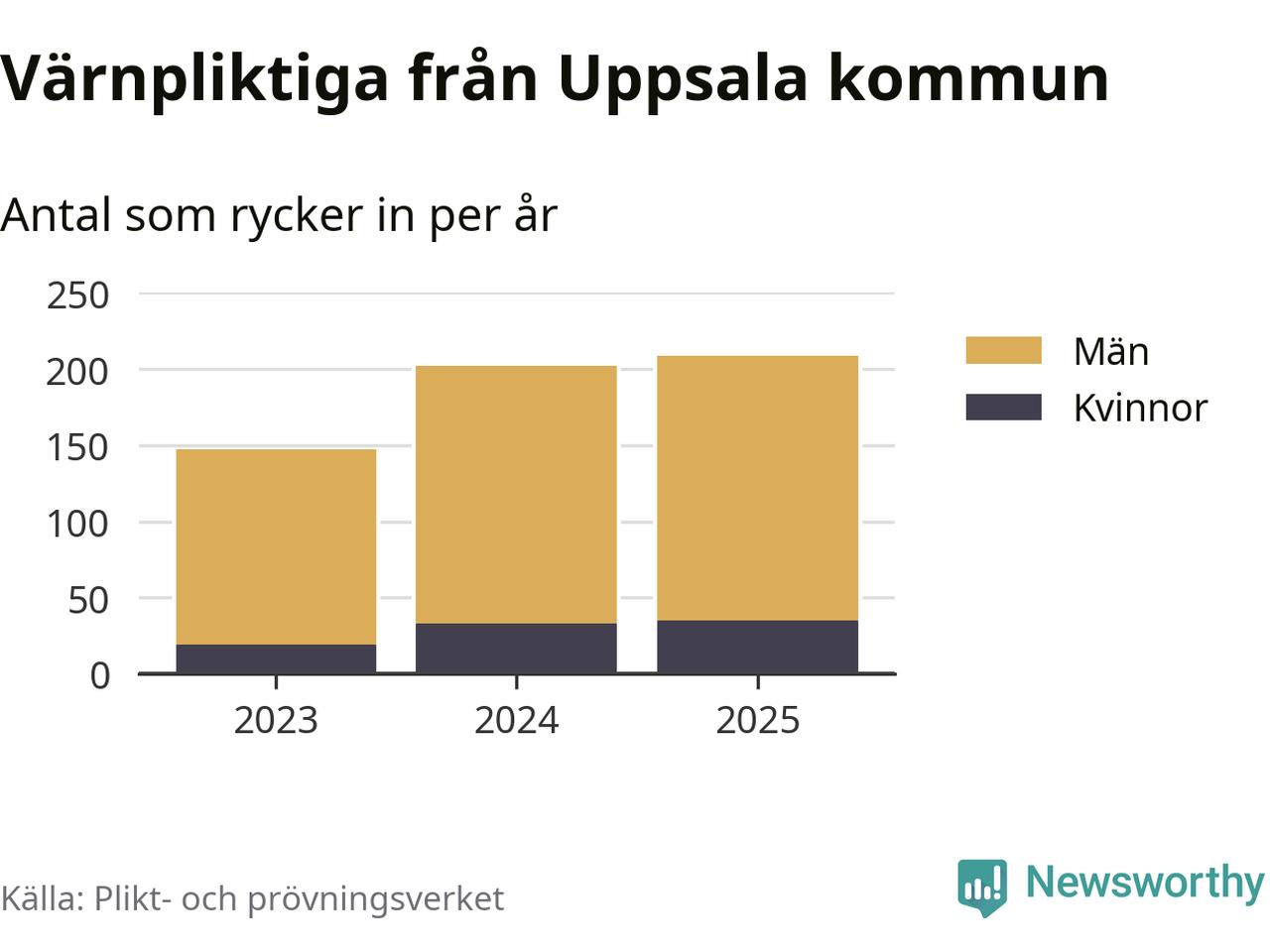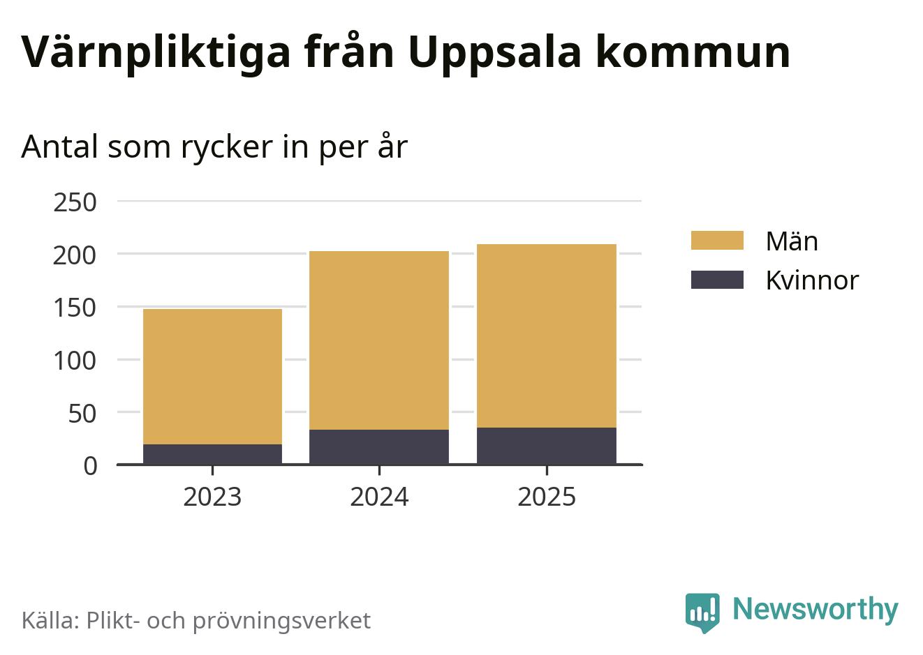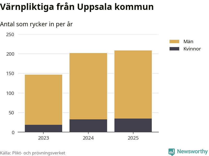 Sedan 2023 – som är det första året vi har jämförbara siffror för – har totalt 558 ungdomar från Uppsala kommun påbörjat sin värnplikt. Av dem har 87 varit kvinnor.
