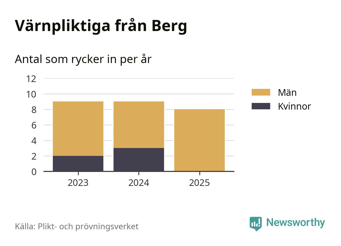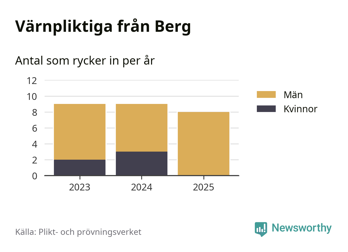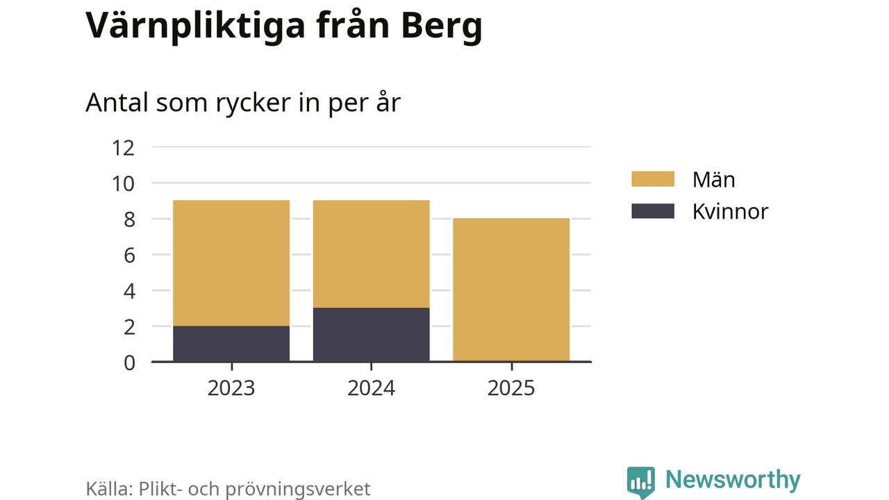 Sedan 2023 – som är det första året vi har jämförbara siffror för – har totalt 26 ungdomar från Berg påbörjat sin värnplikt. Av dem har fem varit kvinnor.