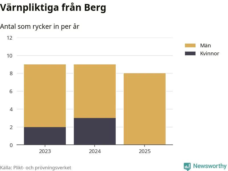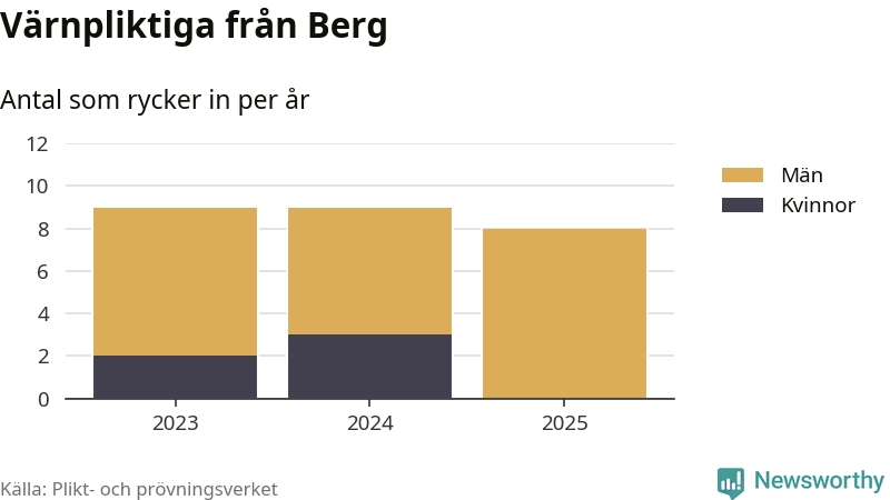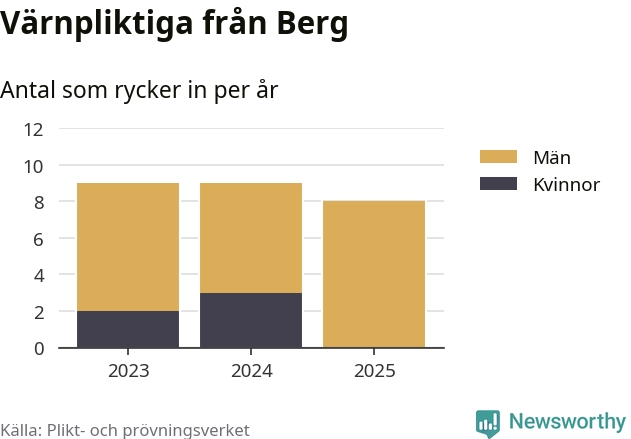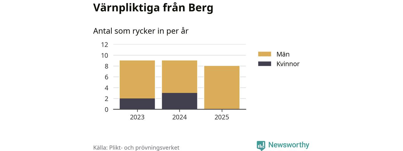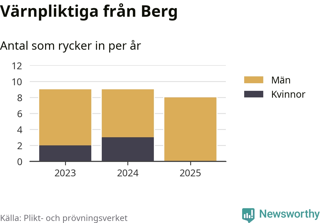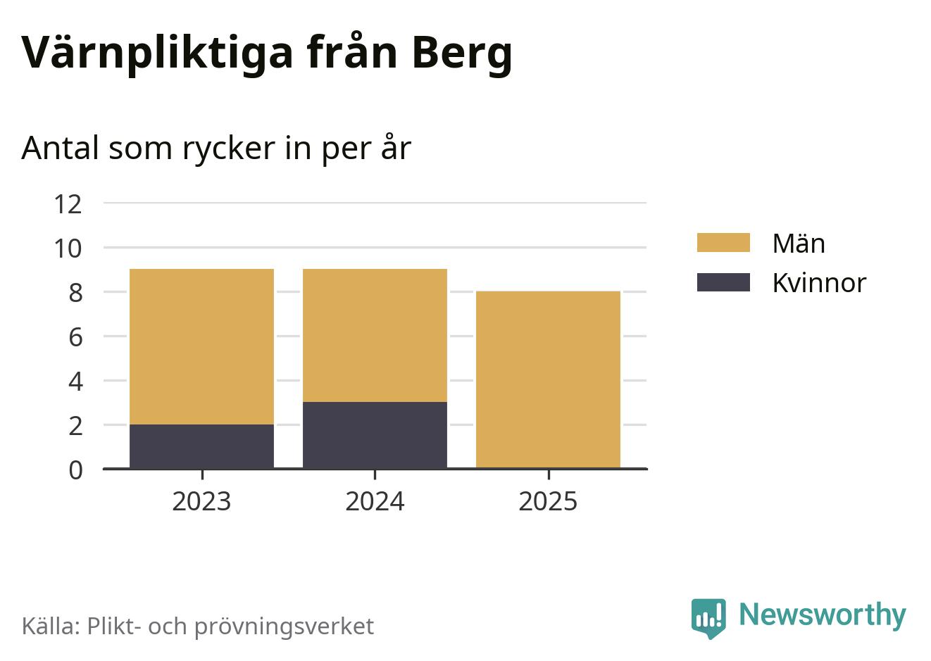Sedan 2023 – som är det första året vi har jämförbara siffror för – har totalt 26 ungdomar från Berg påbörjat sin värnplikt. Av dem har fem varit kvinnor.