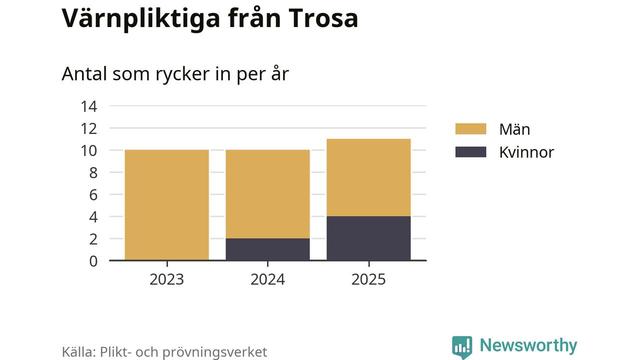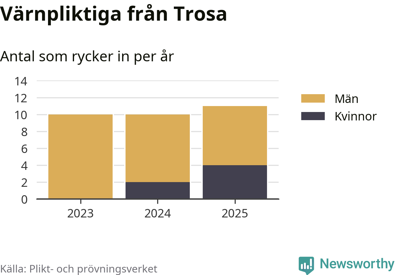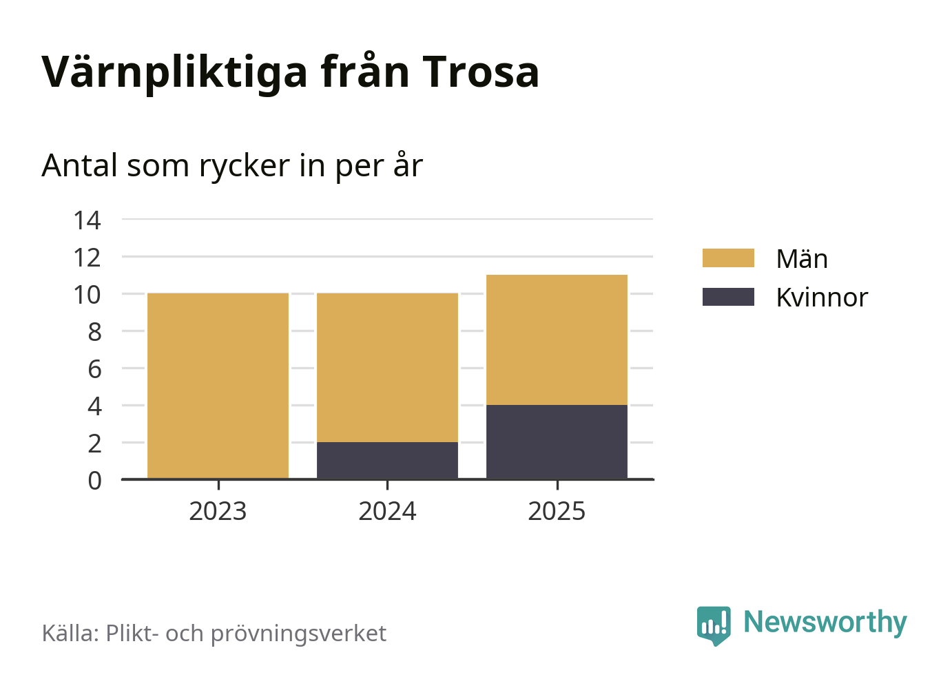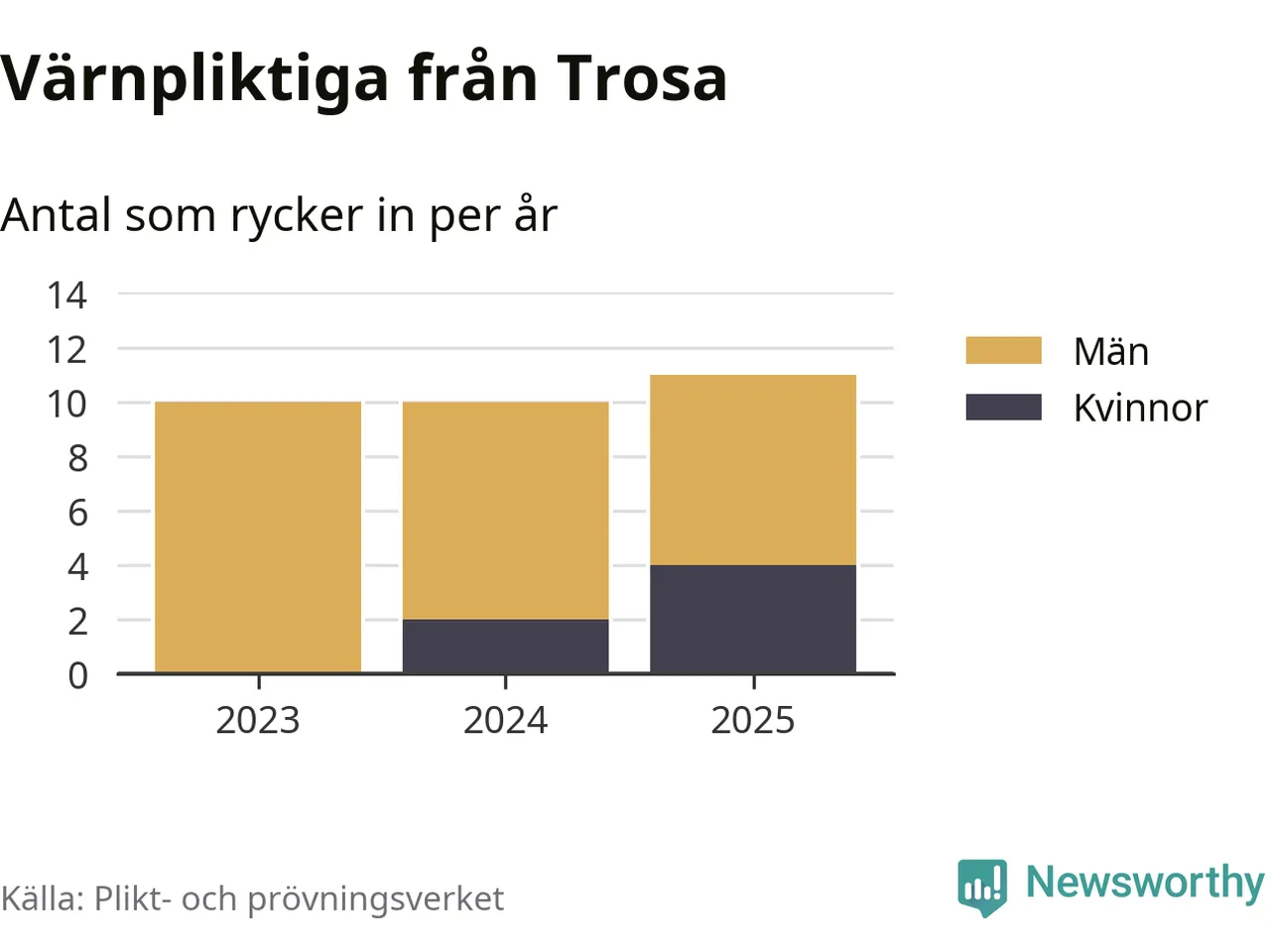 Sedan 2023 – som är det första året vi har jämförbara siffror för – har totalt 31 ungdomar från Trosa påbörjat sin värnplikt. Av dem har sex varit kvinnor.