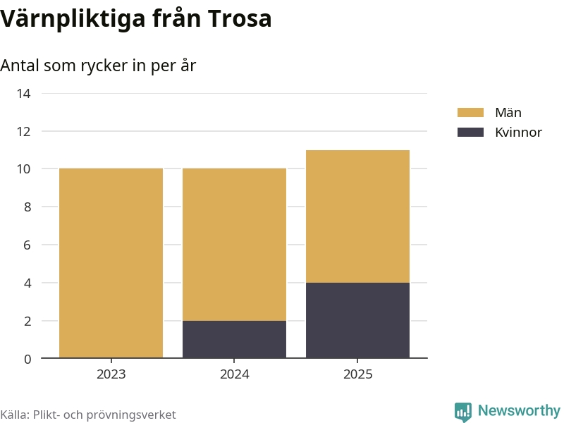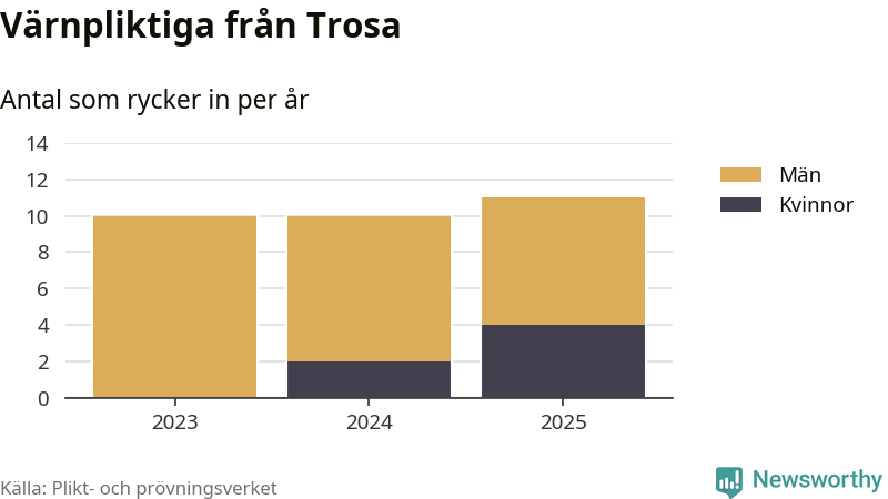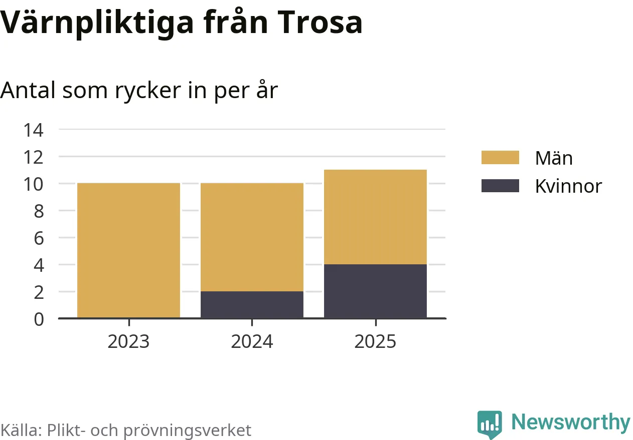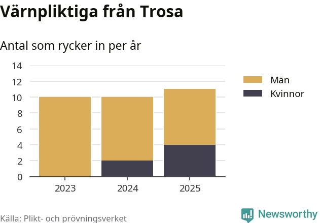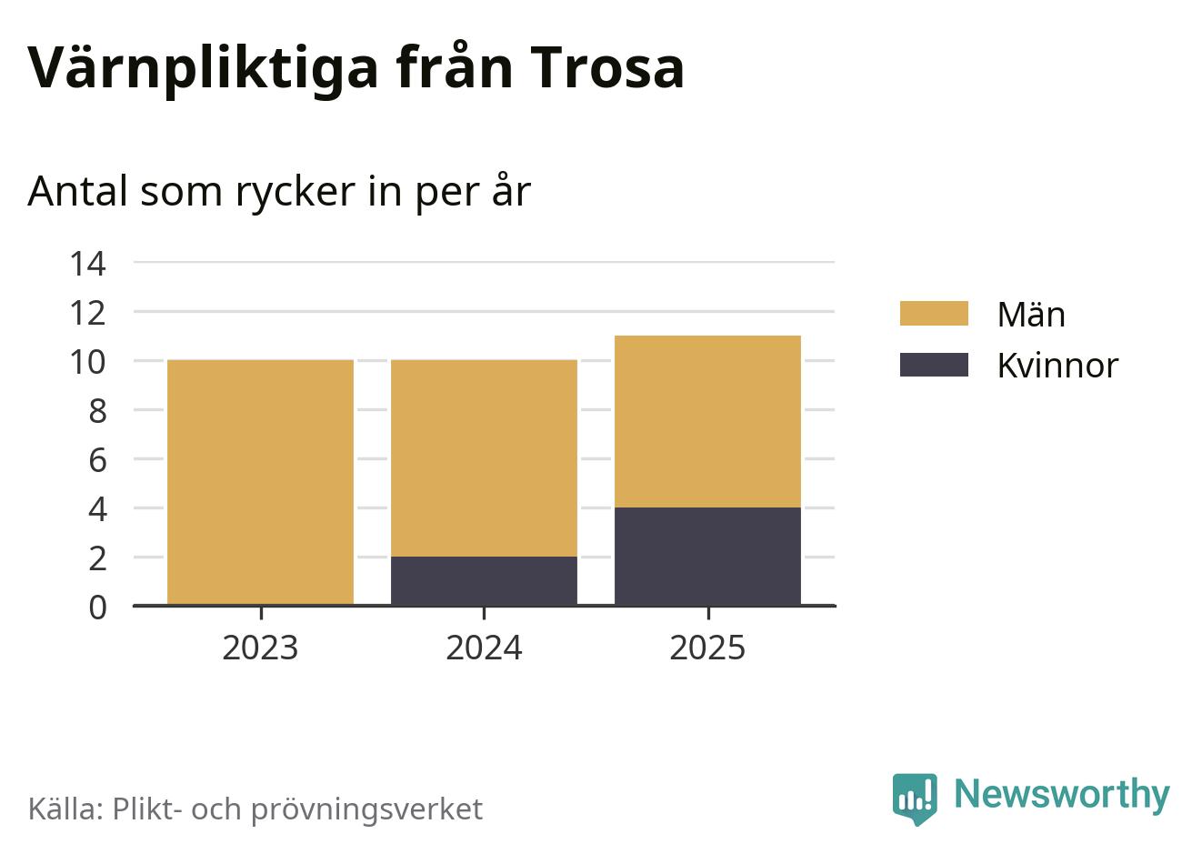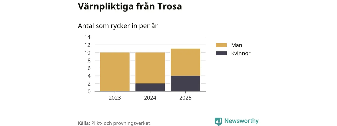 Sedan 2023 – som är det första året vi har jämförbara siffror för – har totalt 31 ungdomar från Trosa påbörjat sin värnplikt. Av dem har sex varit kvinnor.