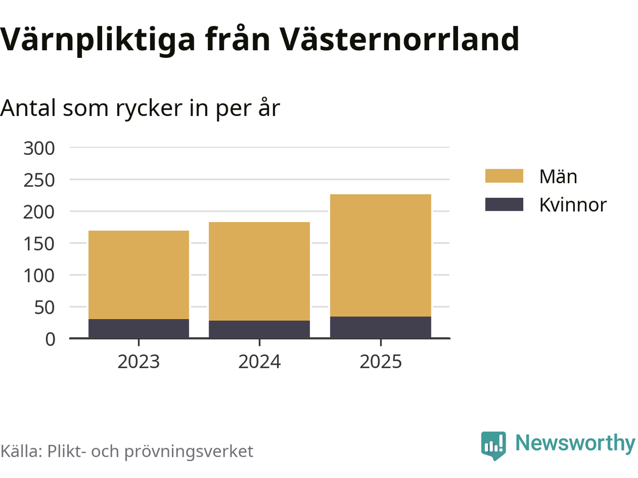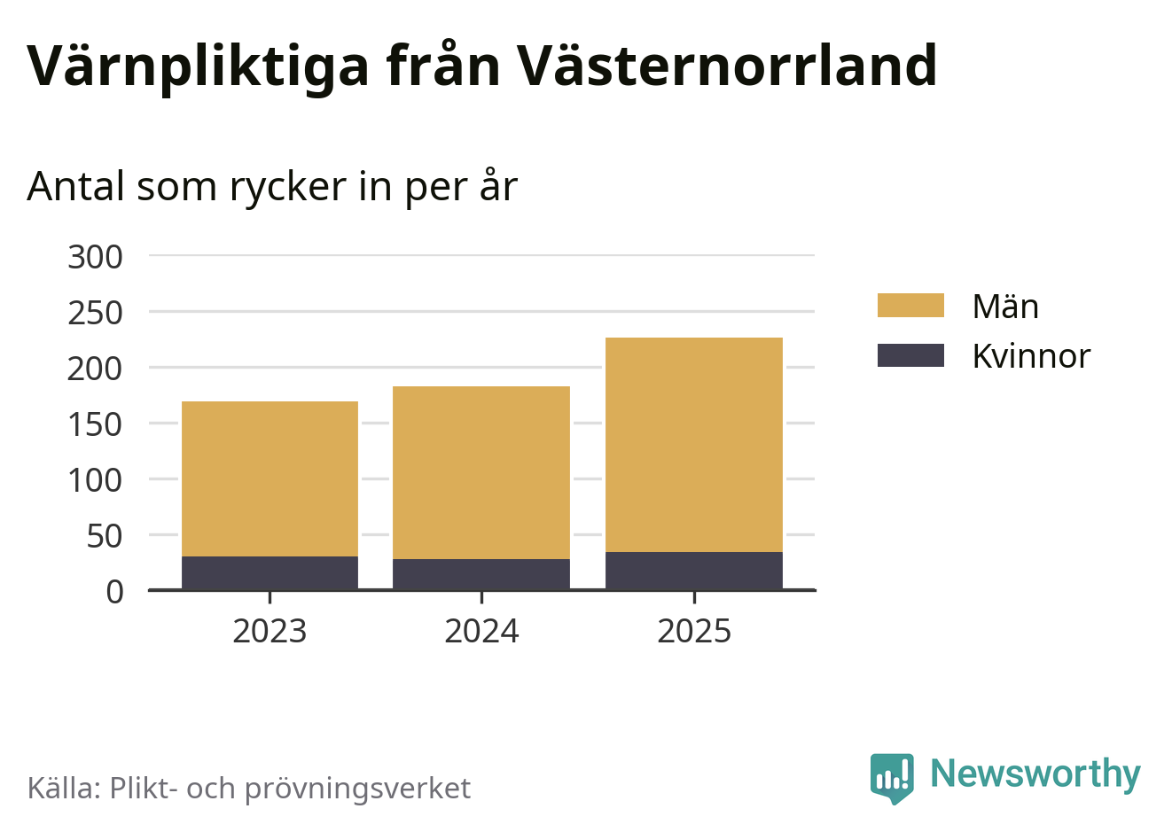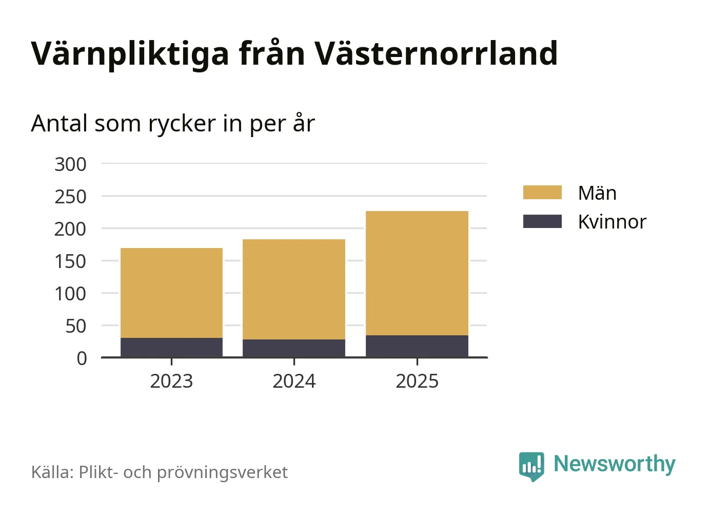 Sedan 2023 – som är det första året vi har jämförbara siffror för – har totalt 577 ungdomar från Västernorrland påbörjat sin värnplikt. Av dem har 92 varit kvinnor.