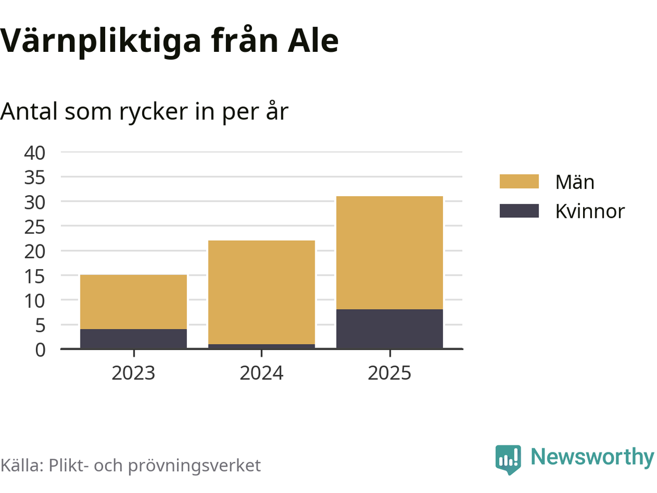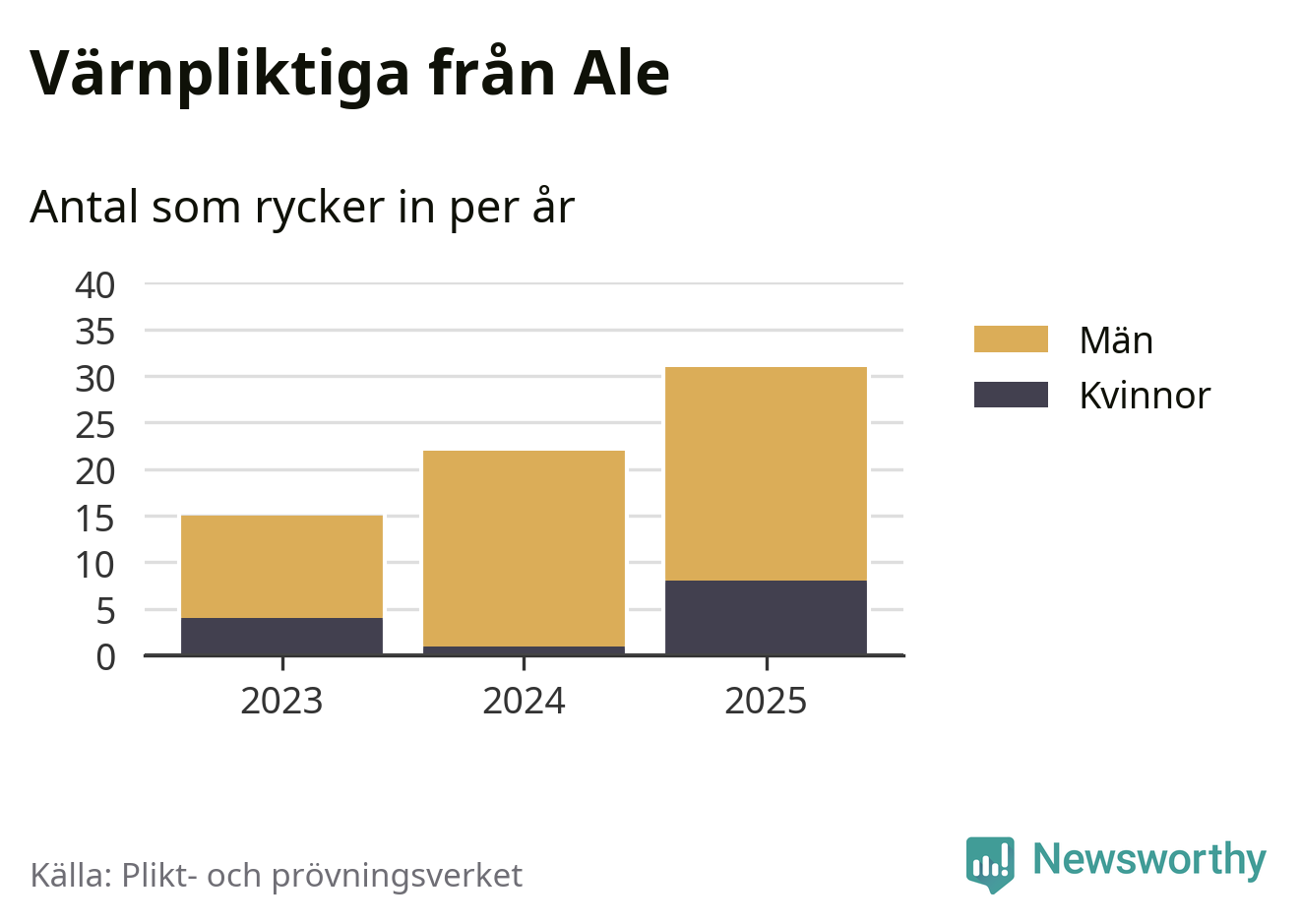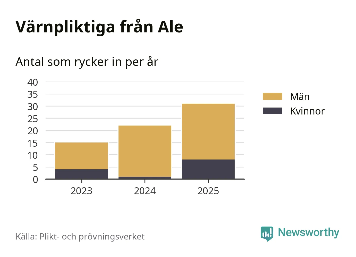 Sedan 2023 – som är det första året vi har jämförbara siffror för – har totalt 68 ungdomar från Ale påbörjat sin värnplikt. Av dem har 13 varit kvinnor.
