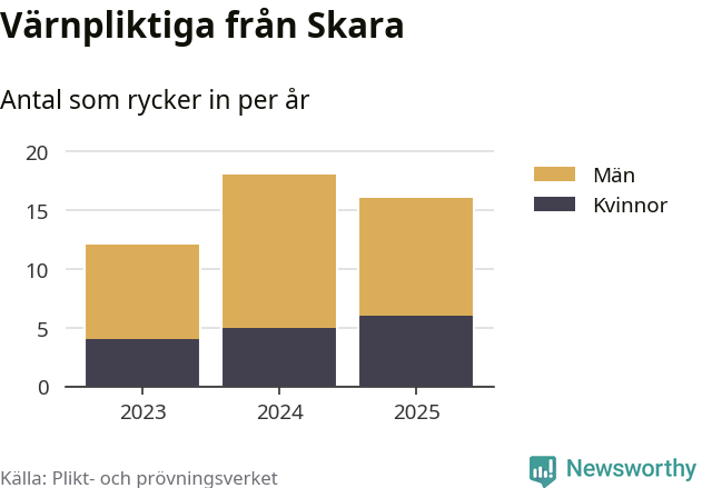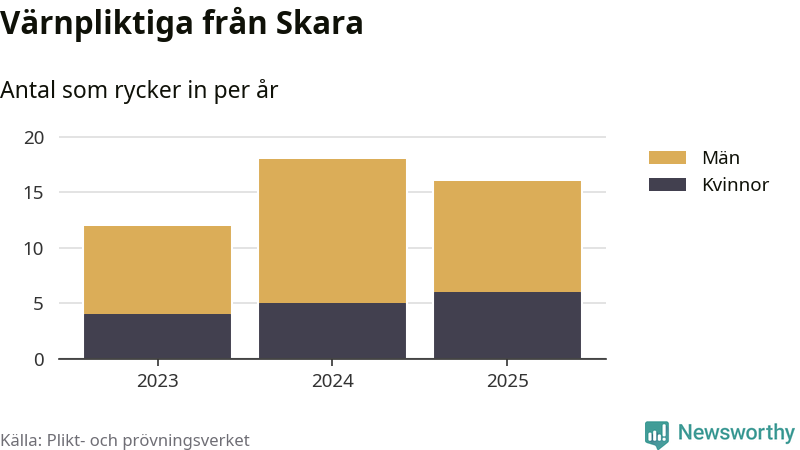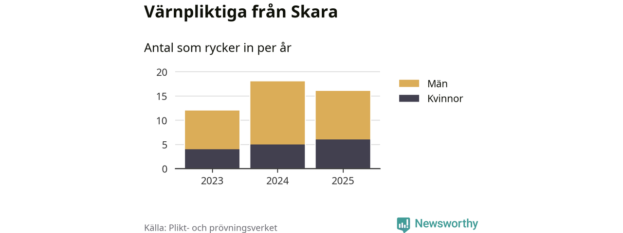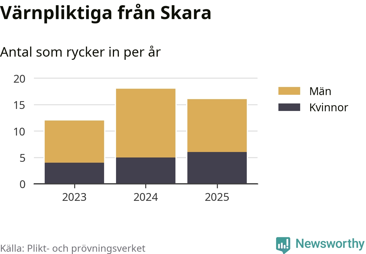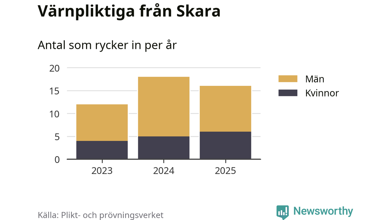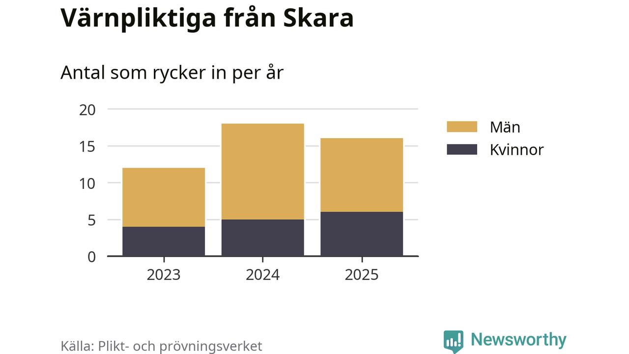 Sedan 2023 – som är det första året vi har jämförbara siffror för – har totalt 46 ungdomar från Skara påbörjat sin värnplikt. Av dem har 15 varit kvinnor.