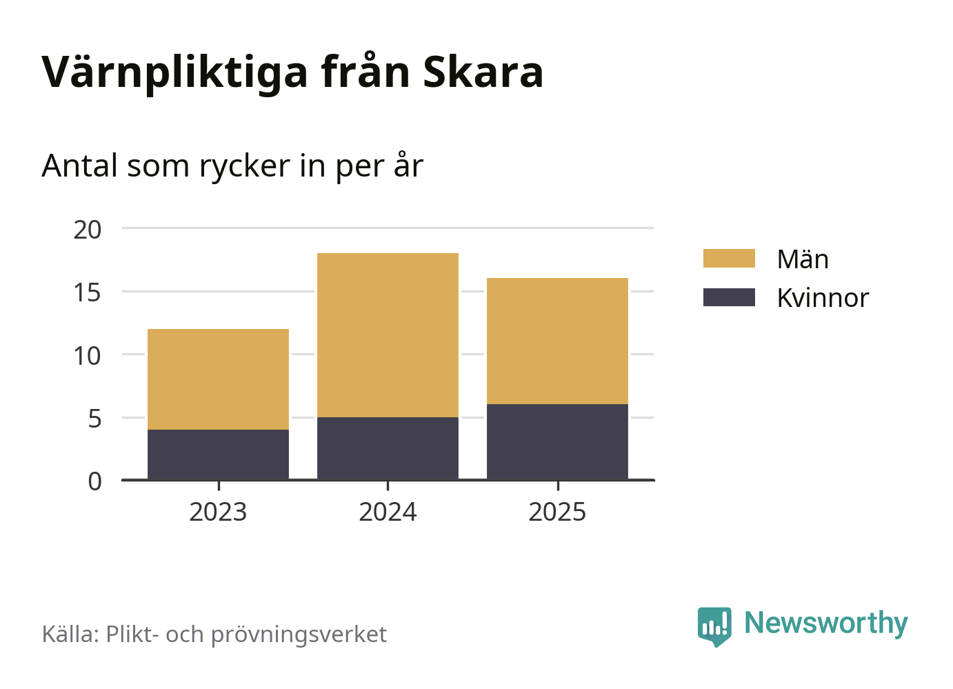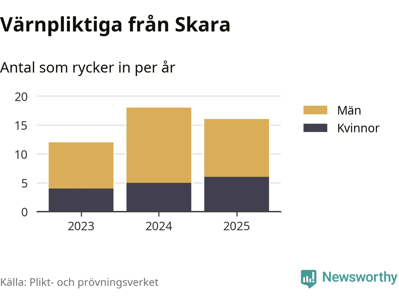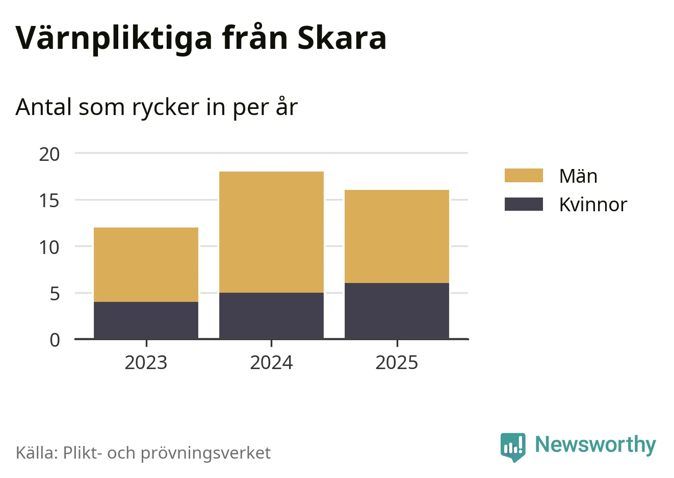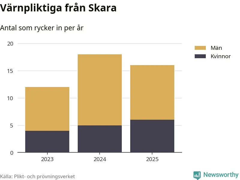 Sedan 2023 – som är det första året vi har jämförbara siffror för – har totalt 46 ungdomar från Skara påbörjat sin värnplikt. Av dem har 15 varit kvinnor.