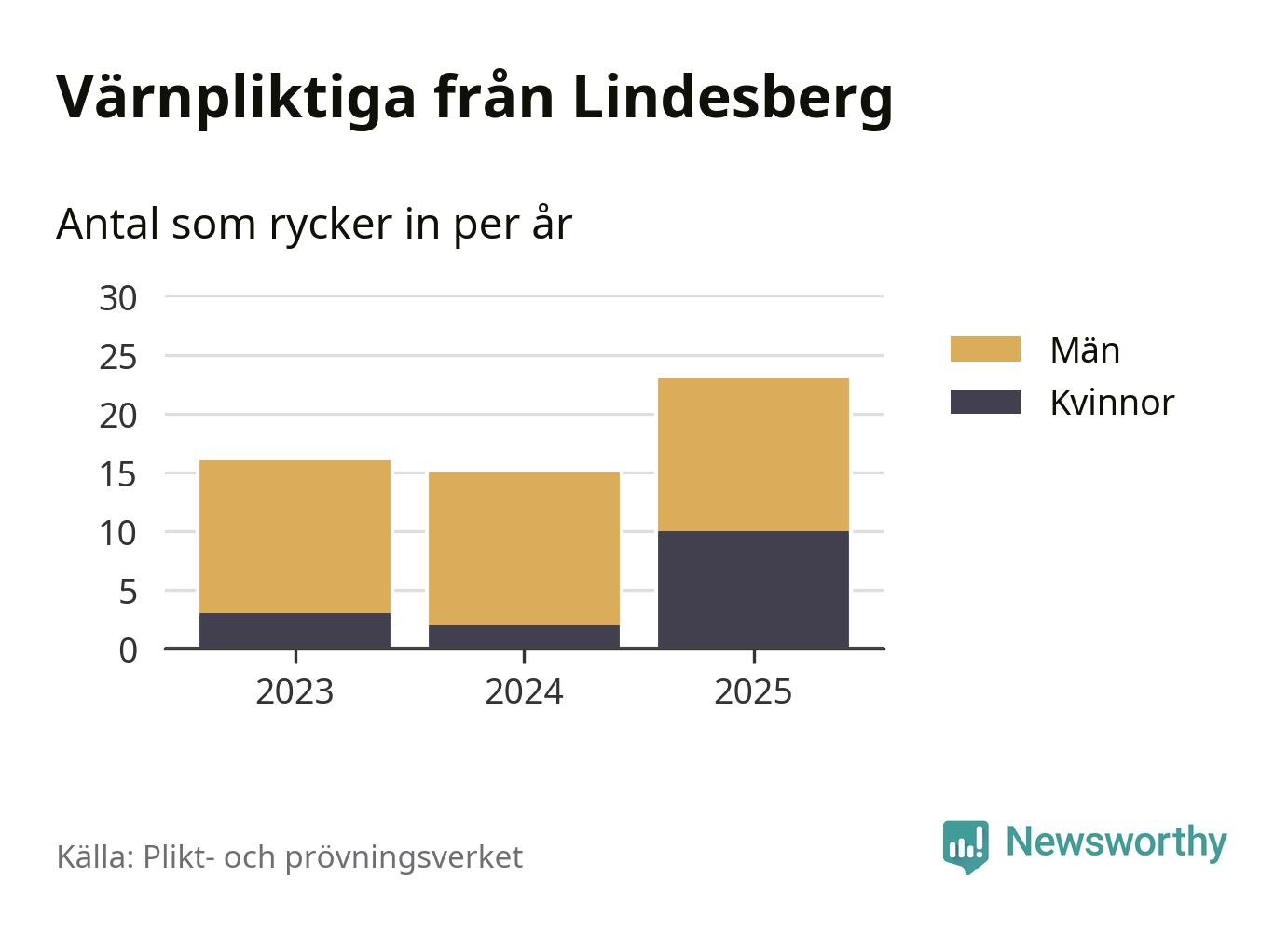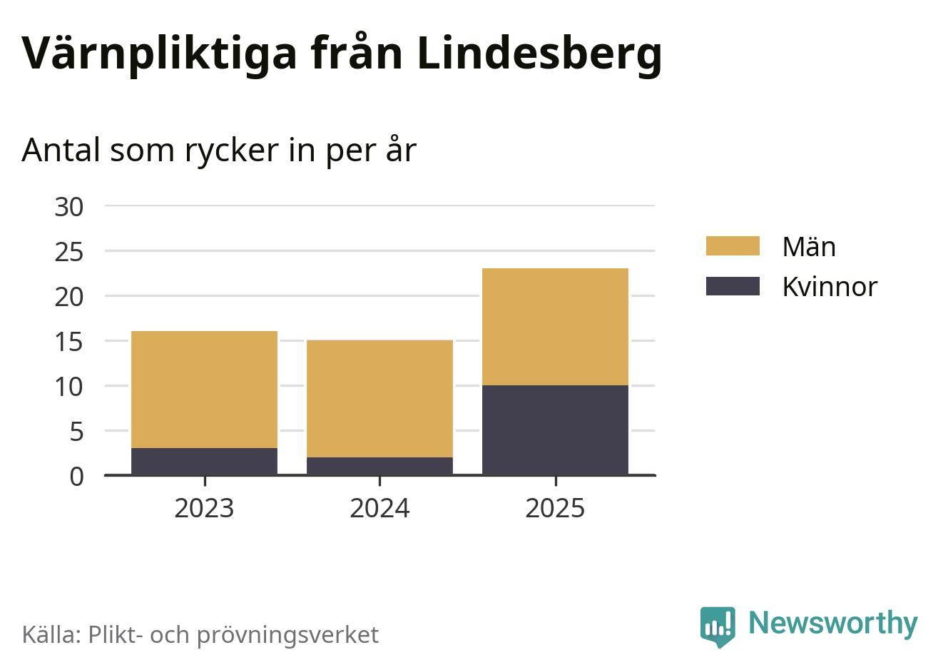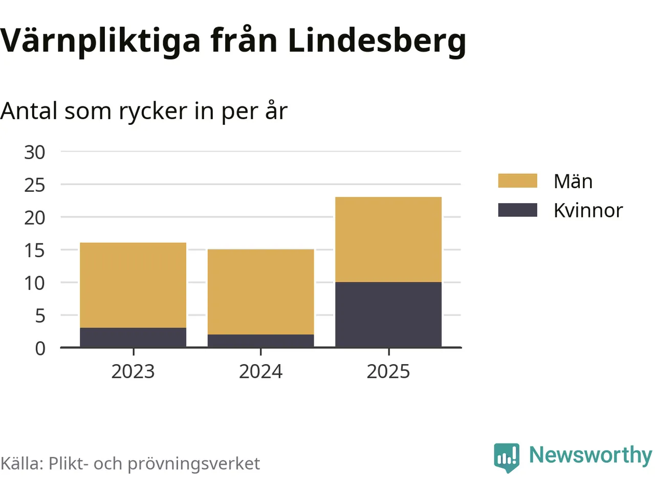 Sedan 2023 – som är det första året vi har jämförbara siffror för – har totalt 54 ungdomar från Lindesberg påbörjat sin värnplikt. Av dem har 15 varit kvinnor.