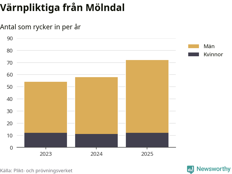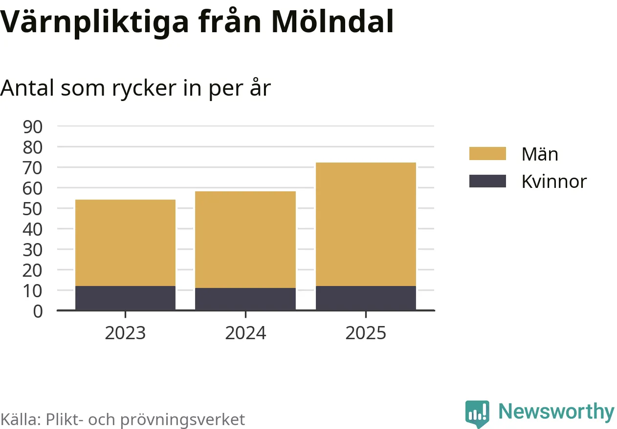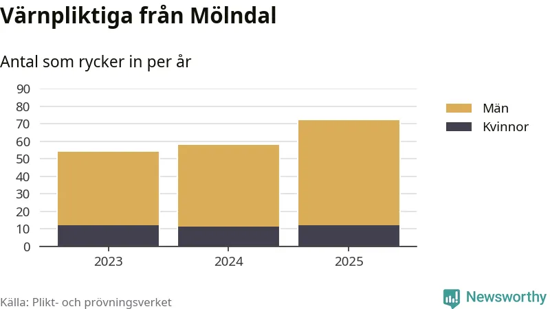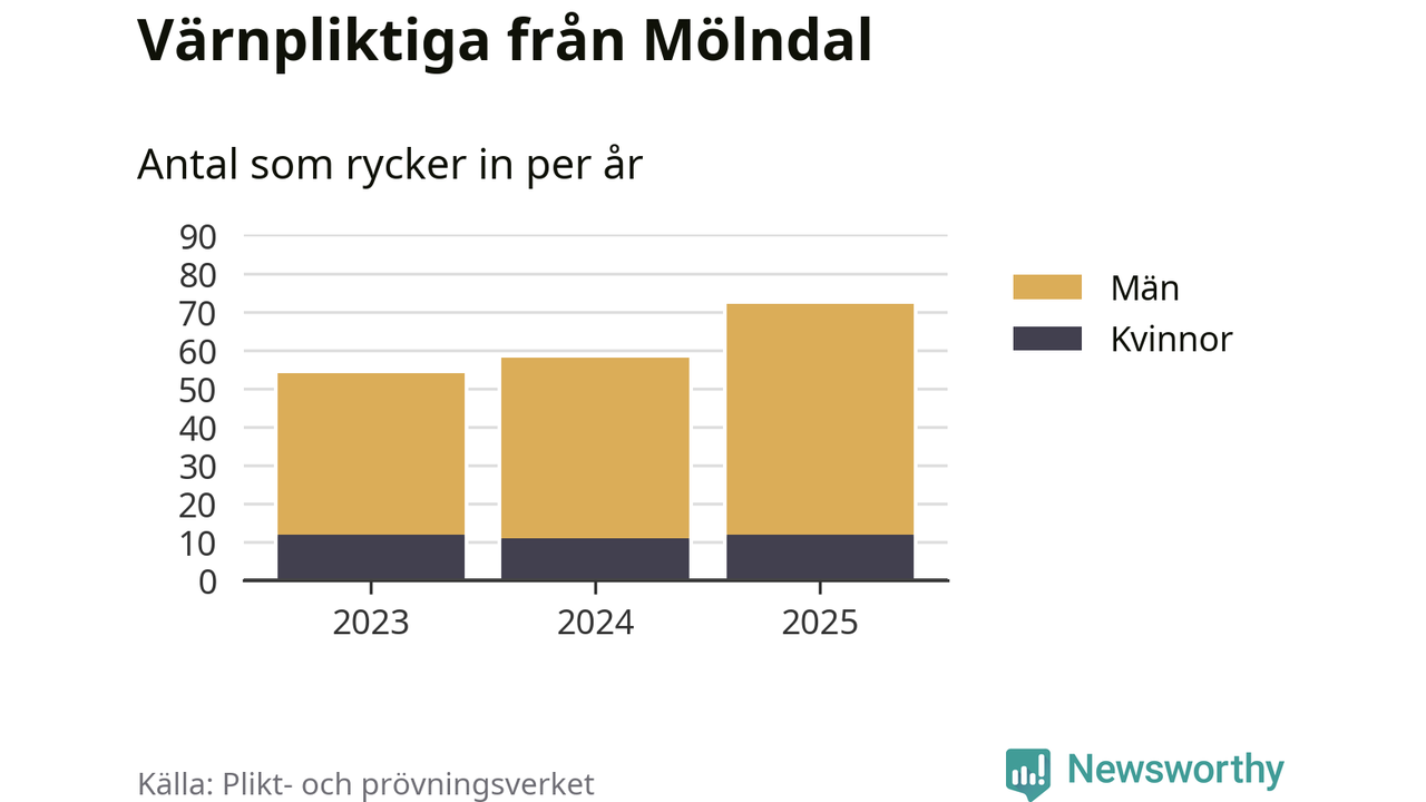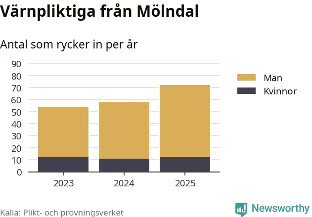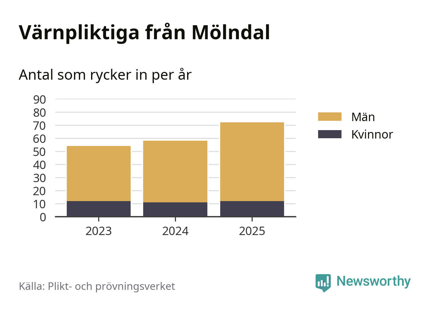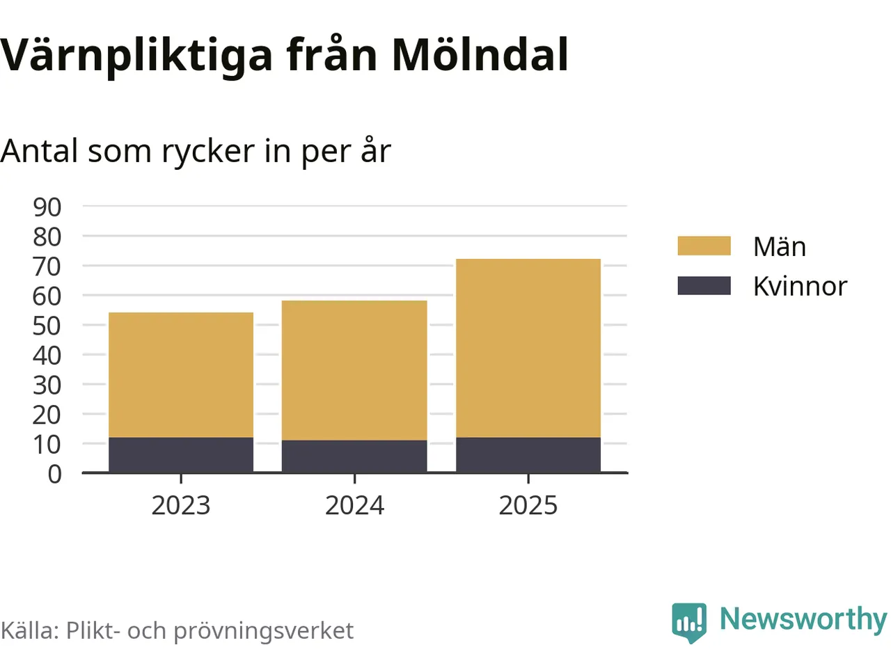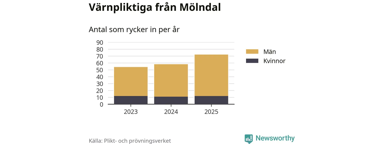 Sedan 2023 – som är det första året vi har jämförbara siffror för – har totalt 184 ungdomar från Mölndal påbörjat sin värnplikt. Av dem har 35 varit kvinnor.