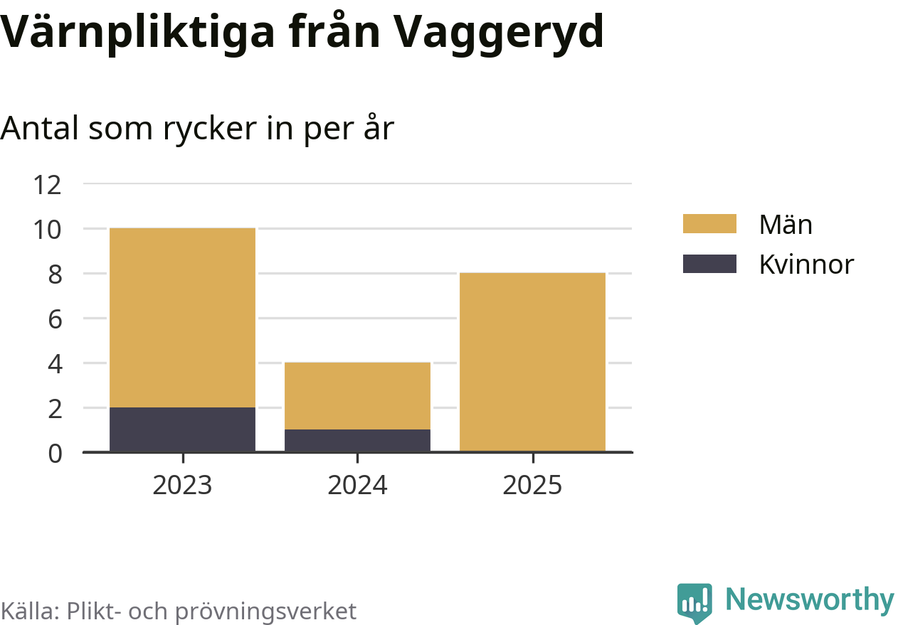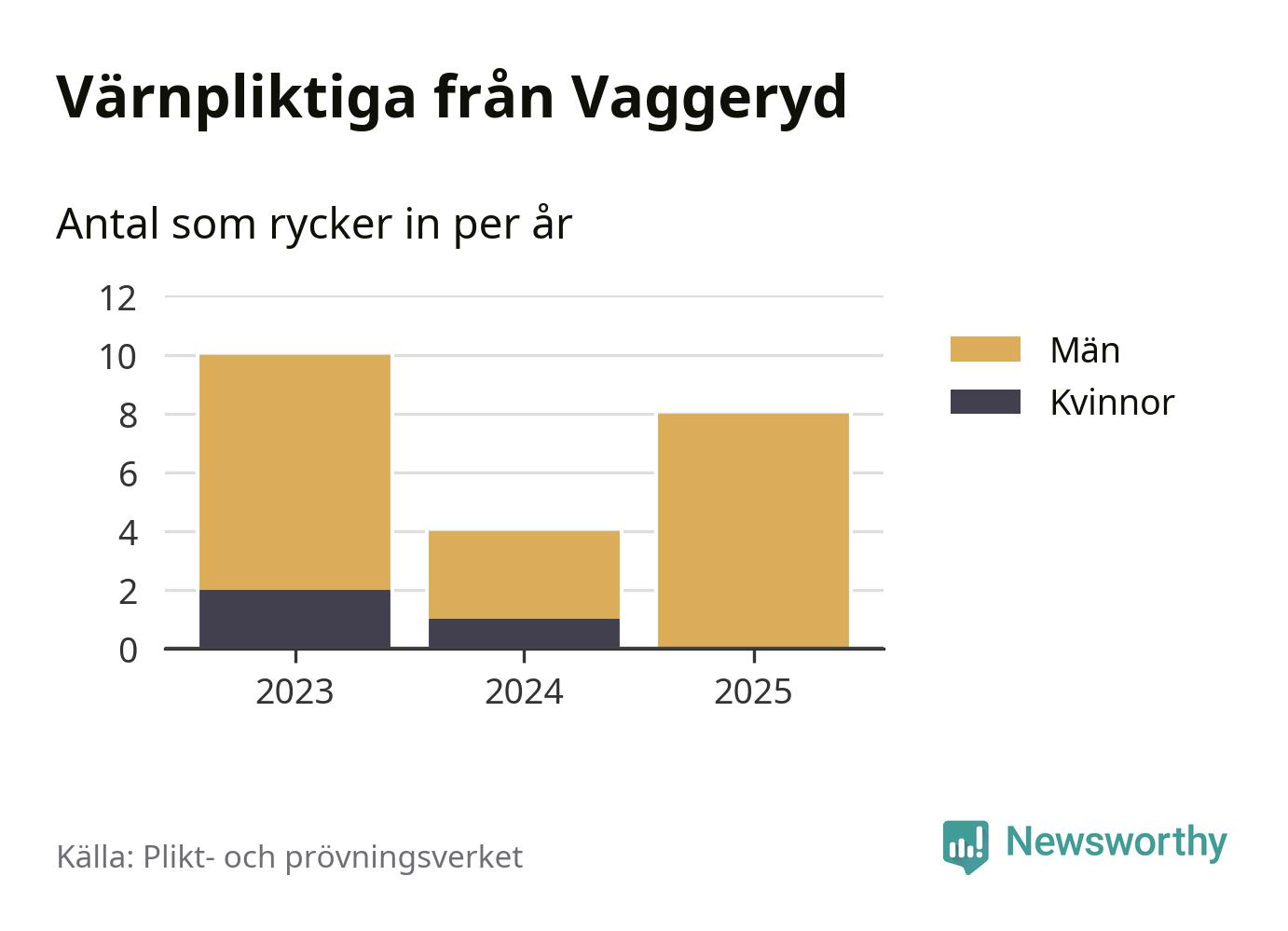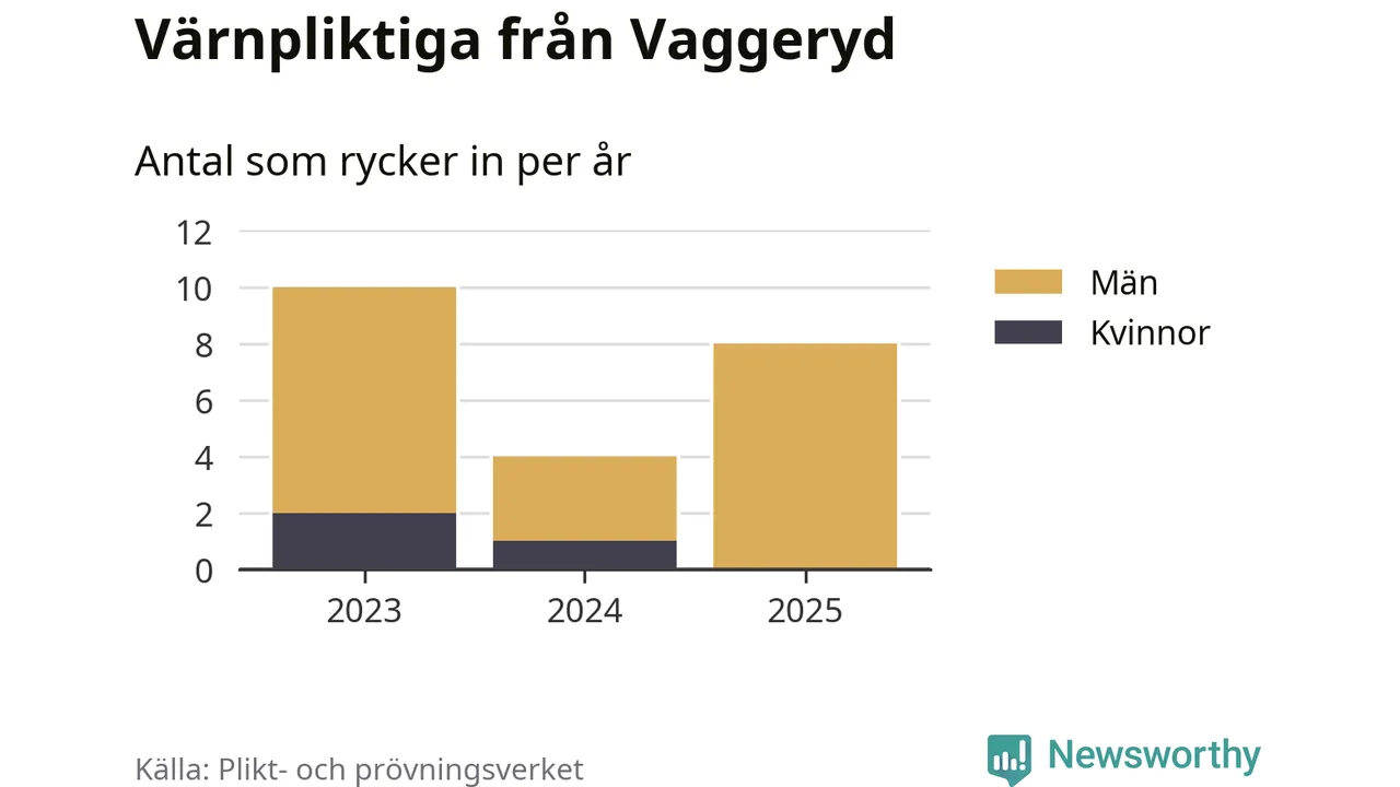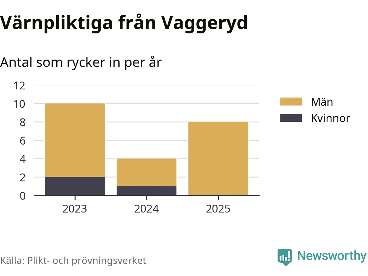 Sedan 2023 – som är det första året vi har jämförbara siffror för – har totalt 22 ungdomar från Vaggeryd påbörjat sin värnplikt. Av dem har tre varit kvinnor.