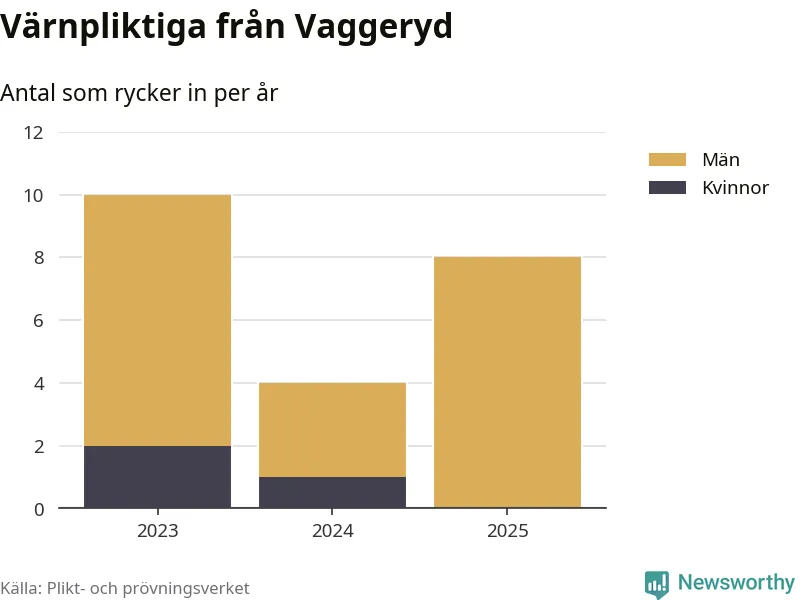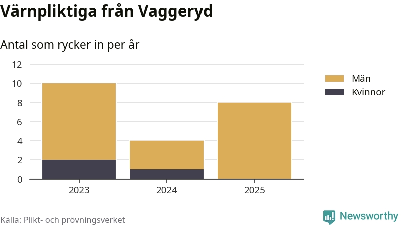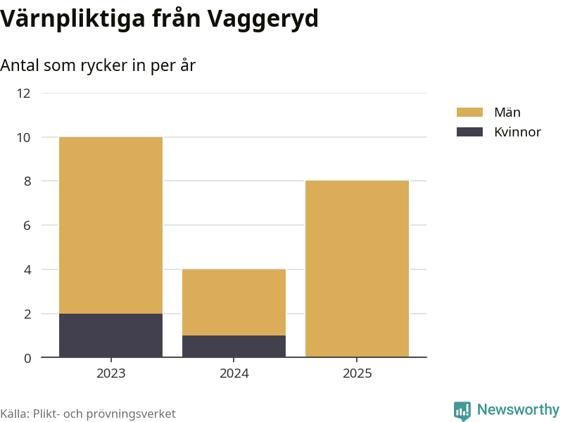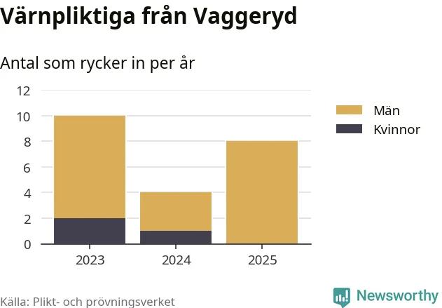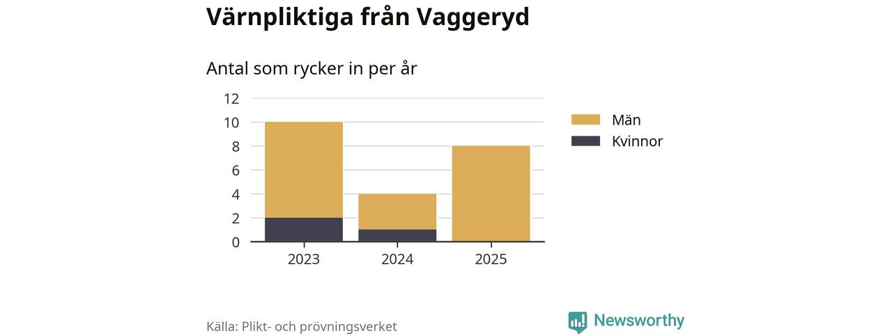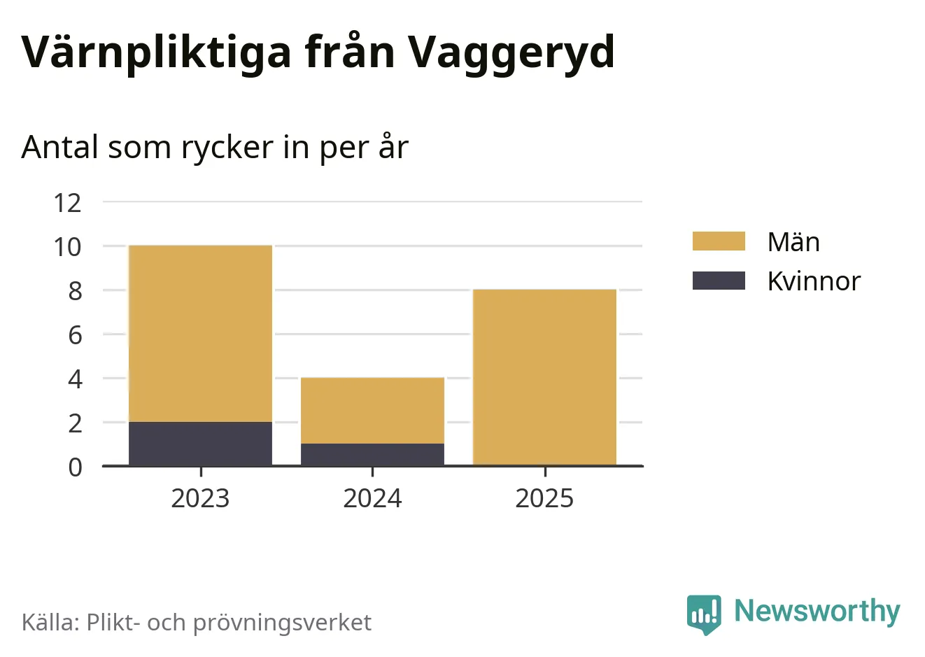 Sedan 2023 – som är det första året vi har jämförbara siffror för – har totalt 22 ungdomar från Vaggeryd påbörjat sin värnplikt. Av dem har tre varit kvinnor.