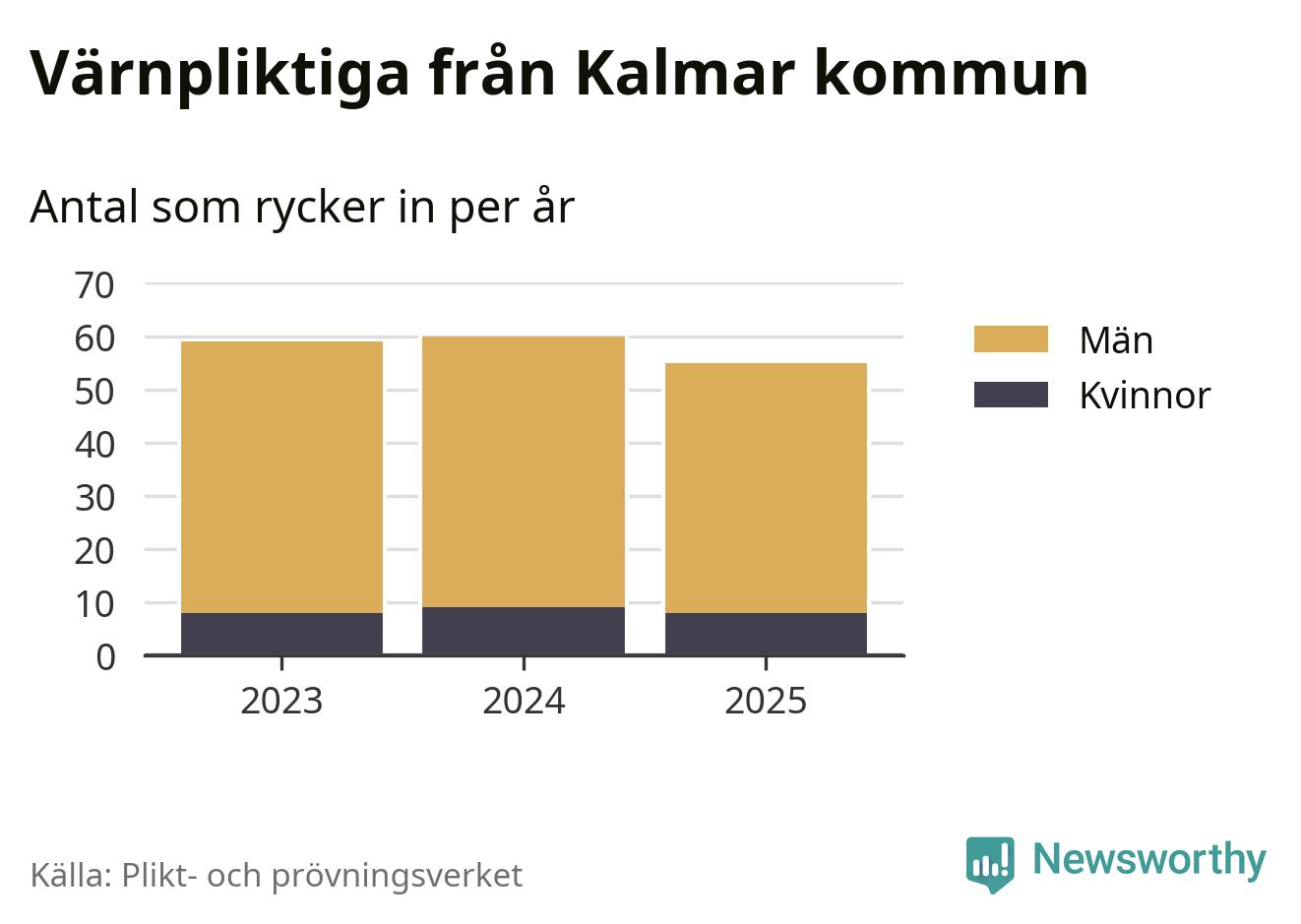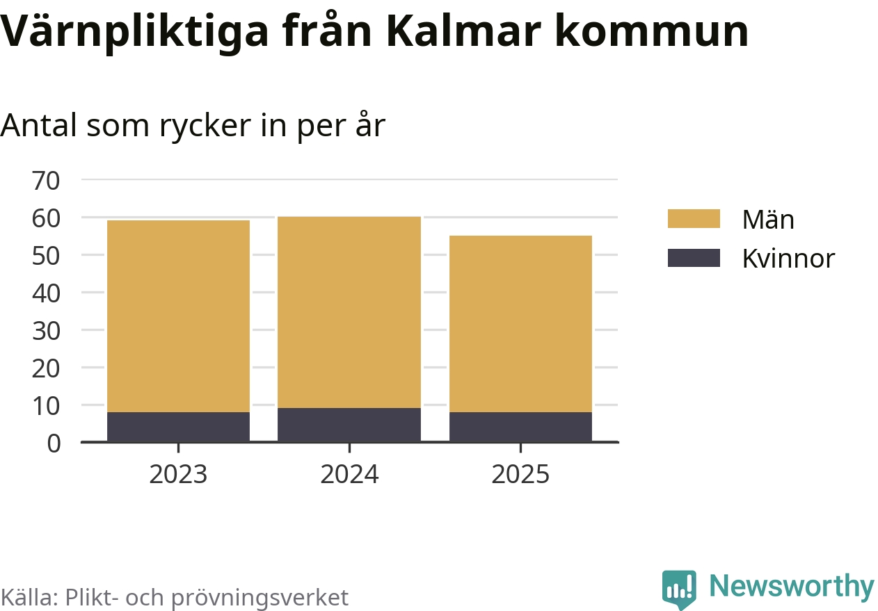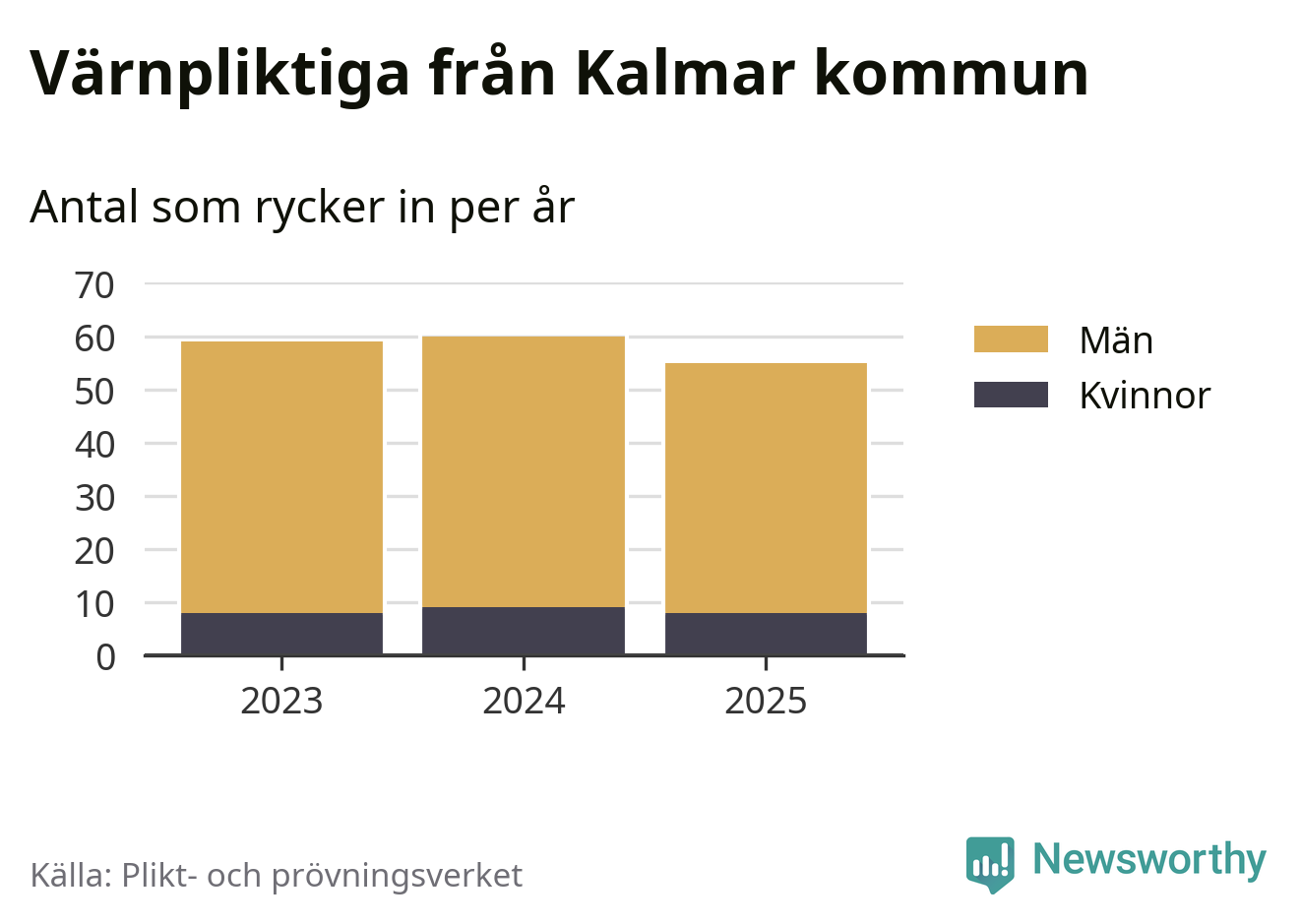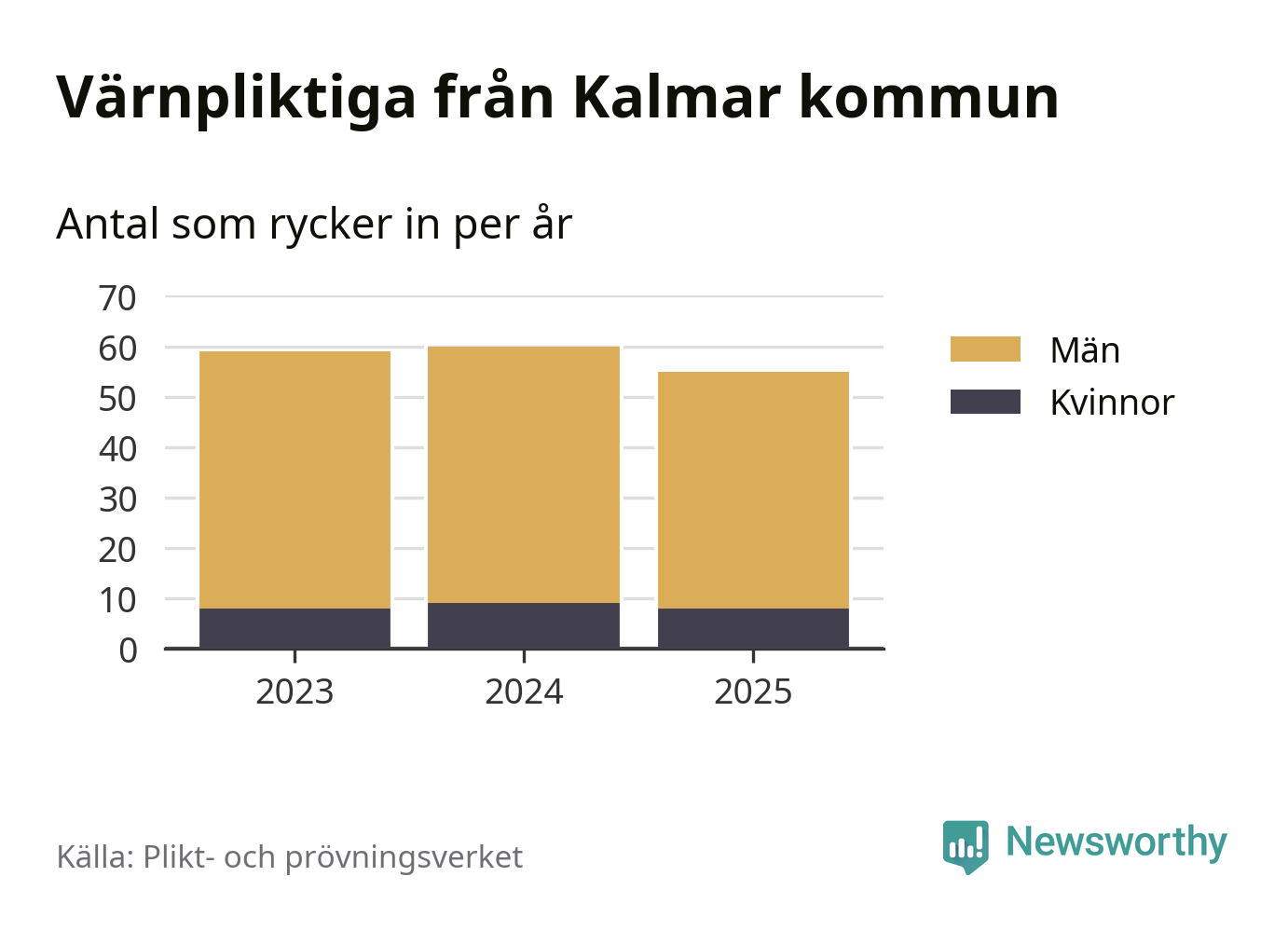 Sedan 2023 – som är det första året vi har jämförbara siffror för – har totalt 174 ungdomar från Kalmar kommun påbörjat sin värnplikt. Av dem har 25 varit kvinnor.