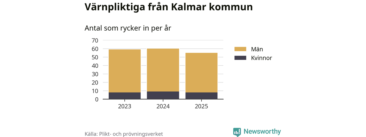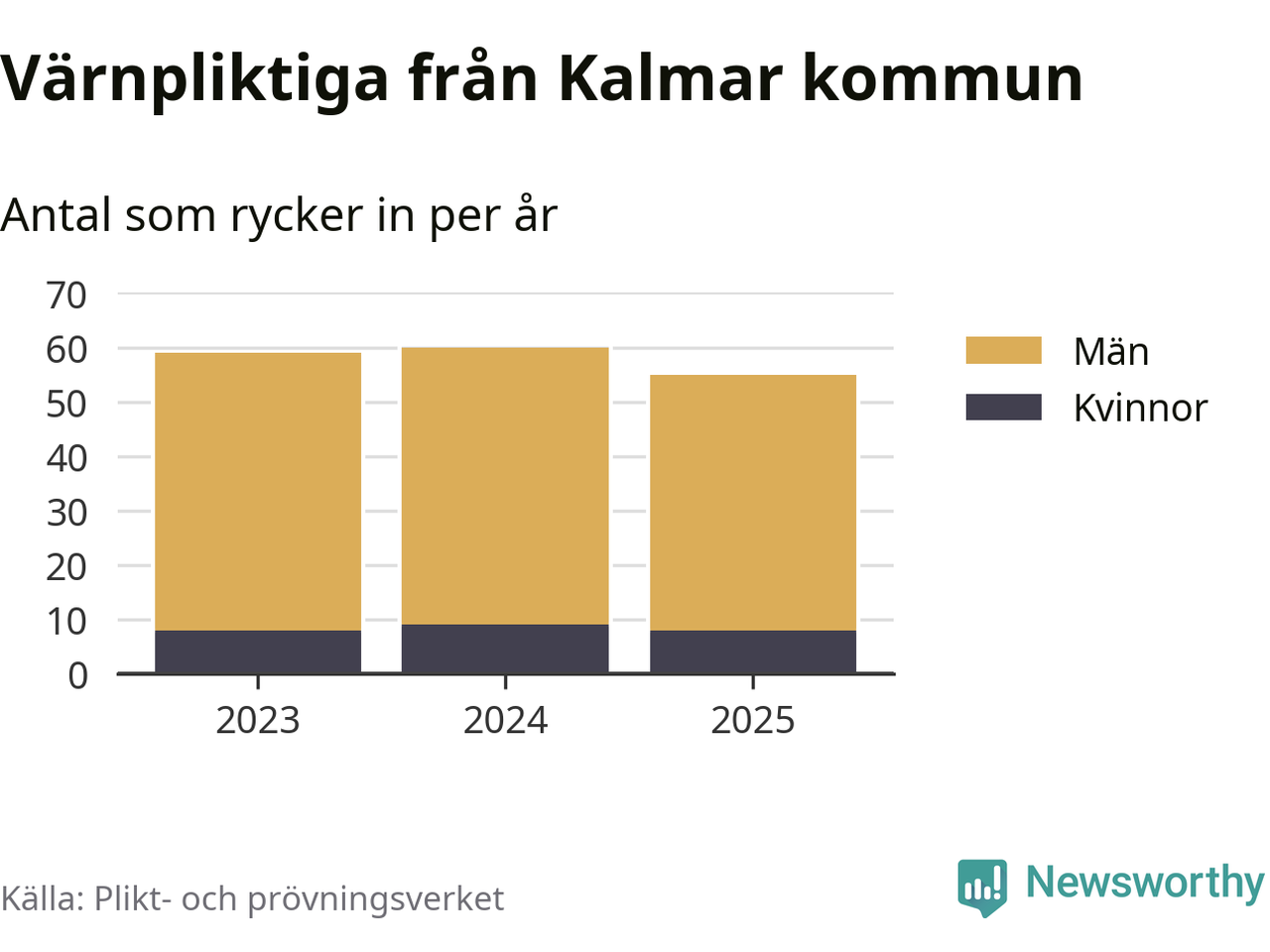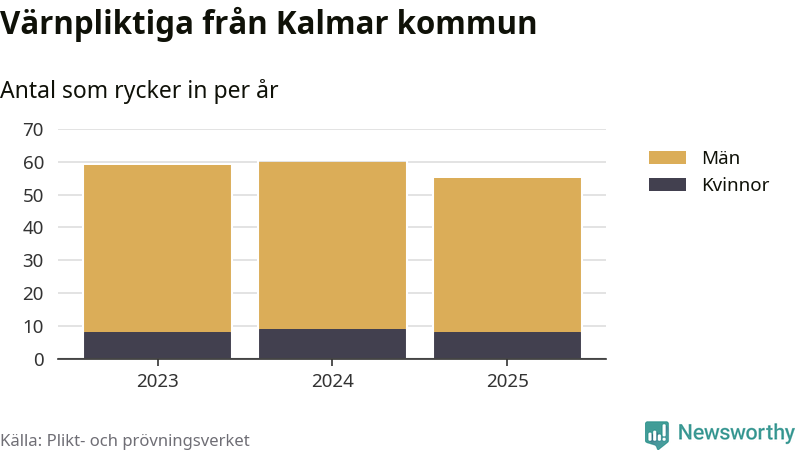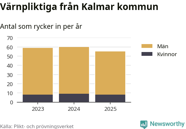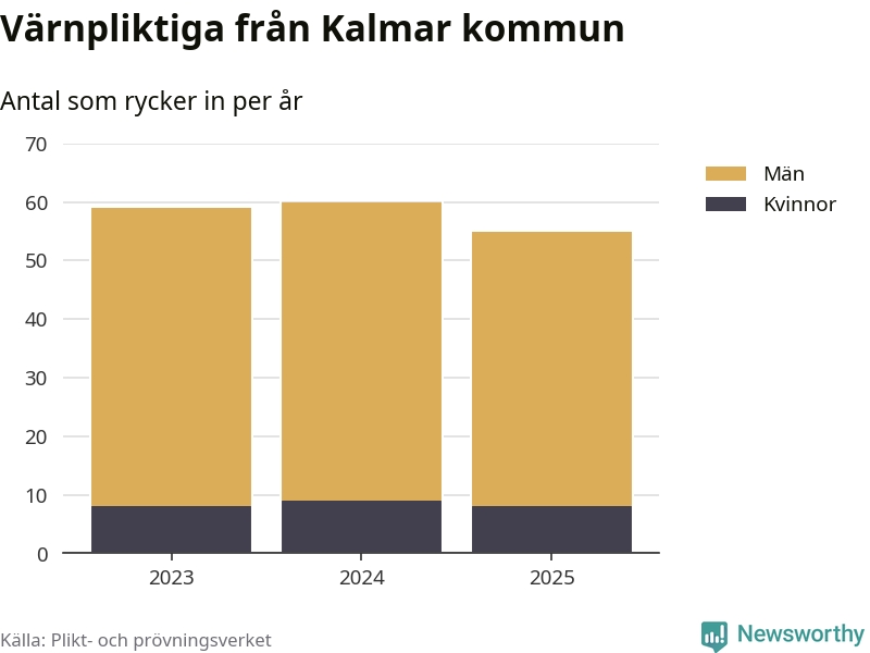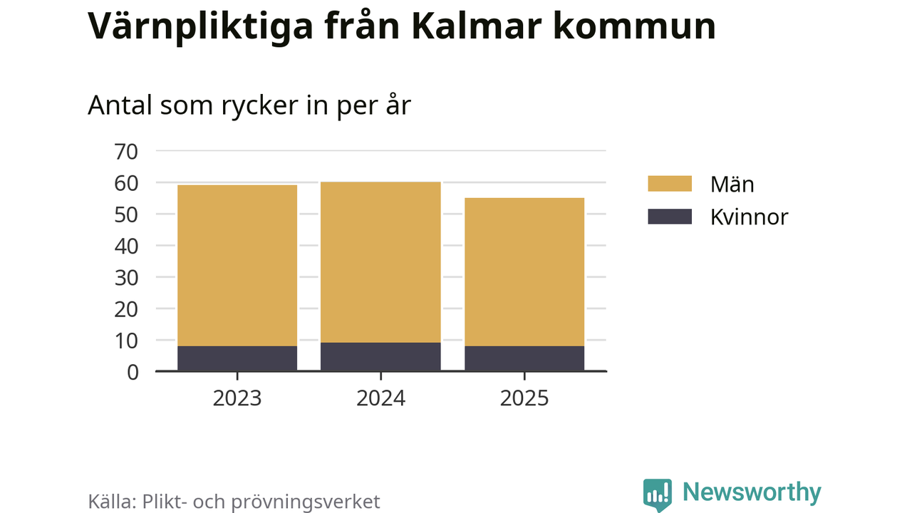 Sedan 2023 – som är det första året vi har jämförbara siffror för – har totalt 174 ungdomar från Kalmar kommun påbörjat sin värnplikt. Av dem har 25 varit kvinnor.
