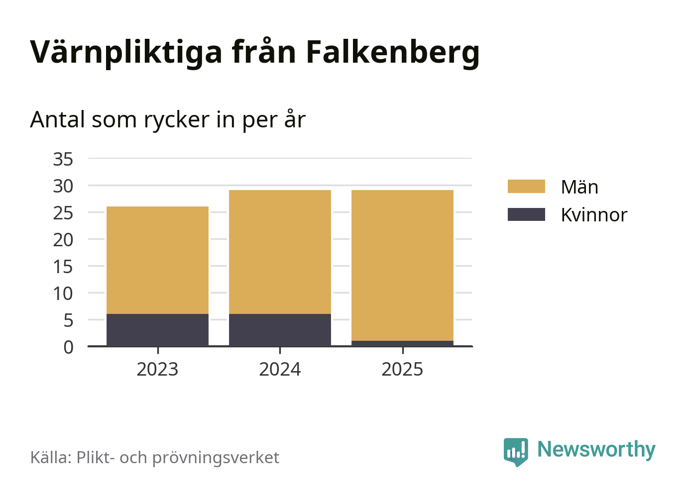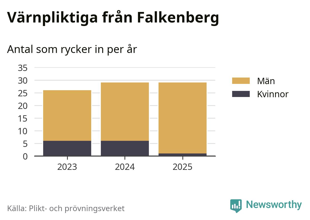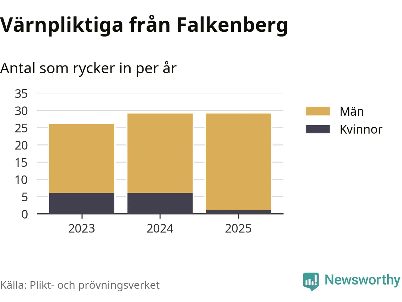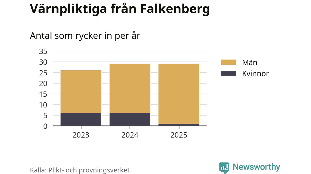 Sedan 2023 – som är det första året vi har jämförbara siffror för – har totalt 84 ungdomar från Falkenberg påbörjat sin värnplikt. Av dem har 13 varit kvinnor.