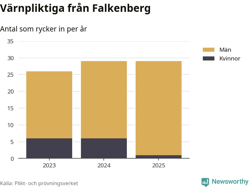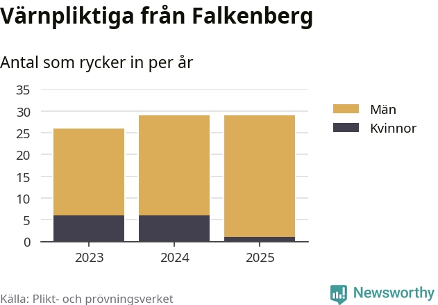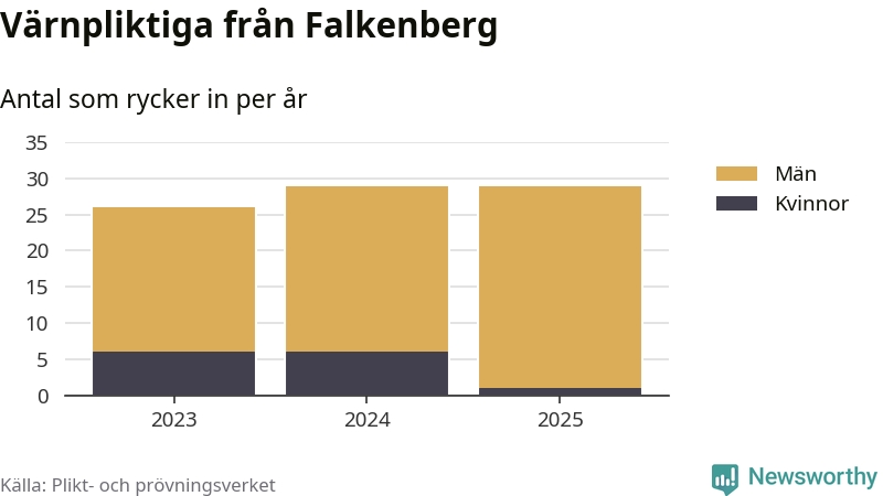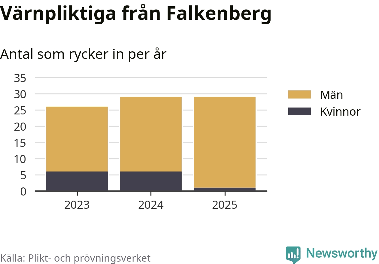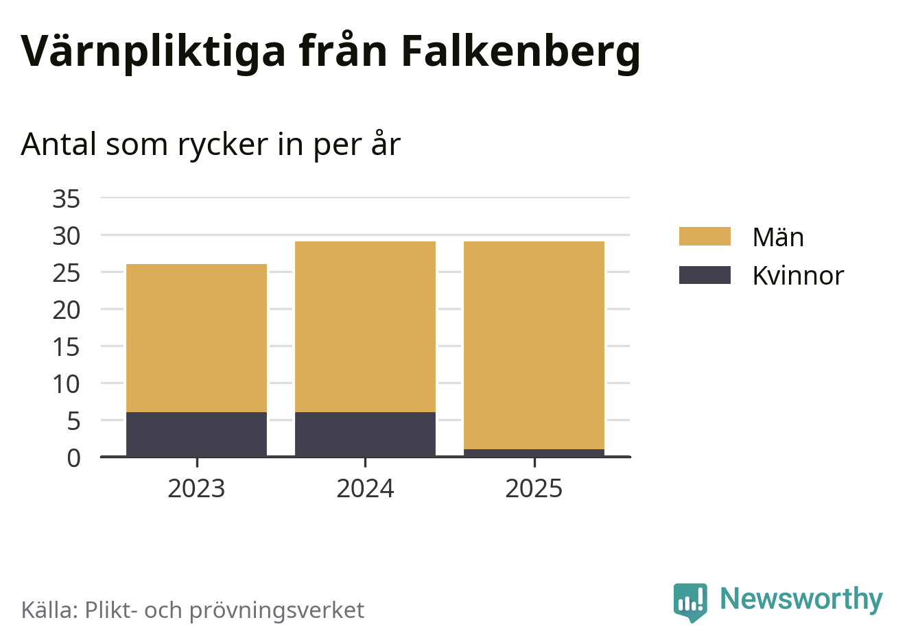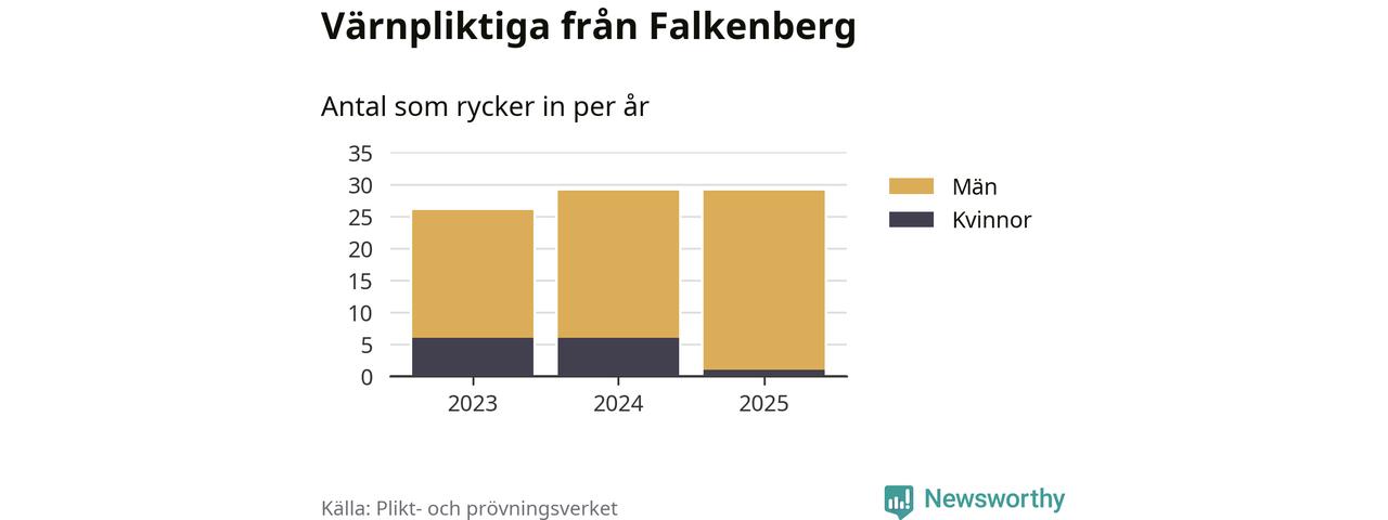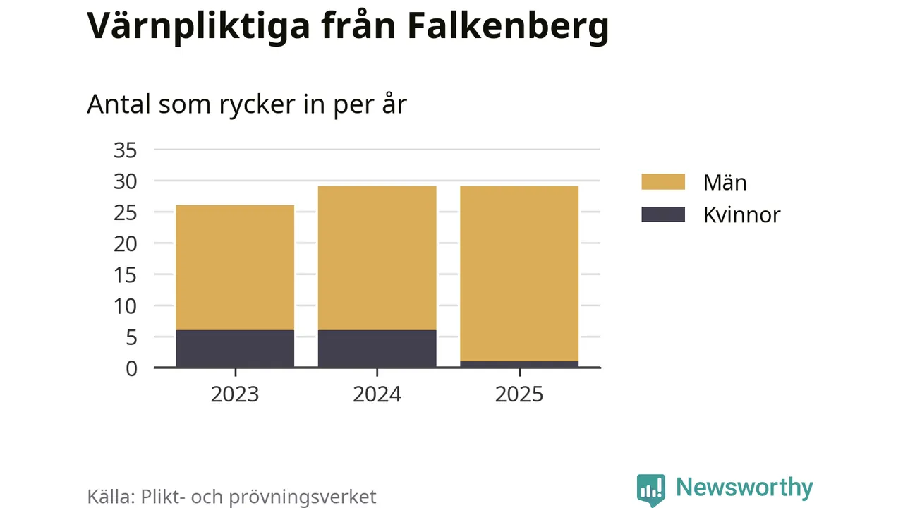 Sedan 2023 – som är det första året vi har jämförbara siffror för – har totalt 84 ungdomar från Falkenberg påbörjat sin värnplikt. Av dem har 13 varit kvinnor.