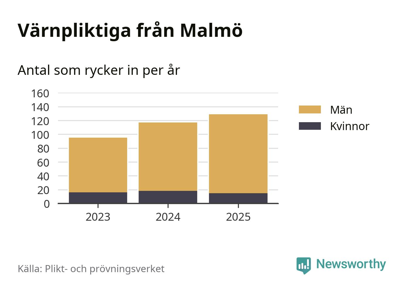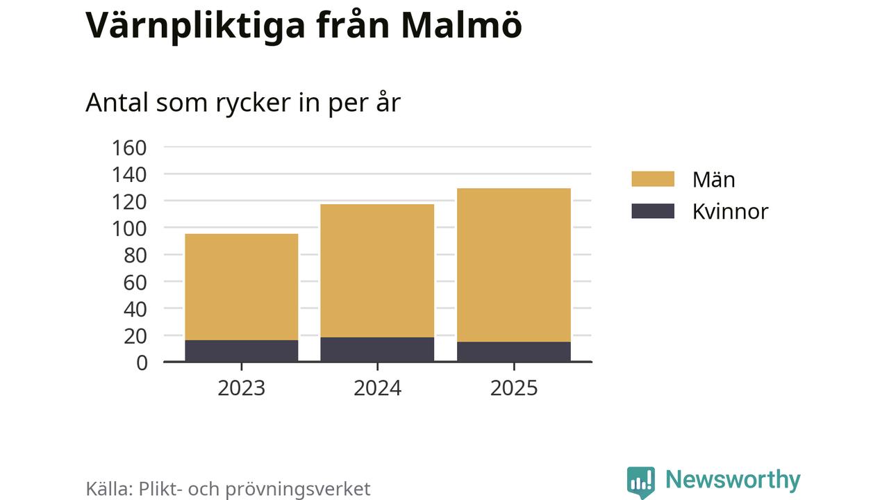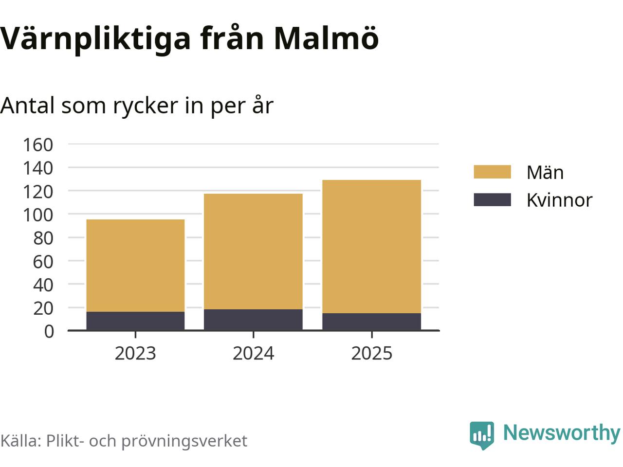 Sedan 2023 – som är det första året vi har jämförbara siffror för – har totalt 341 ungdomar från Malmö påbörjat sin värnplikt. Av dem har 49 varit kvinnor.
