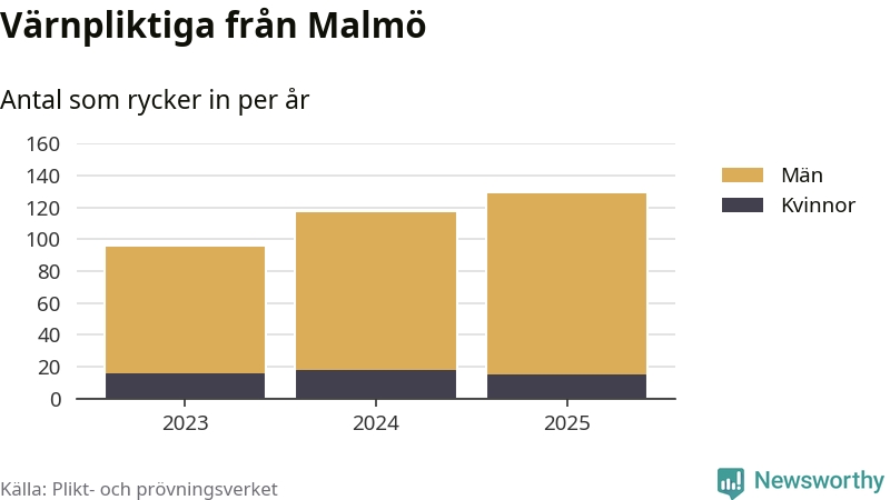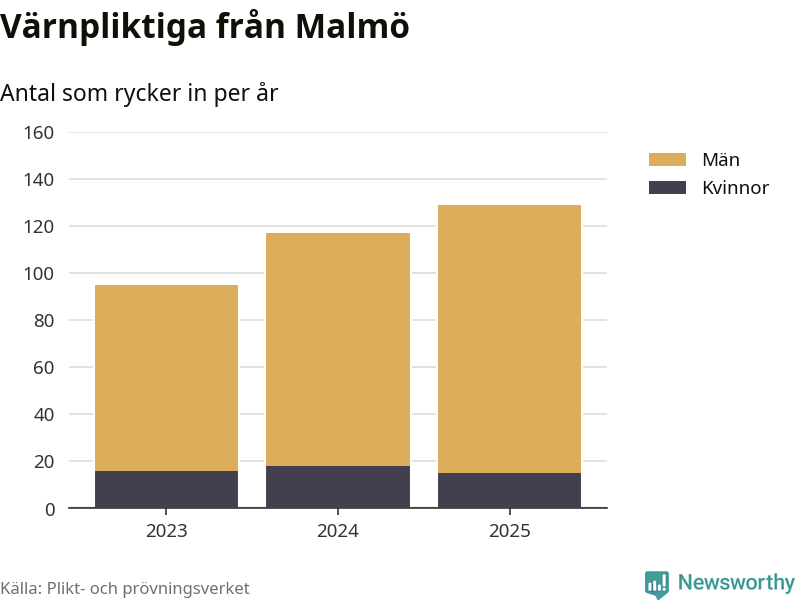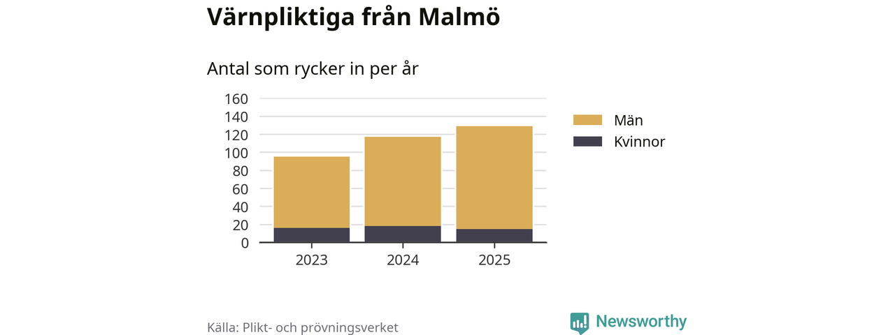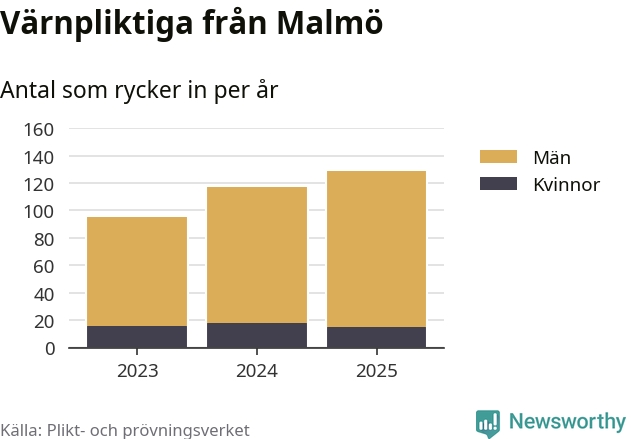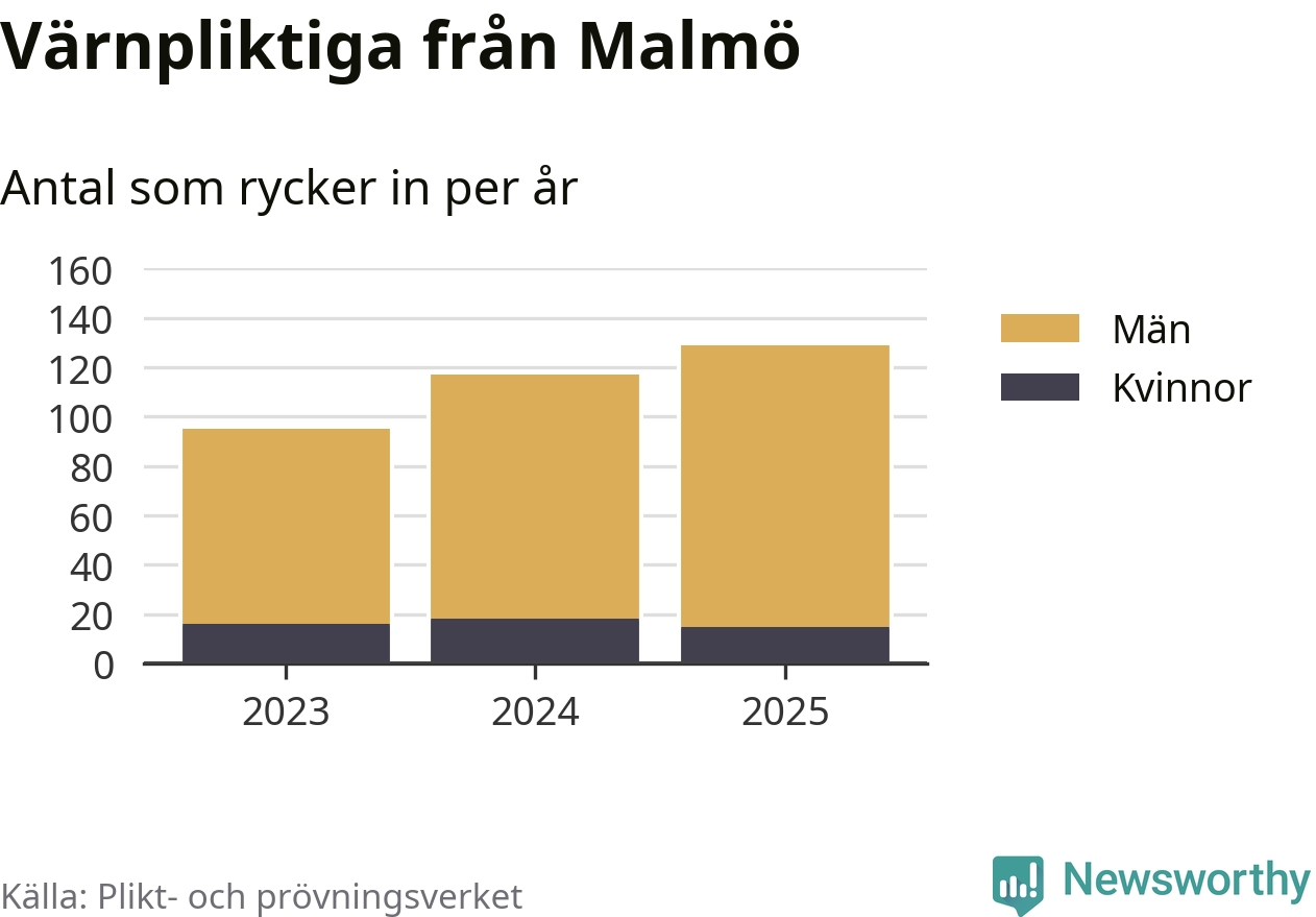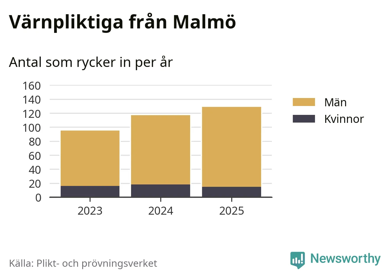 Sedan 2023 – som är det första året vi har jämförbara siffror för – har totalt 341 ungdomar från Malmö påbörjat sin värnplikt. Av dem har 49 varit kvinnor.