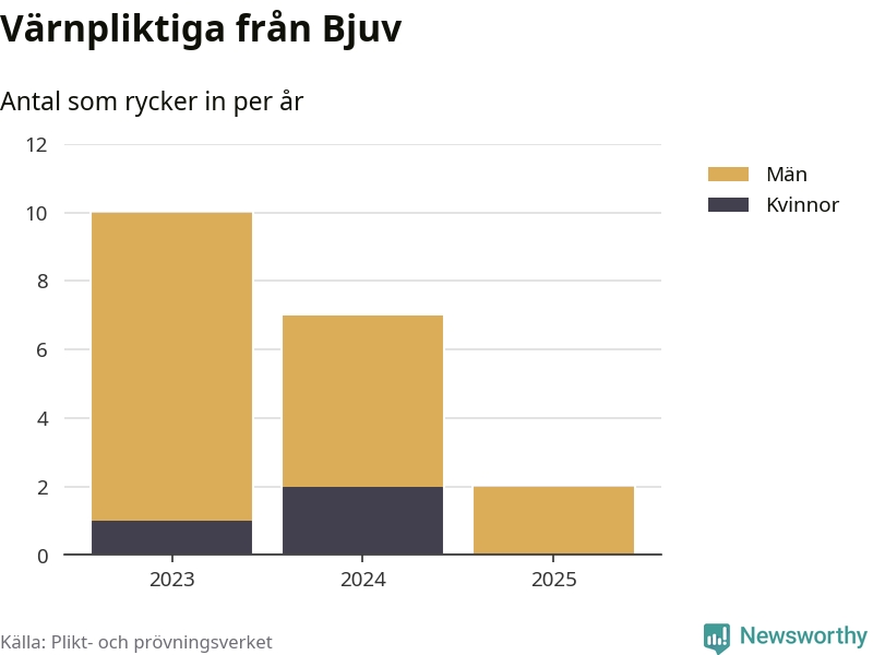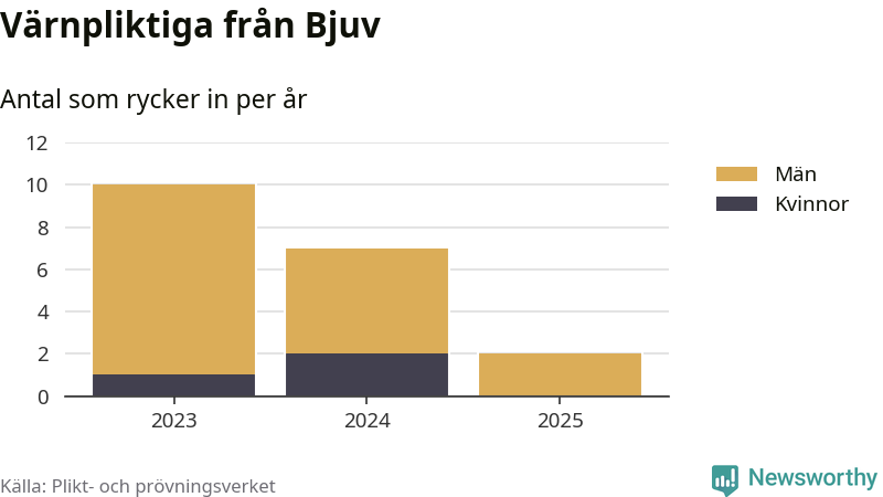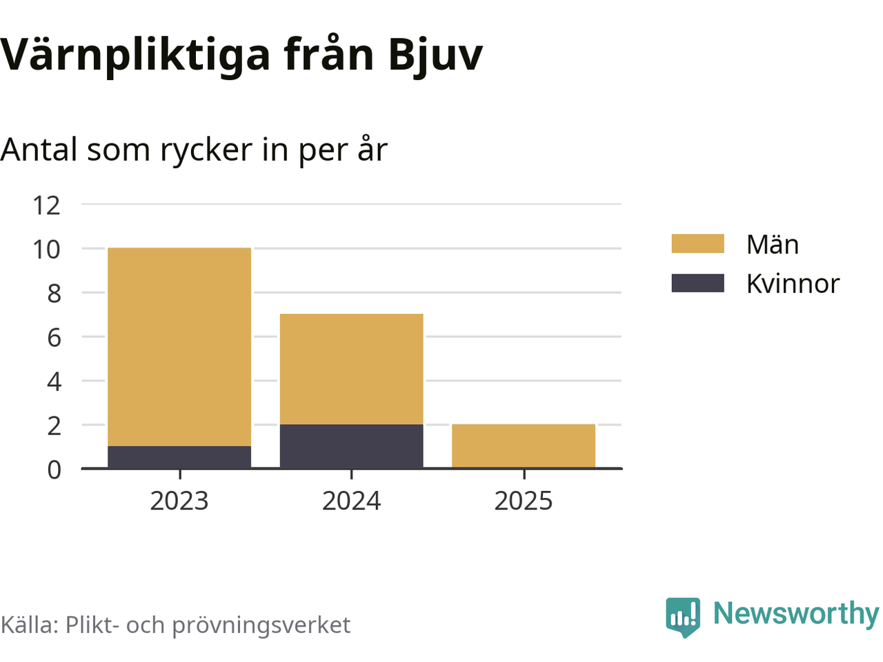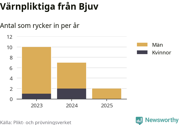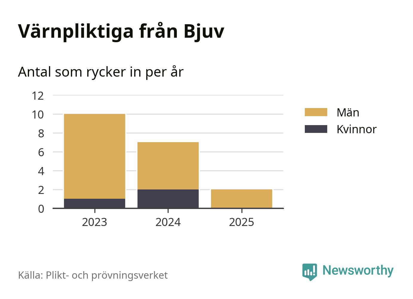 Sedan 2023 – som är det första året vi har jämförbara siffror för – har totalt 19 ungdomar från Bjuv påbörjat sin värnplikt. Av dem har tre varit kvinnor.
