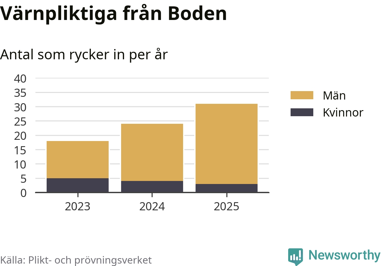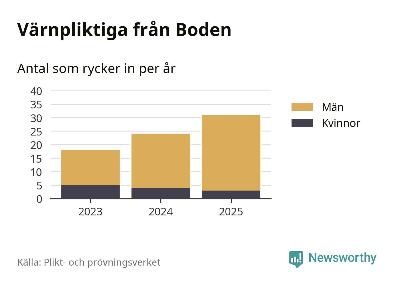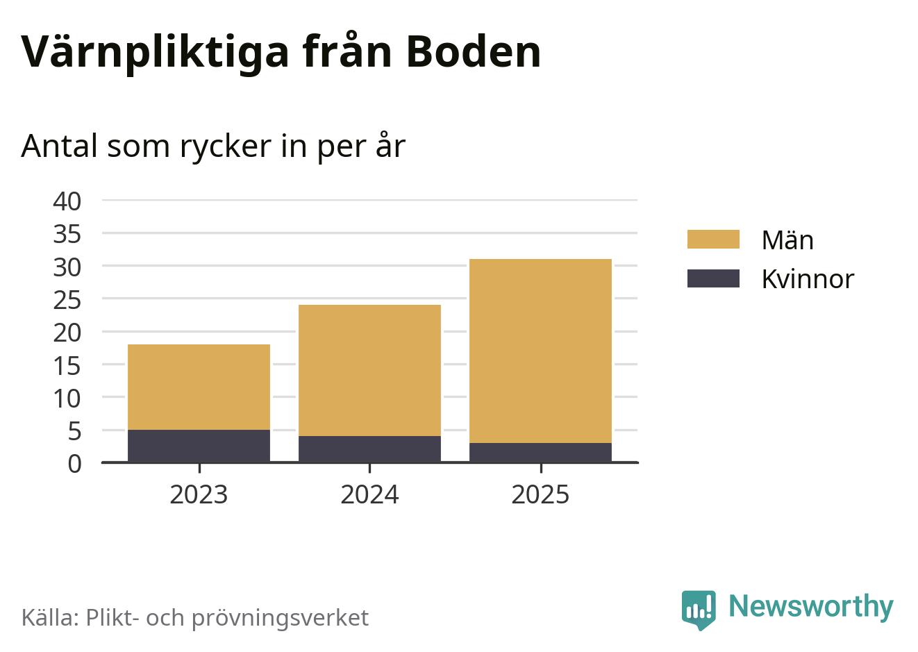 Sedan 2023 – som är det första året vi har jämförbara siffror för – har totalt 73 ungdomar från Boden påbörjat sin värnplikt. Av dem har tolv varit kvinnor.