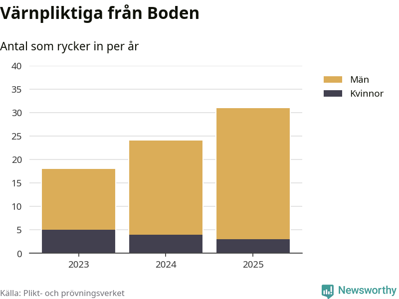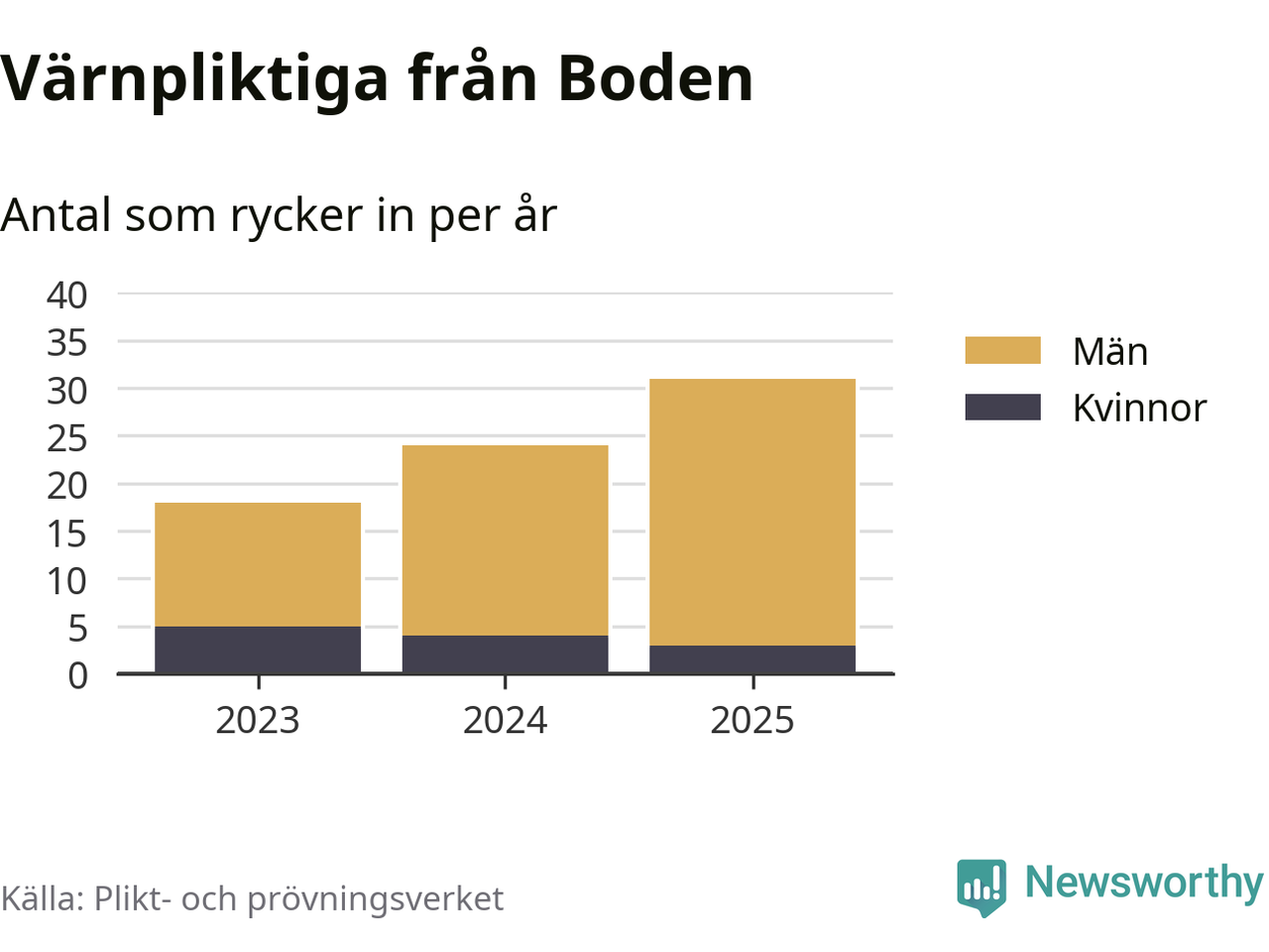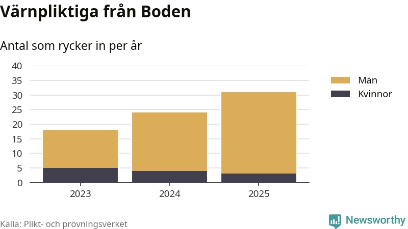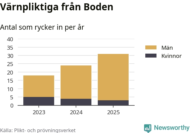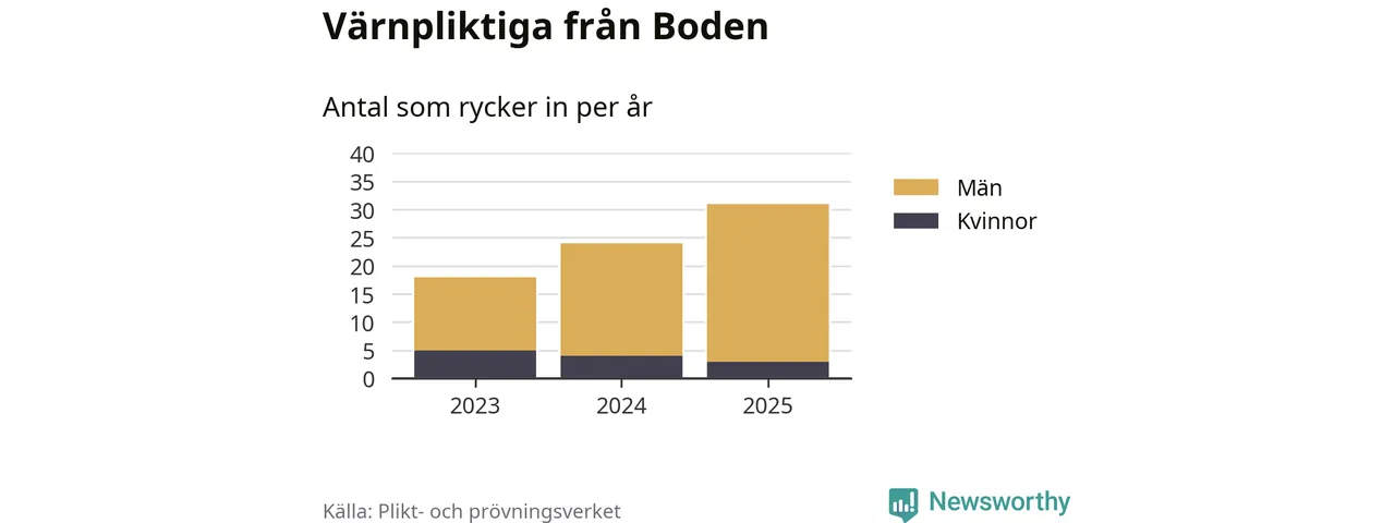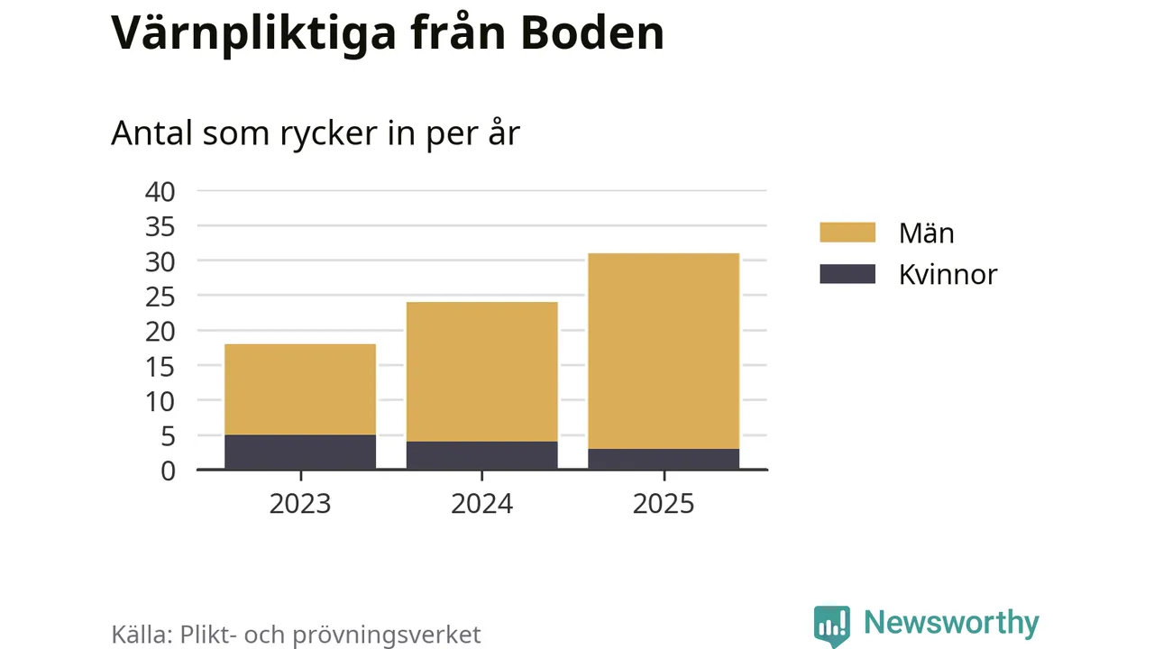 Sedan 2023 – som är det första året vi har jämförbara siffror för – har totalt 73 ungdomar från Boden påbörjat sin värnplikt. Av dem har tolv varit kvinnor.