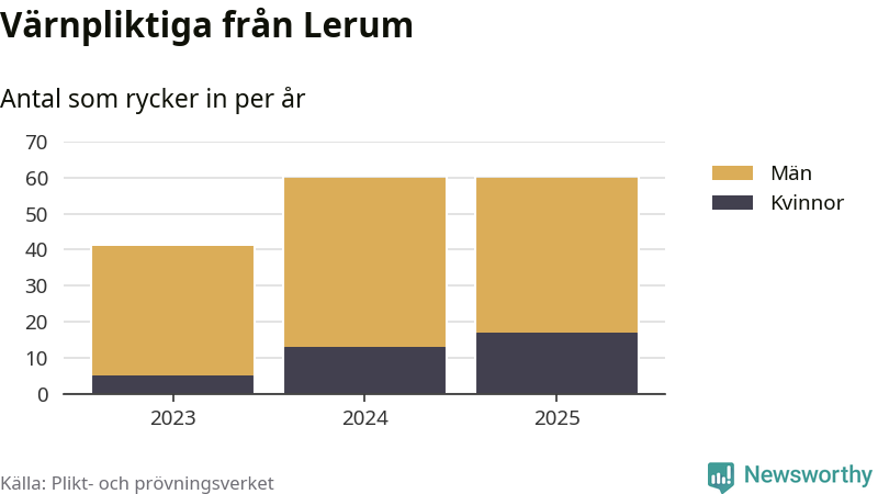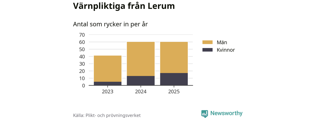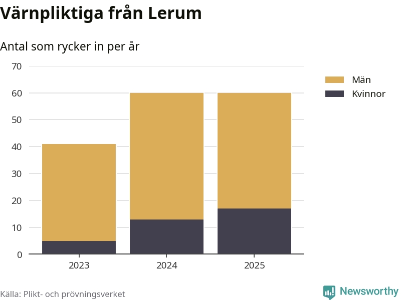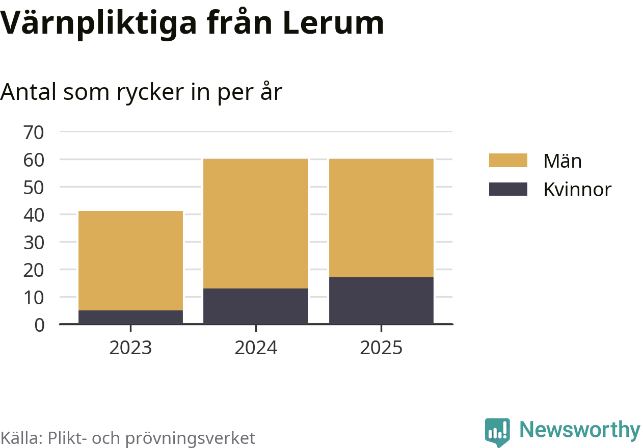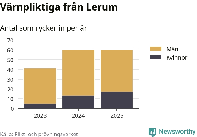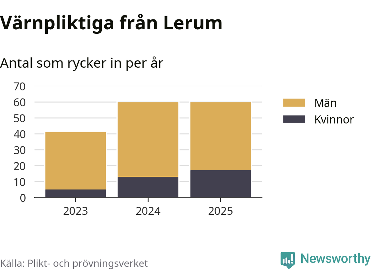 Sedan 2023 – som är det första året vi har jämförbara siffror för – har totalt 161 ungdomar från Lerum påbörjat sin värnplikt. Av dem har 35 varit kvinnor.