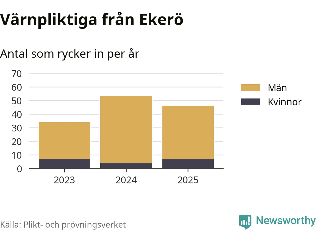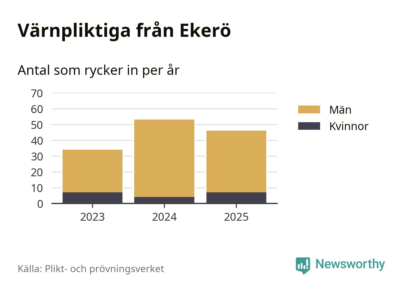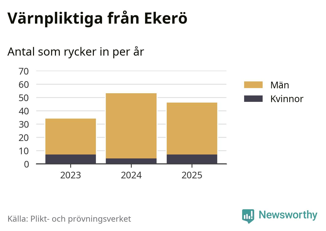 Sedan 2023 – som är det första året vi har jämförbara siffror för – har totalt 133 ungdomar från Ekerö påbörjat sin värnplikt. Av dem har 18 varit kvinnor.