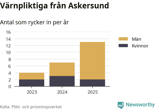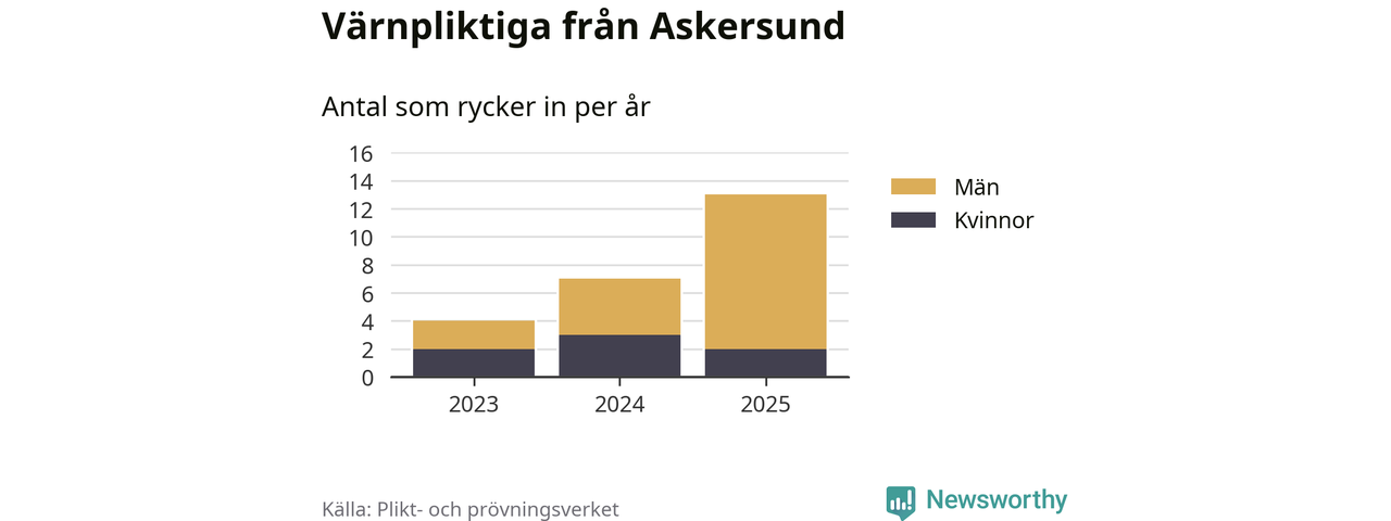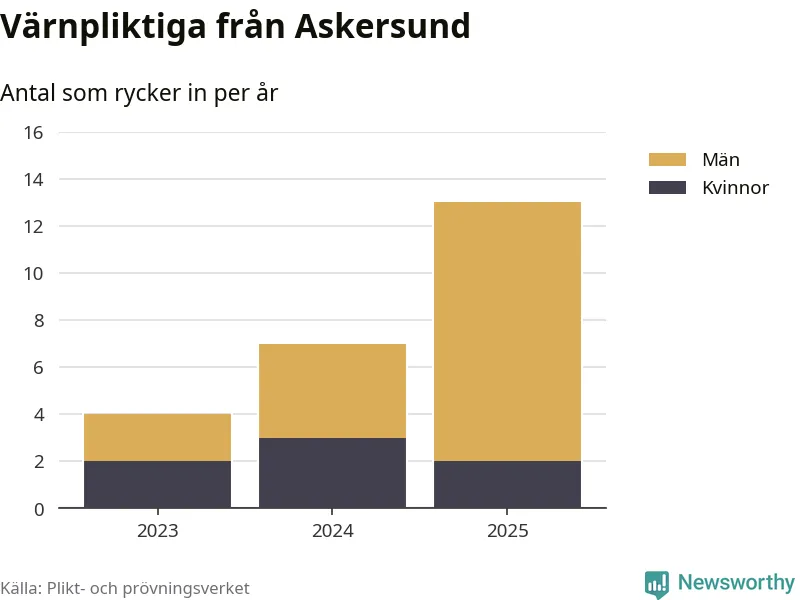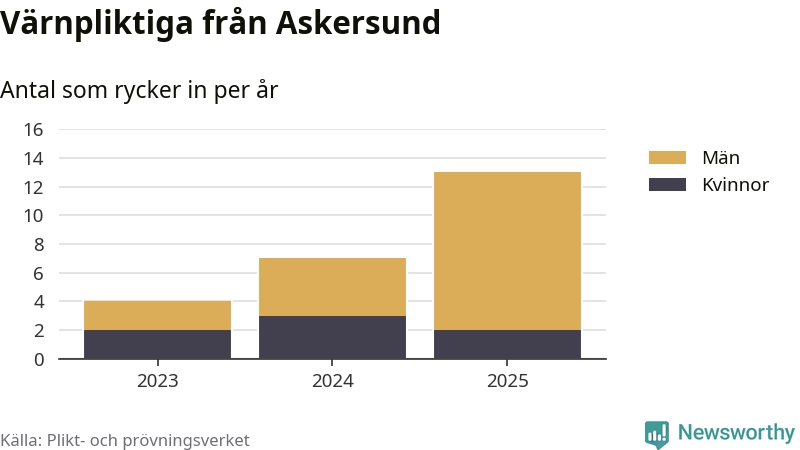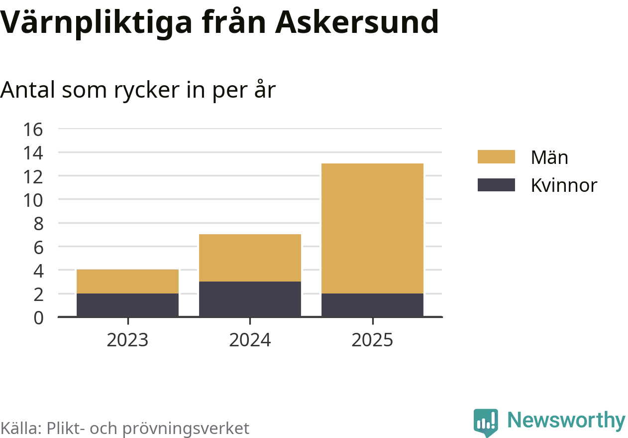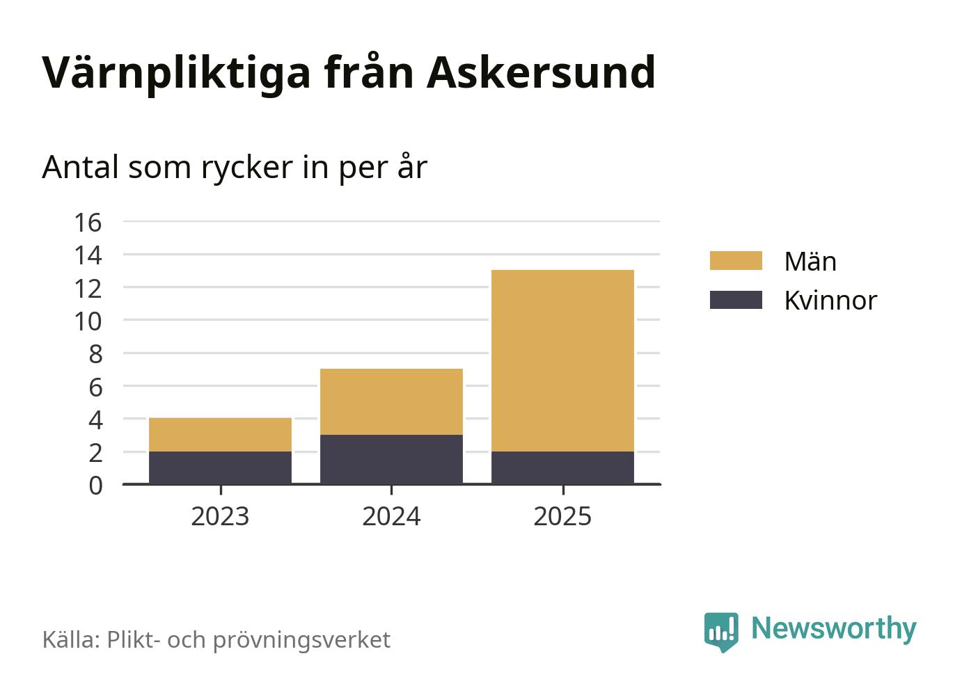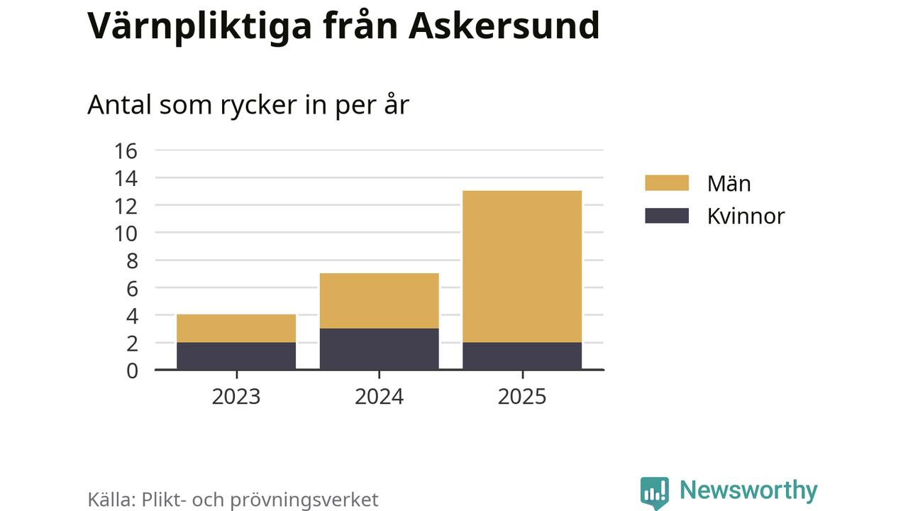Sedan 2023 – som är det första året vi har jämförbara siffror för – har totalt 24 ungdomar från Askersund påbörjat sin värnplikt. Av dem har sju varit kvinnor.