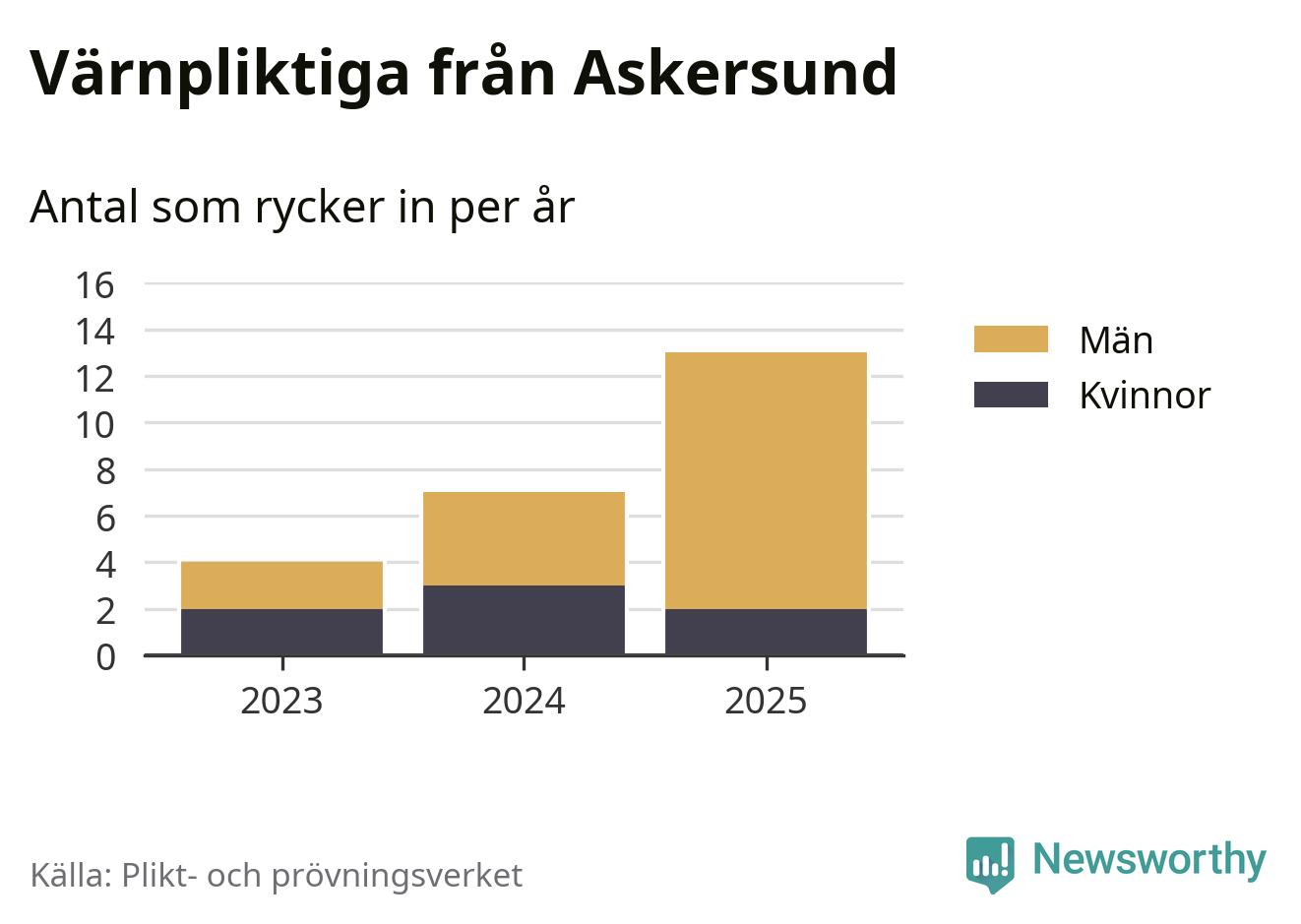 Av de värnpliktiga från Askersund är elva män och två kvinnor. Antalet kvinnor från kommunen har minskat jämfört med föregående år. Totalt i riket är 16 procent av de värnpliktiga kvinnor, även det en minskning jämfört med föregående år.