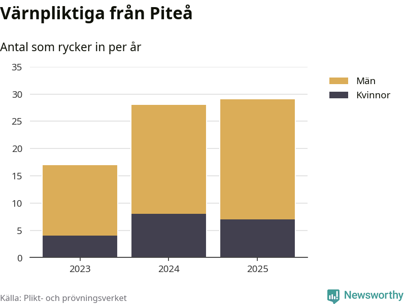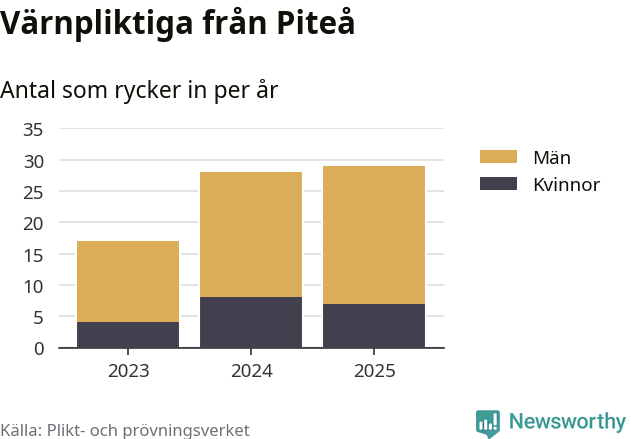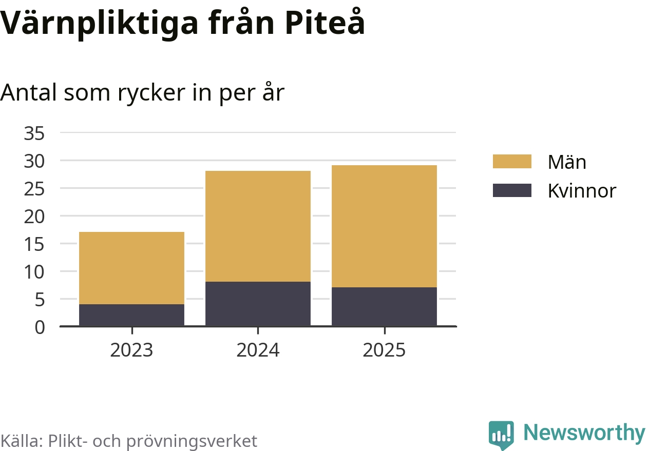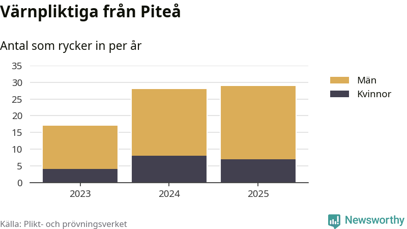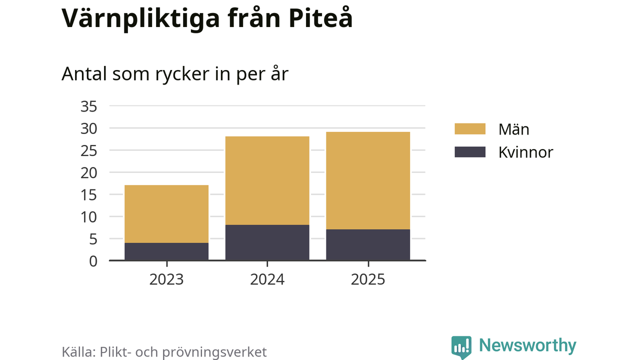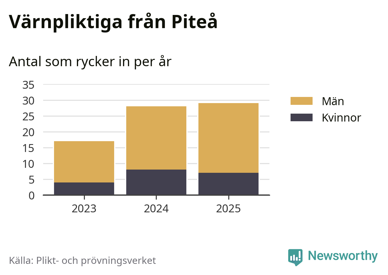 Sedan 2023 – som är det första året vi har jämförbara siffror för – har totalt 74 ungdomar från Piteå påbörjat sin värnplikt. Av dem har 19 varit kvinnor.