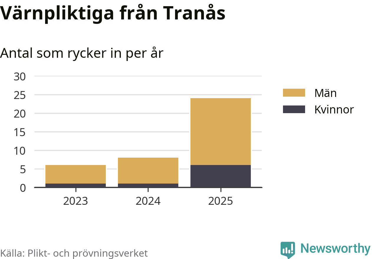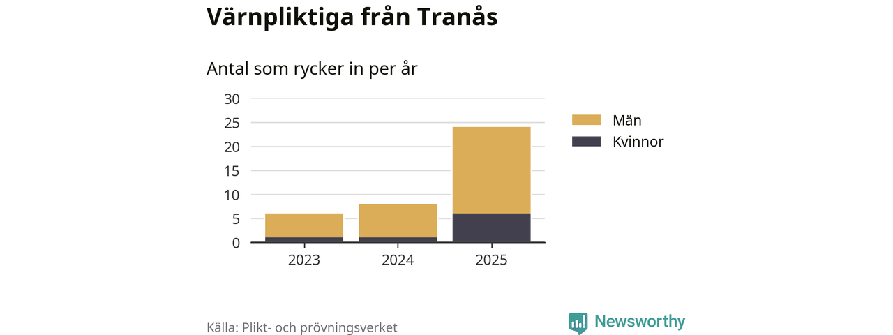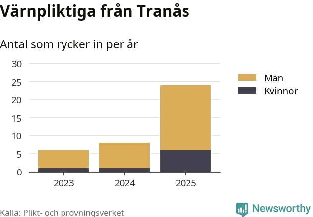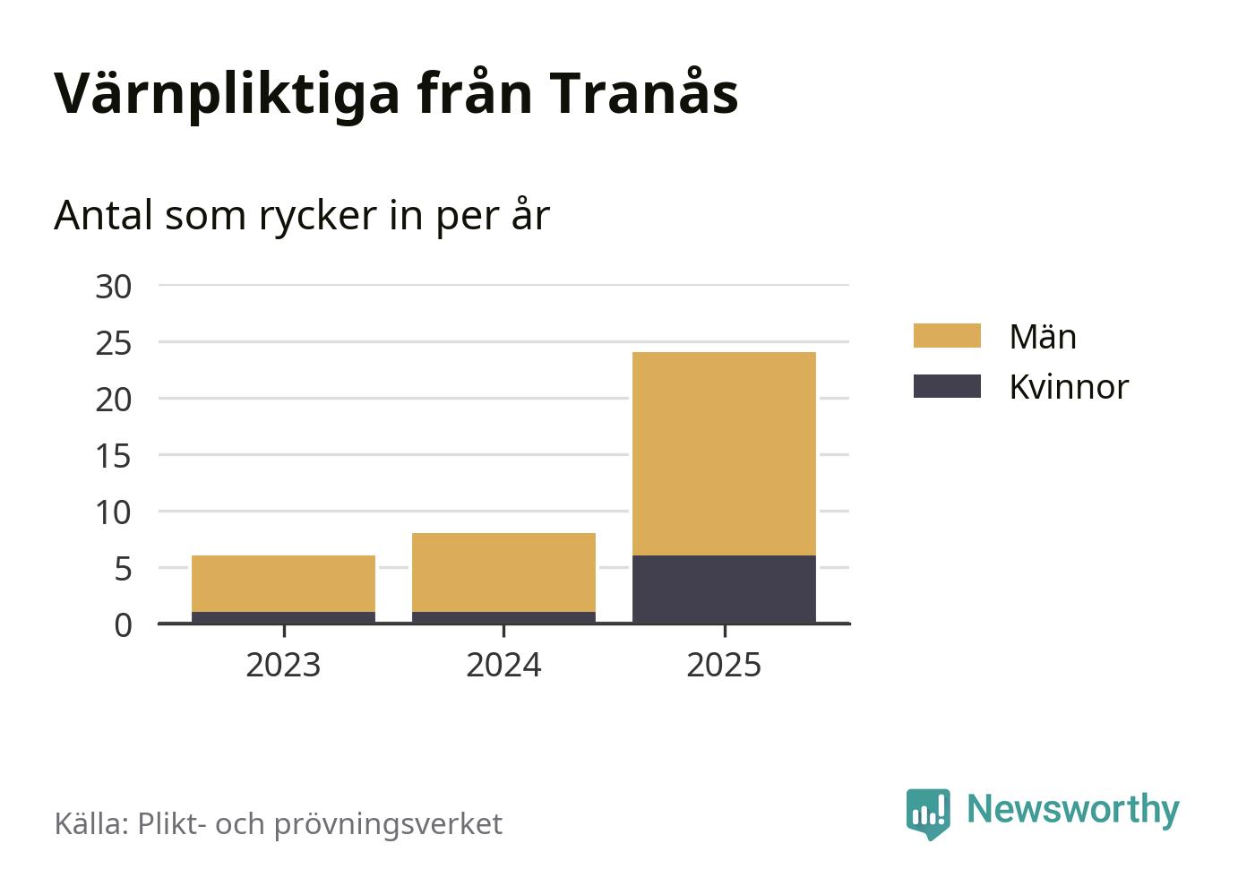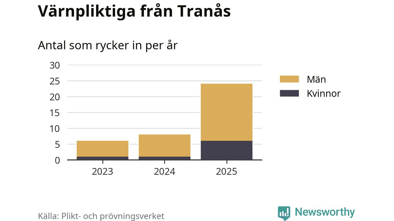 Sedan 2023 – som är det första året vi har jämförbara siffror för – har totalt 38 ungdomar från Tranås påbörjat sin värnplikt. Av dem har åtta varit kvinnor.