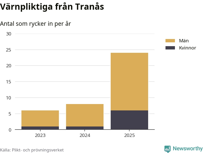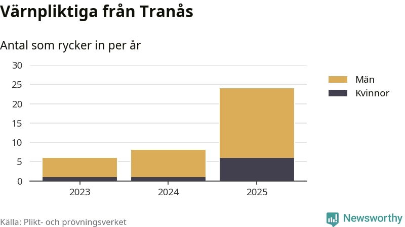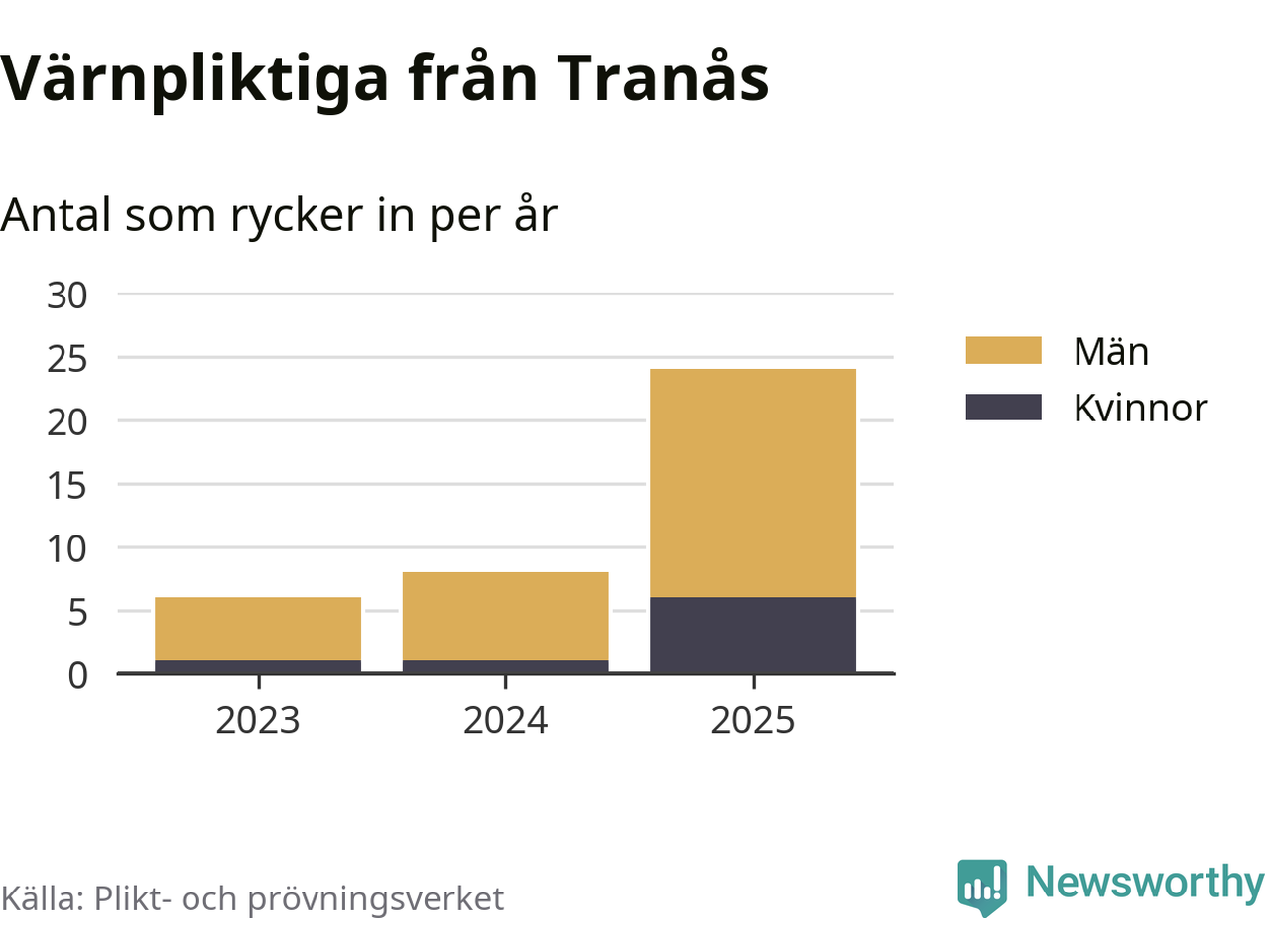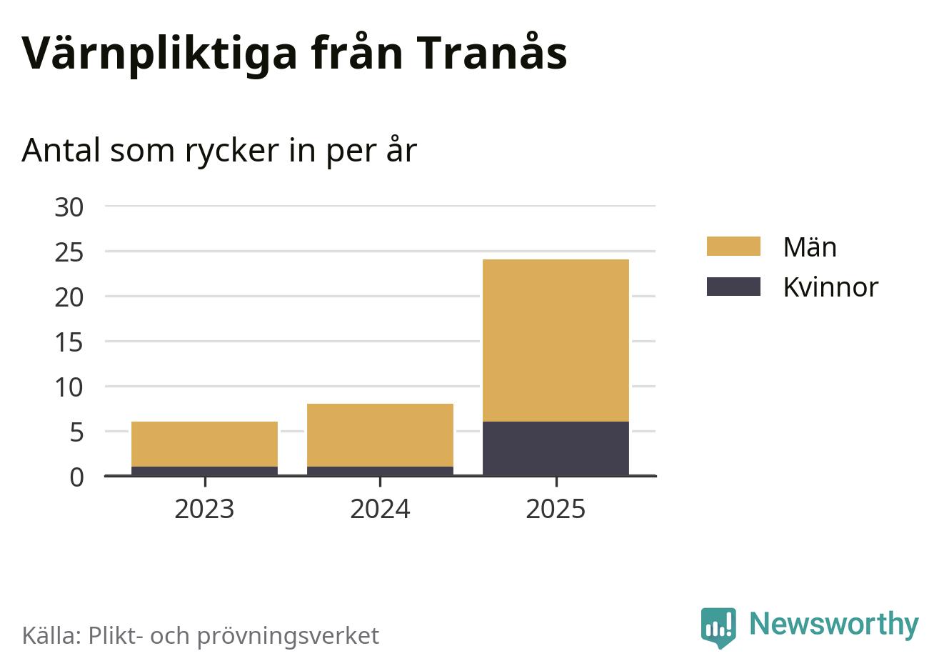 Sedan 2023 – som är det första året vi har jämförbara siffror för – har totalt 38 ungdomar från Tranås påbörjat sin värnplikt. Av dem har åtta varit kvinnor.