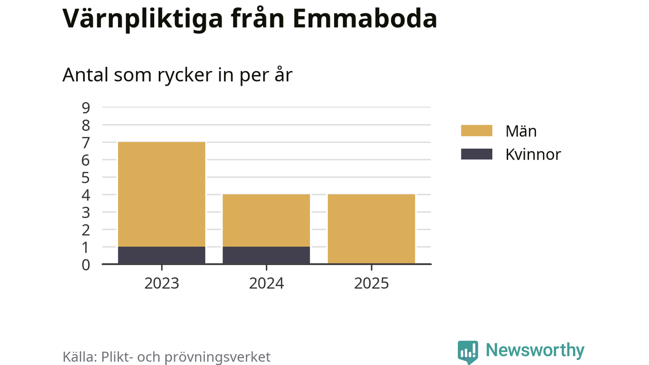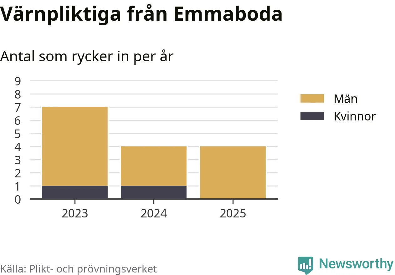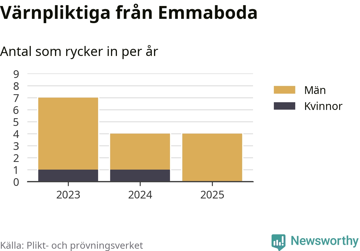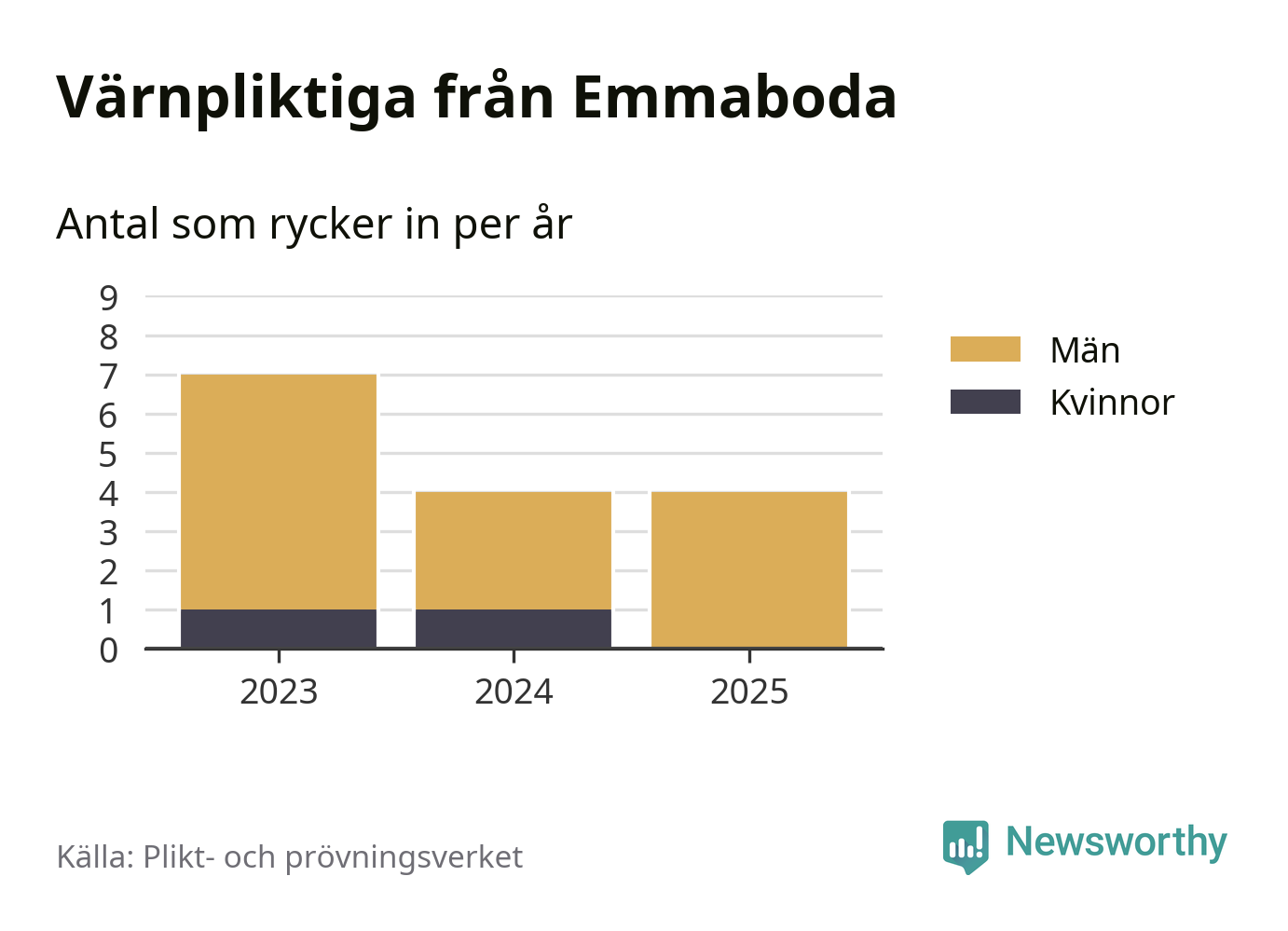 Sedan 2023 – som är det första året vi har jämförbara siffror för – har totalt 15 ungdomar från Emmaboda påbörjat sin värnplikt. Av dem har två varit kvinnor.