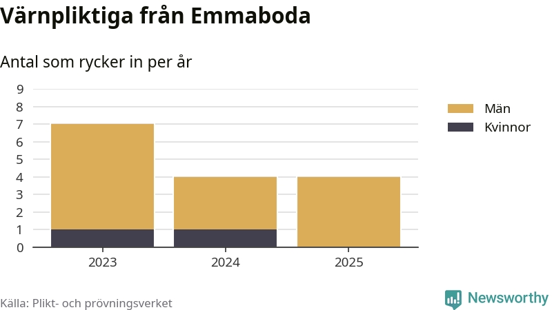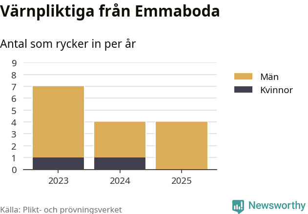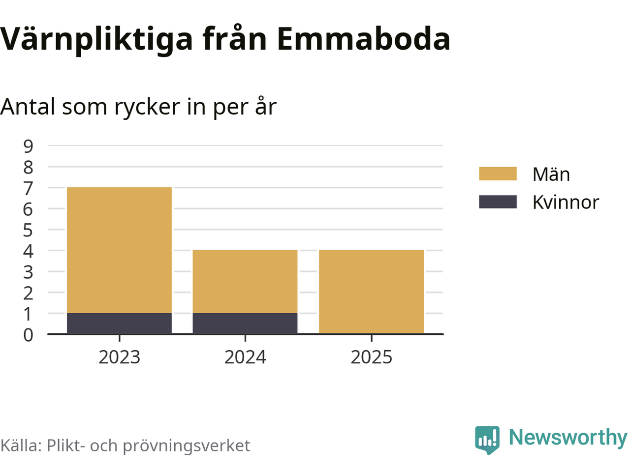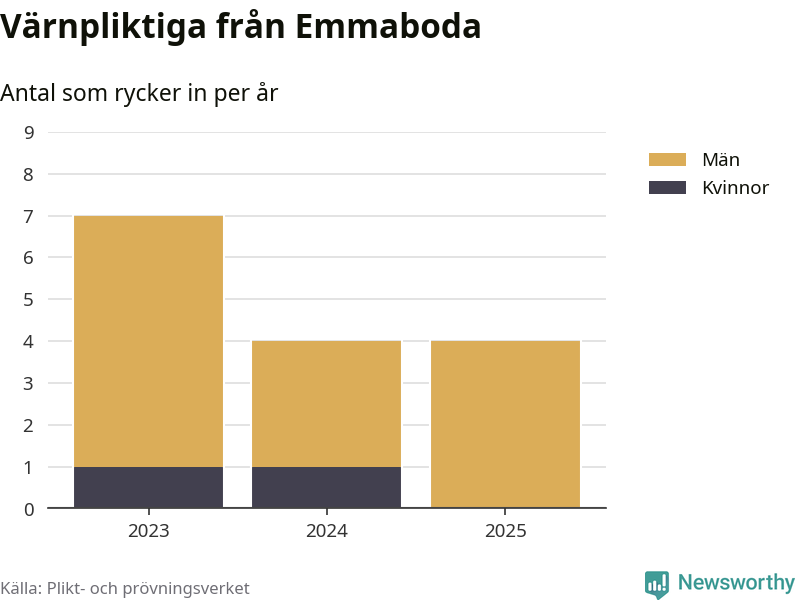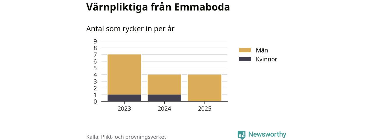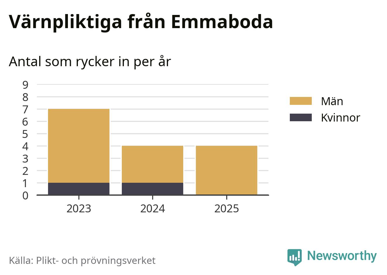 Sedan 2023 – som är det första året vi har jämförbara siffror för – har totalt 15 ungdomar från Emmaboda påbörjat sin värnplikt. Av dem har två varit kvinnor.
