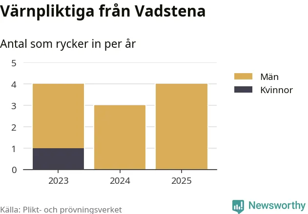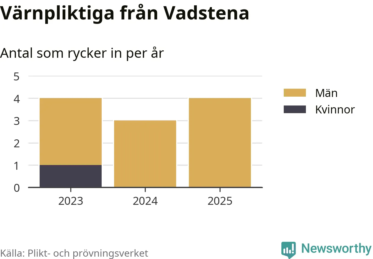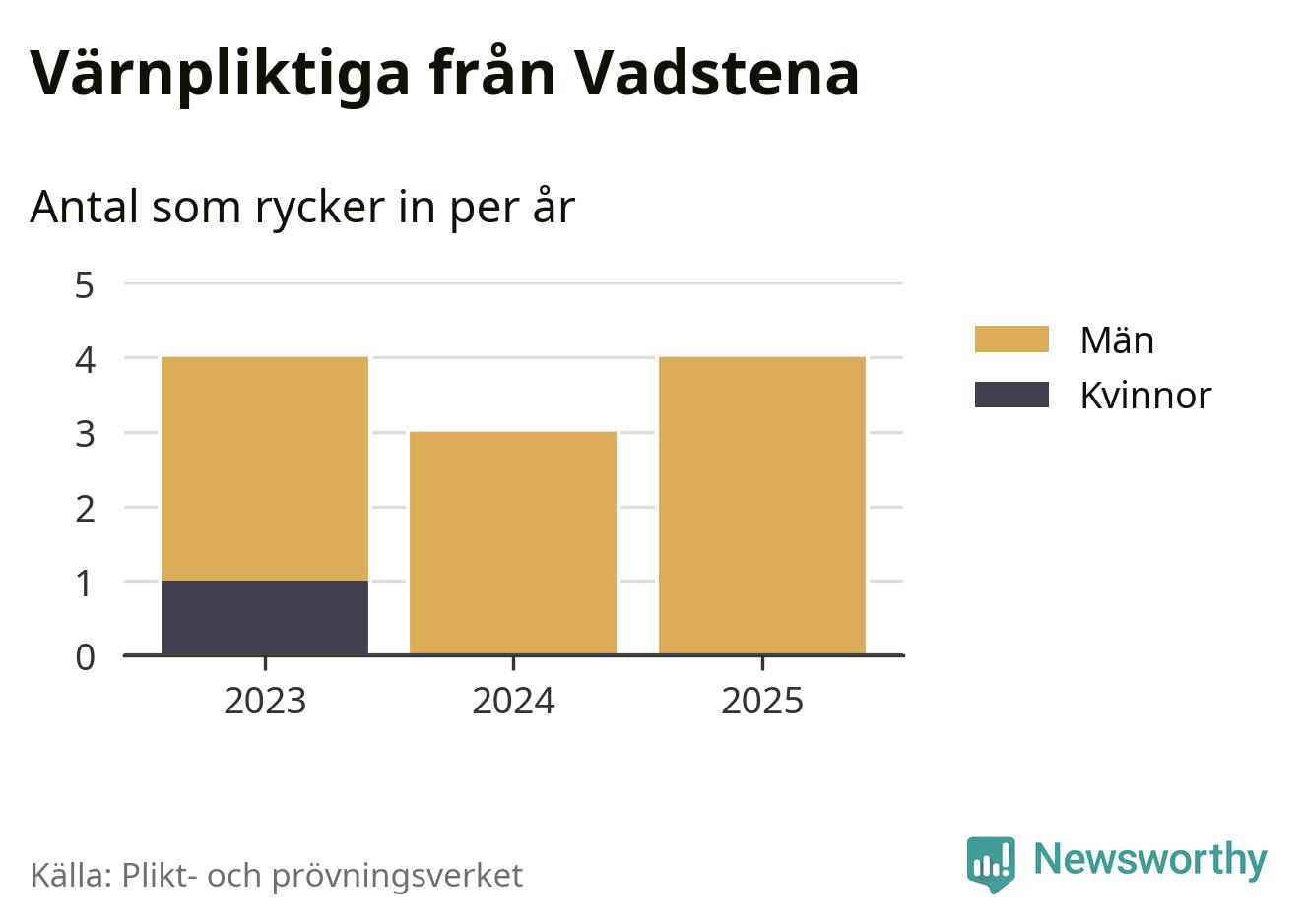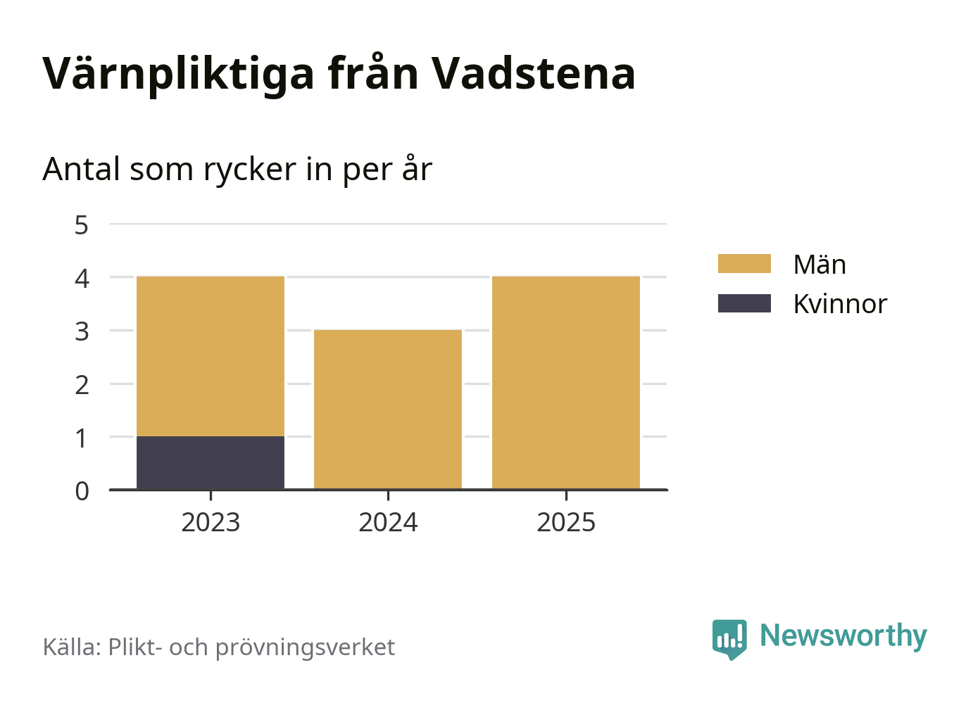 Sedan 2023 – som är det första året vi har jämförbara siffror för – har totalt elva ungdomar från Vadstena påbörjat sin värnplikt. Av dem har en varit kvinna.