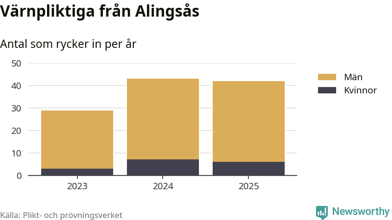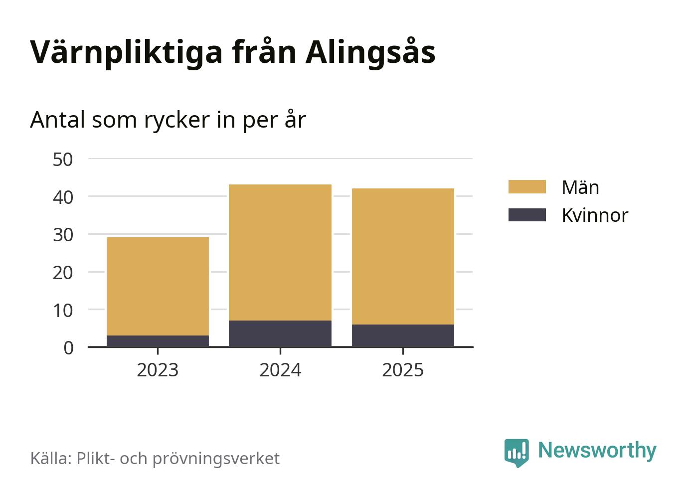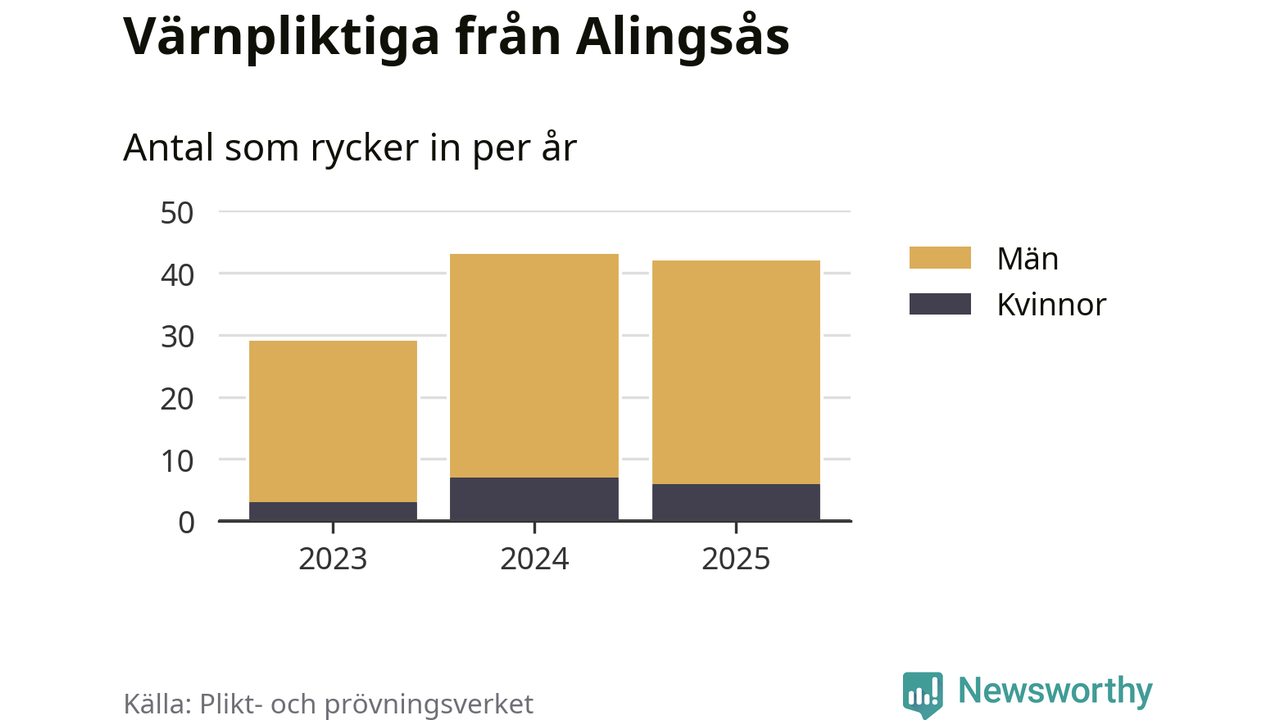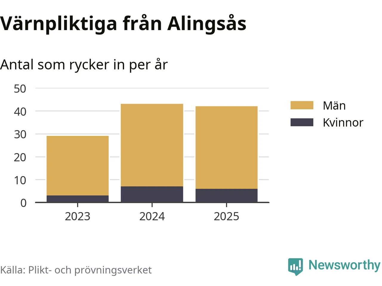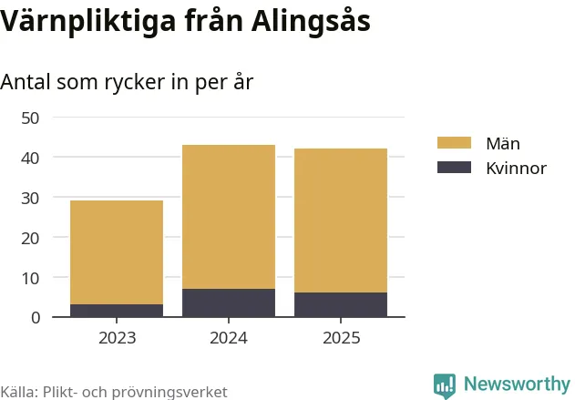 Sedan 2023 – som är det första året vi har jämförbara siffror för – har totalt 114 ungdomar från Alingsås påbörjat sin värnplikt. Av dem har 16 varit kvinnor.