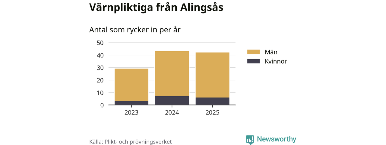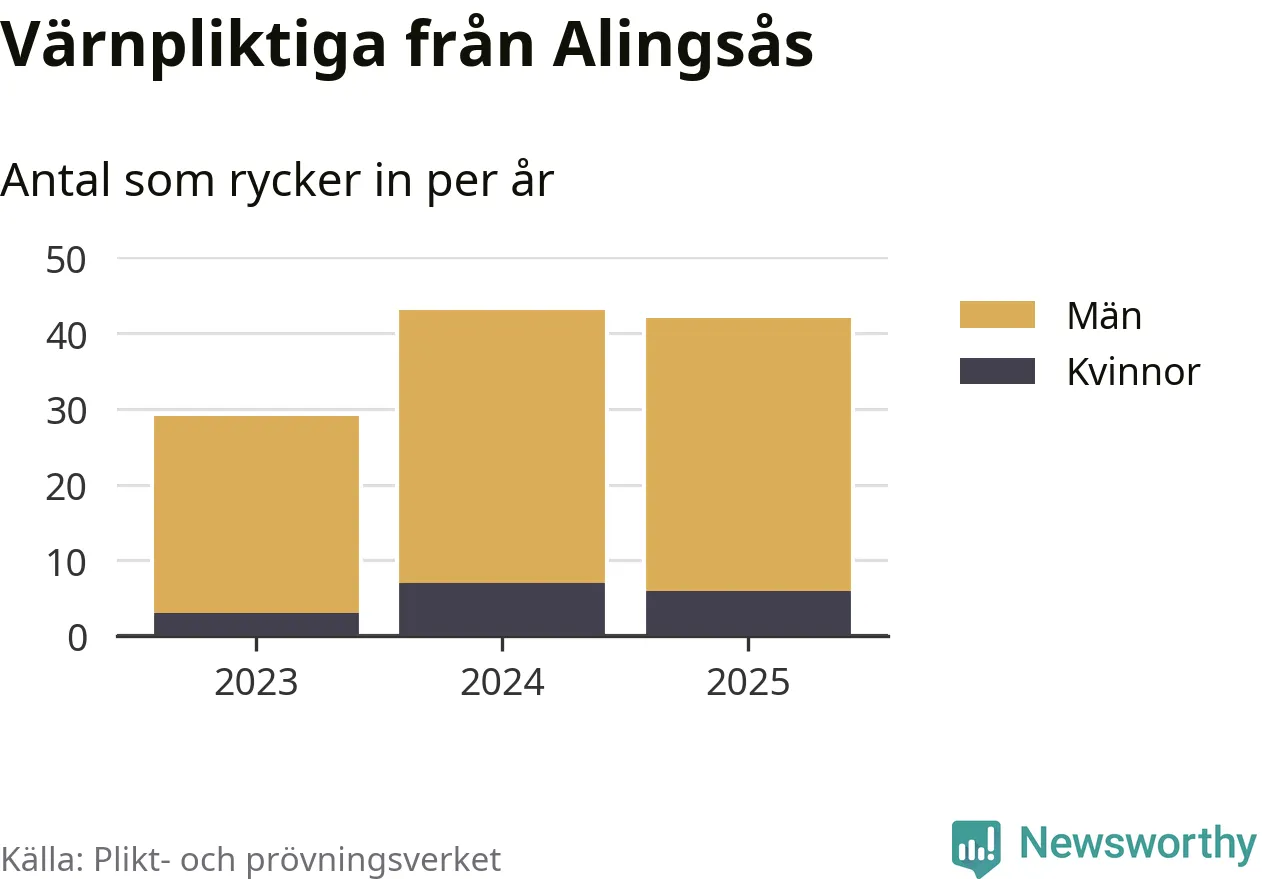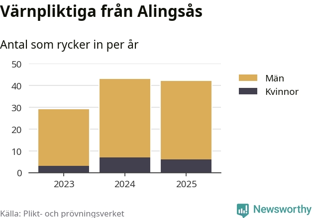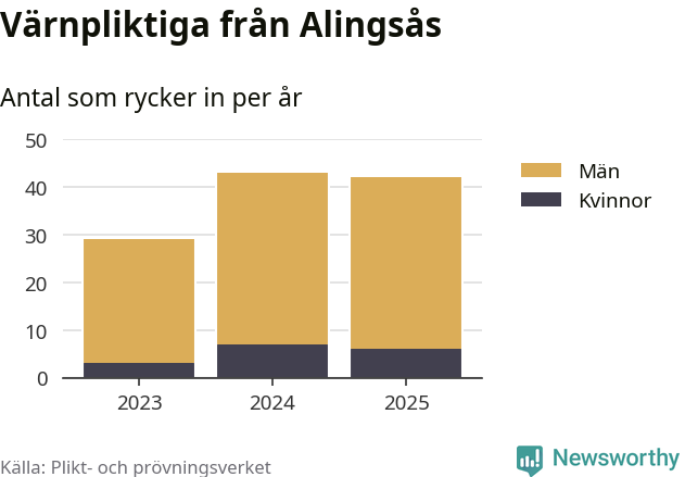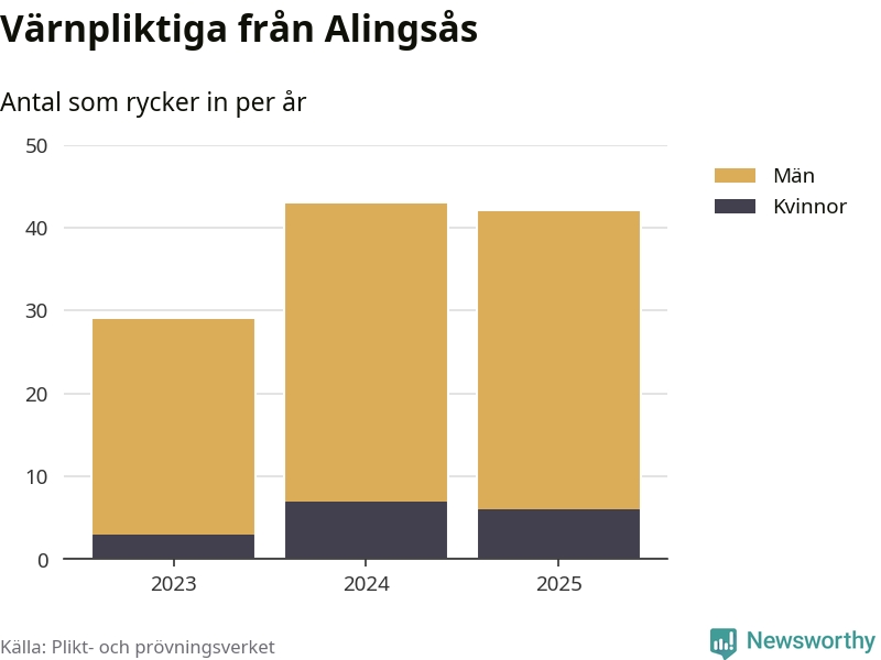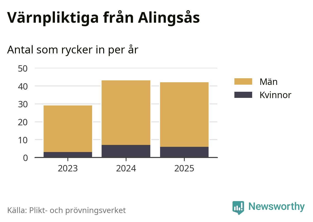 Sedan 2023 – som är det första året vi har jämförbara siffror för – har totalt 114 ungdomar från Alingsås påbörjat sin värnplikt. Av dem har 16 varit kvinnor.