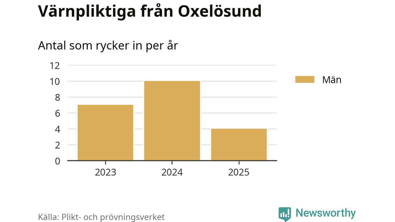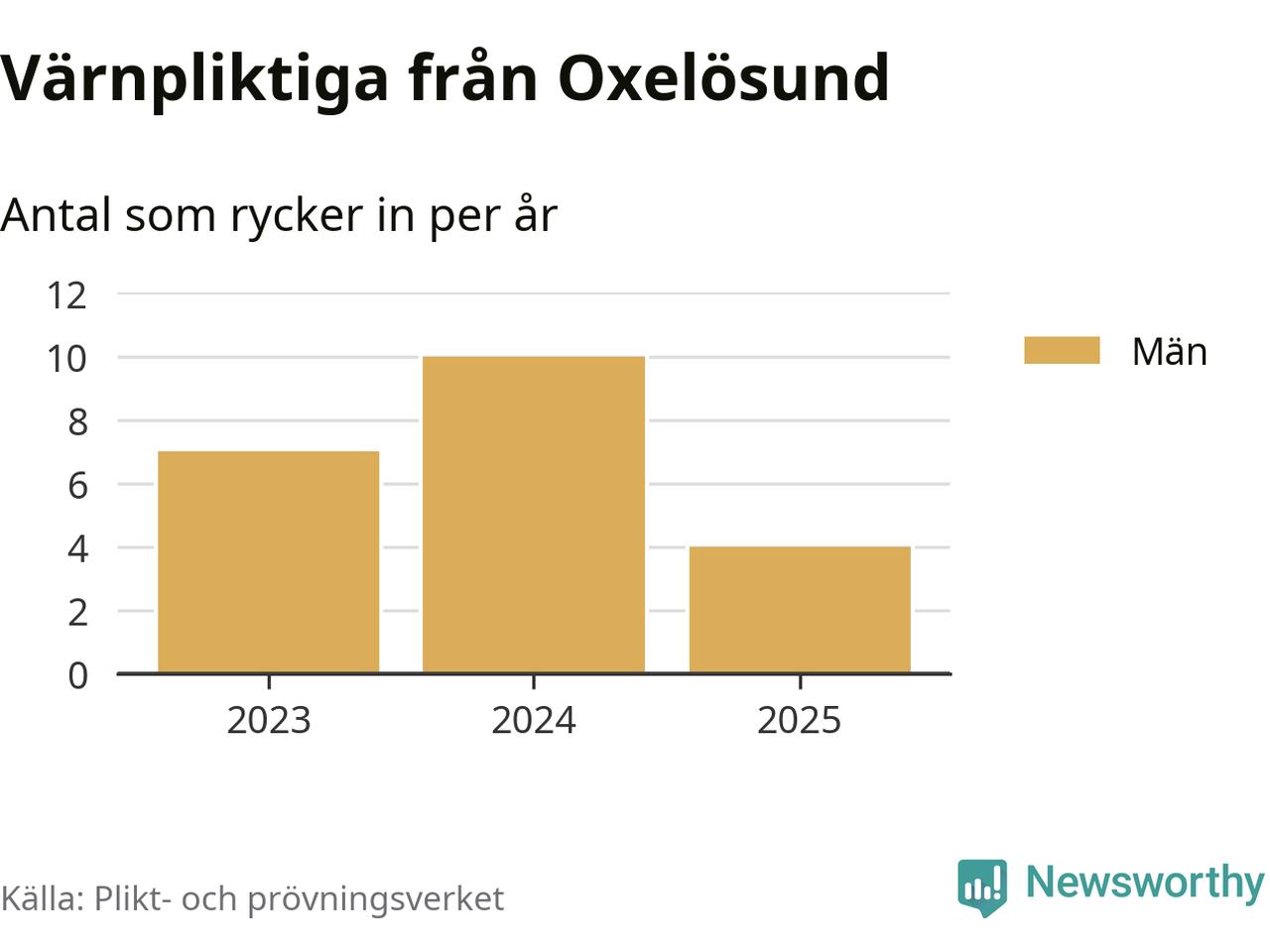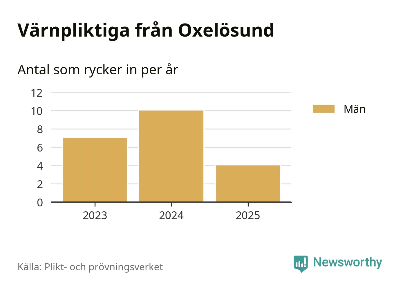 Sedan 2023 – som är det första året vi har jämförbara siffror för – har totalt 21 ungdomar från Oxelösund påbörjat sin värnplikt. Ingen av dem har varit kvinnor.