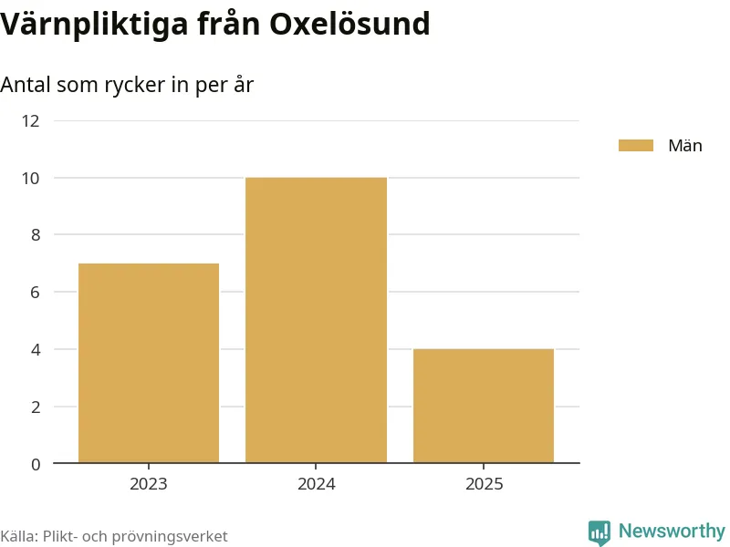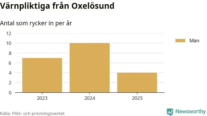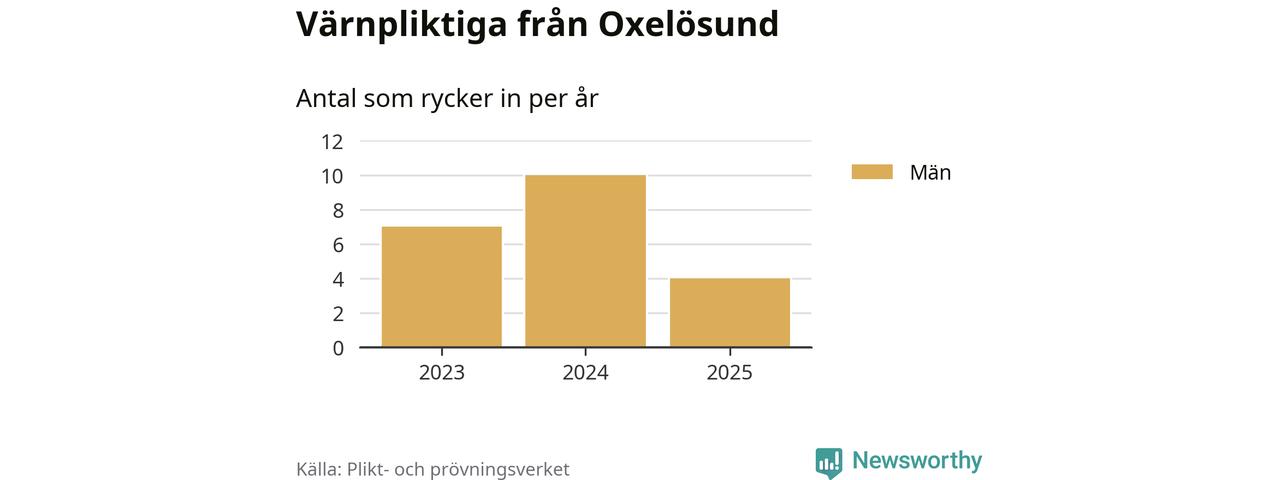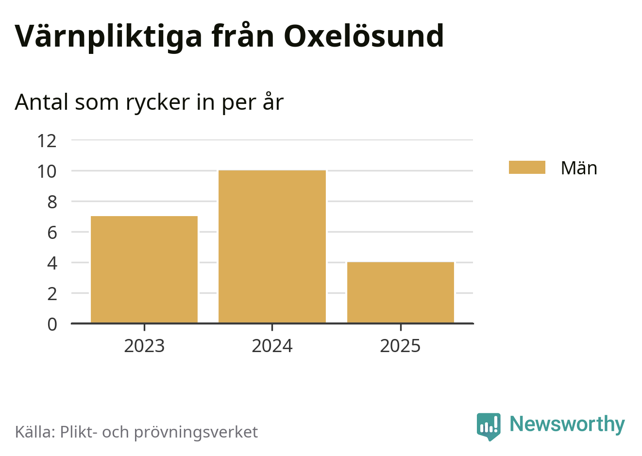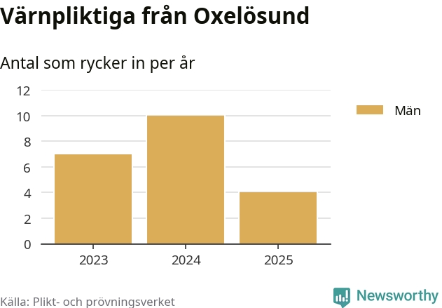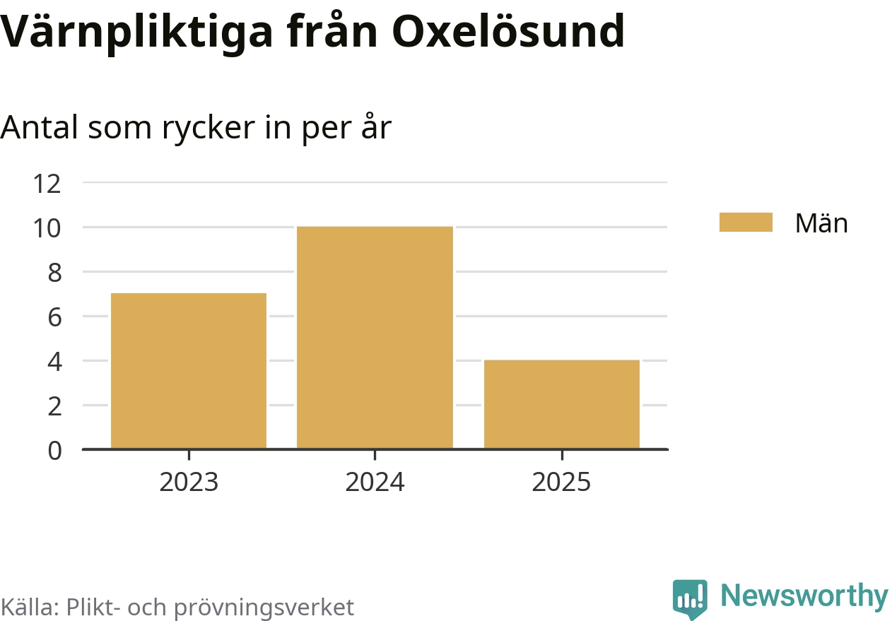 Sedan 2023 – som är det första året vi har jämförbara siffror för – har totalt 21 ungdomar från Oxelösund påbörjat sin värnplikt. Ingen av dem har varit kvinnor.
