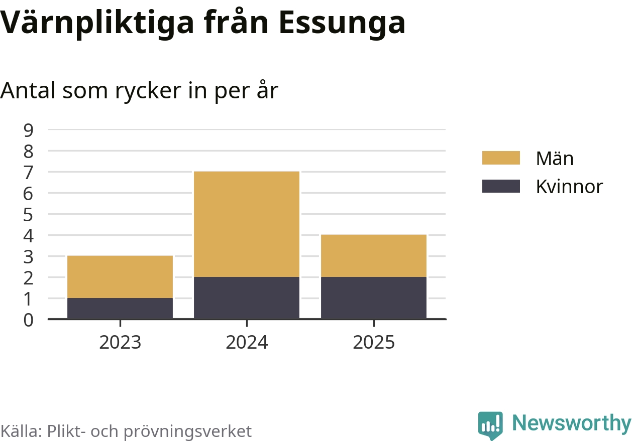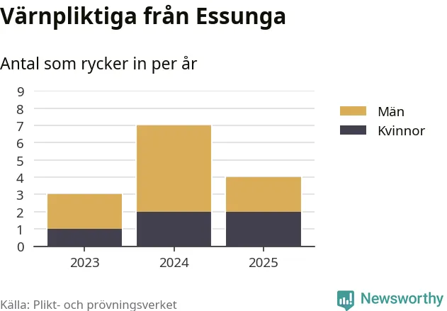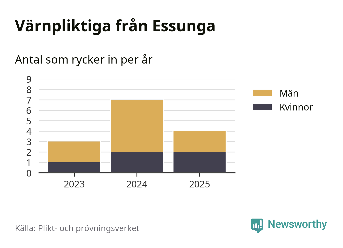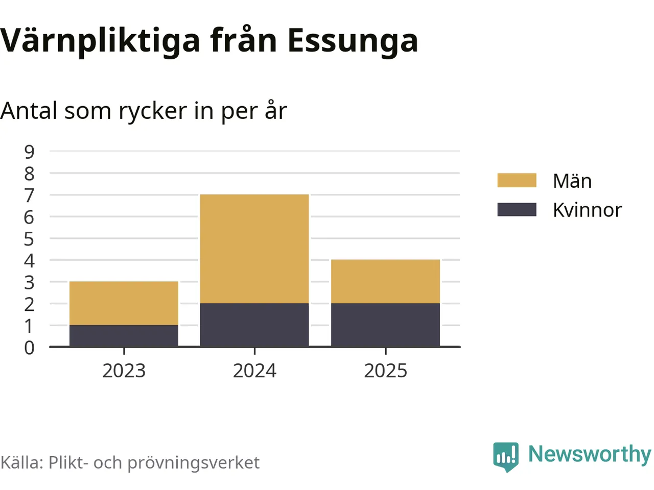 Sedan 2023 – som är det första året vi har jämförbara siffror för – har totalt 14 ungdomar från Essunga påbörjat sin värnplikt. Av dem har fem varit kvinnor.