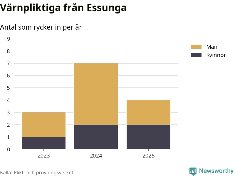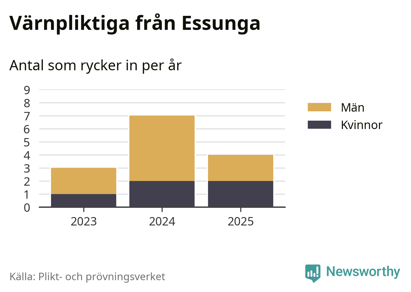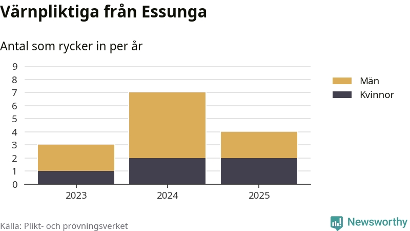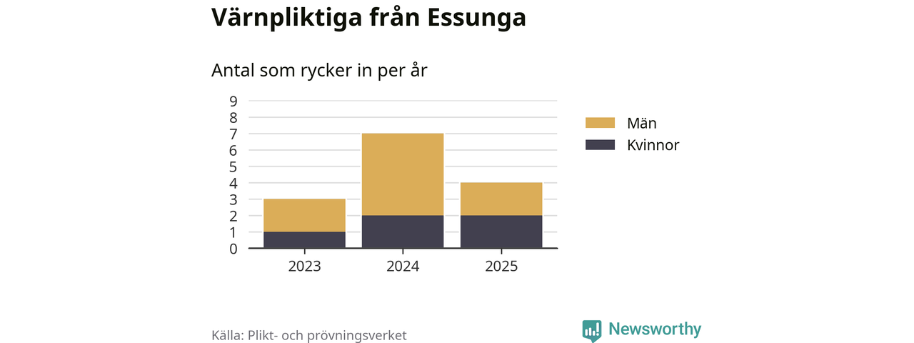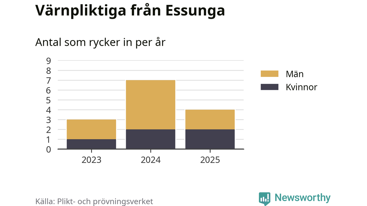 Sedan 2023 – som är det första året vi har jämförbara siffror för – har totalt 14 ungdomar från Essunga påbörjat sin värnplikt. Av dem har fem varit kvinnor.