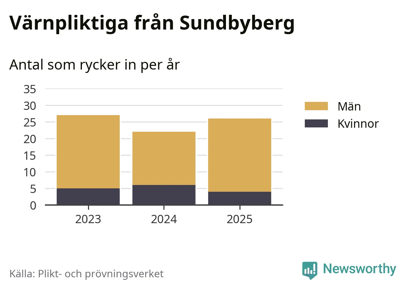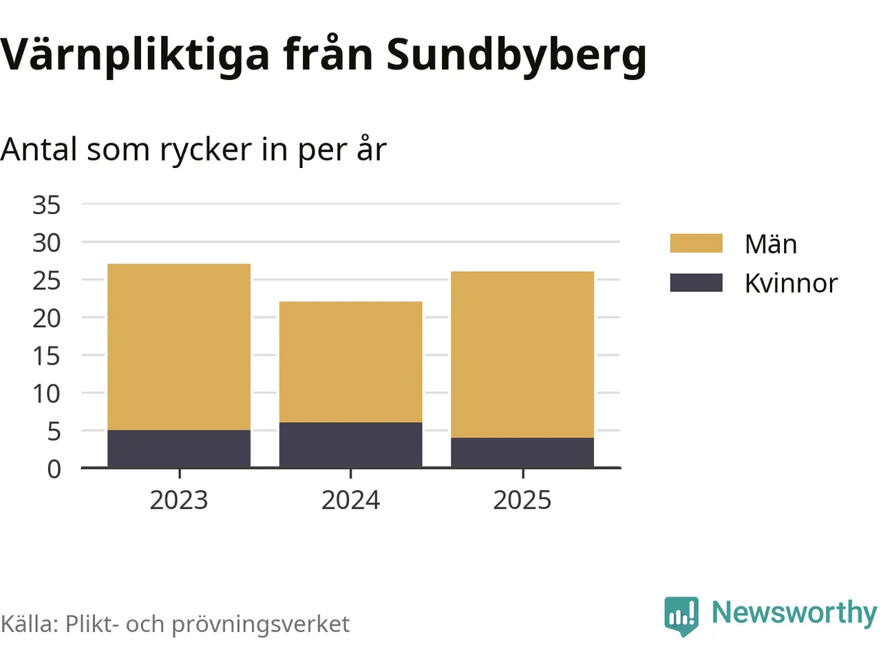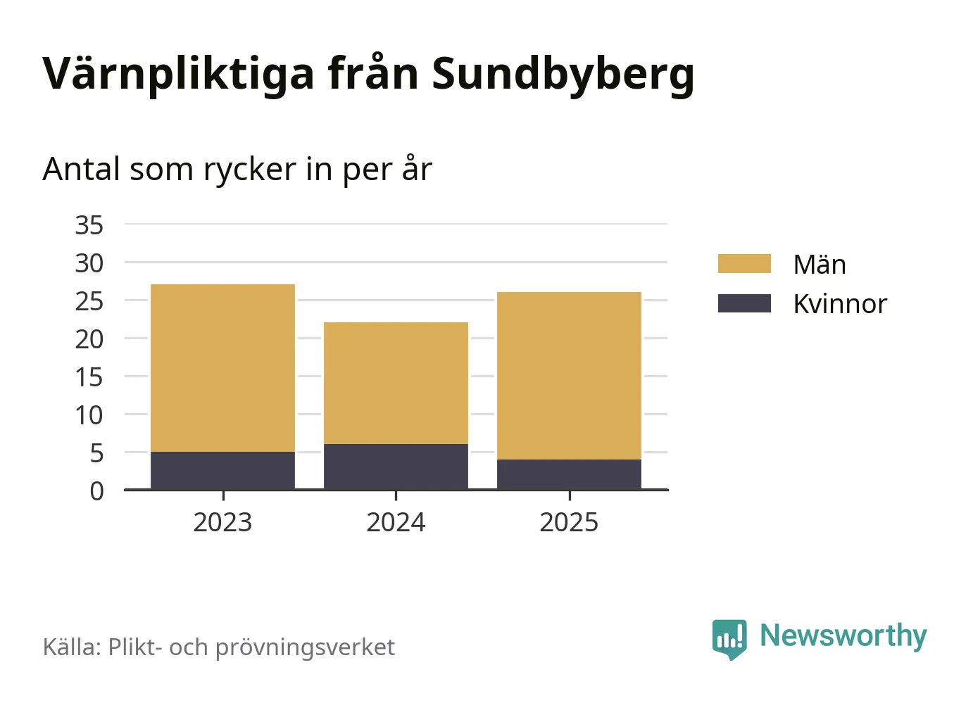 Sedan 2023 – som är det första året vi har jämförbara siffror för – har totalt 75 ungdomar från Sundbyberg påbörjat sin värnplikt. Av dem har 15 varit kvinnor.