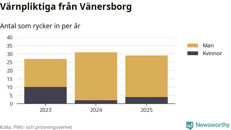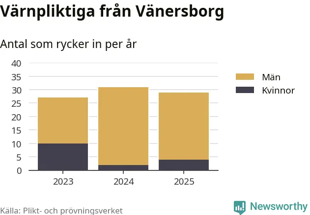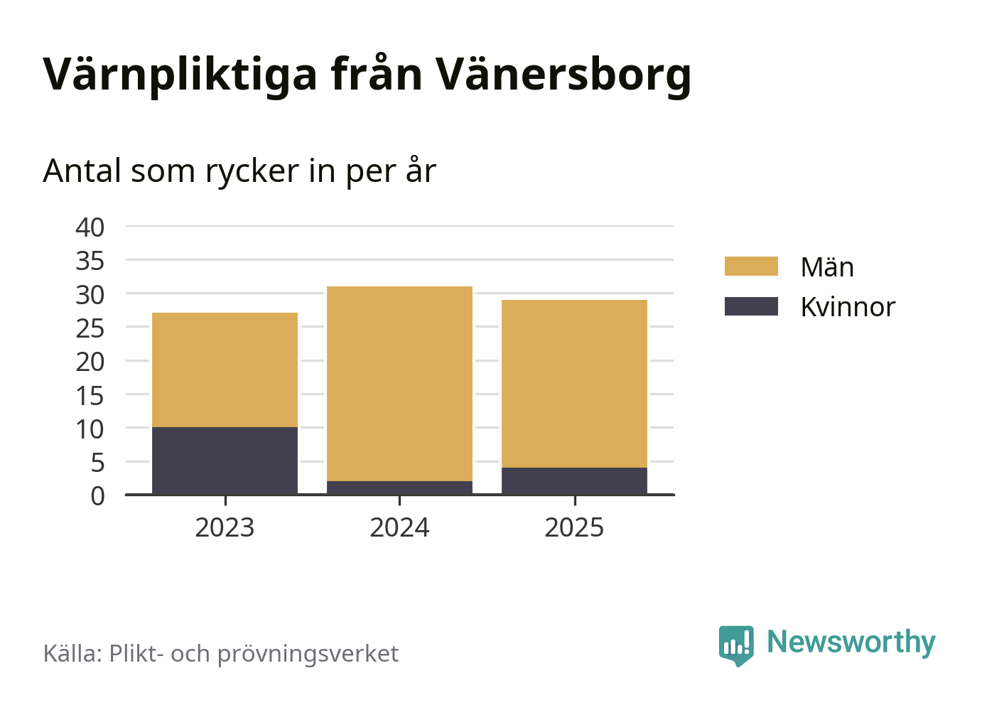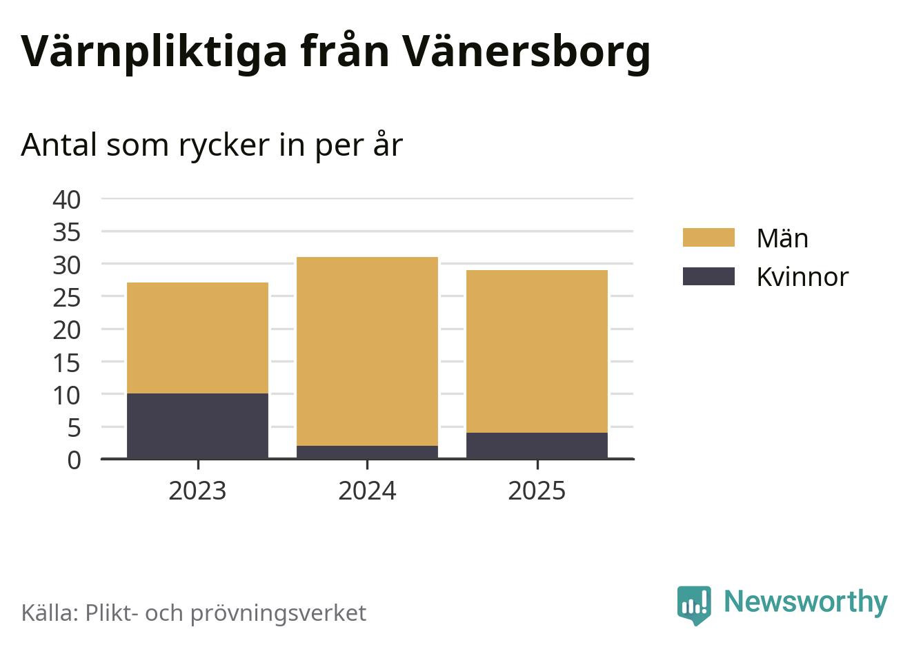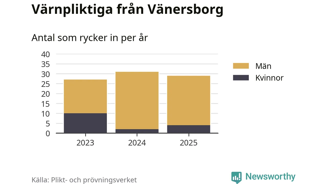Sedan 2023 – som är det första året vi har jämförbara siffror för – har totalt 87 ungdomar från Vänersborg påbörjat sin värnplikt. Av dem har 16 varit kvinnor.