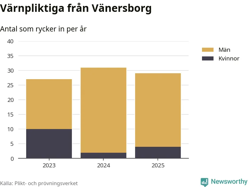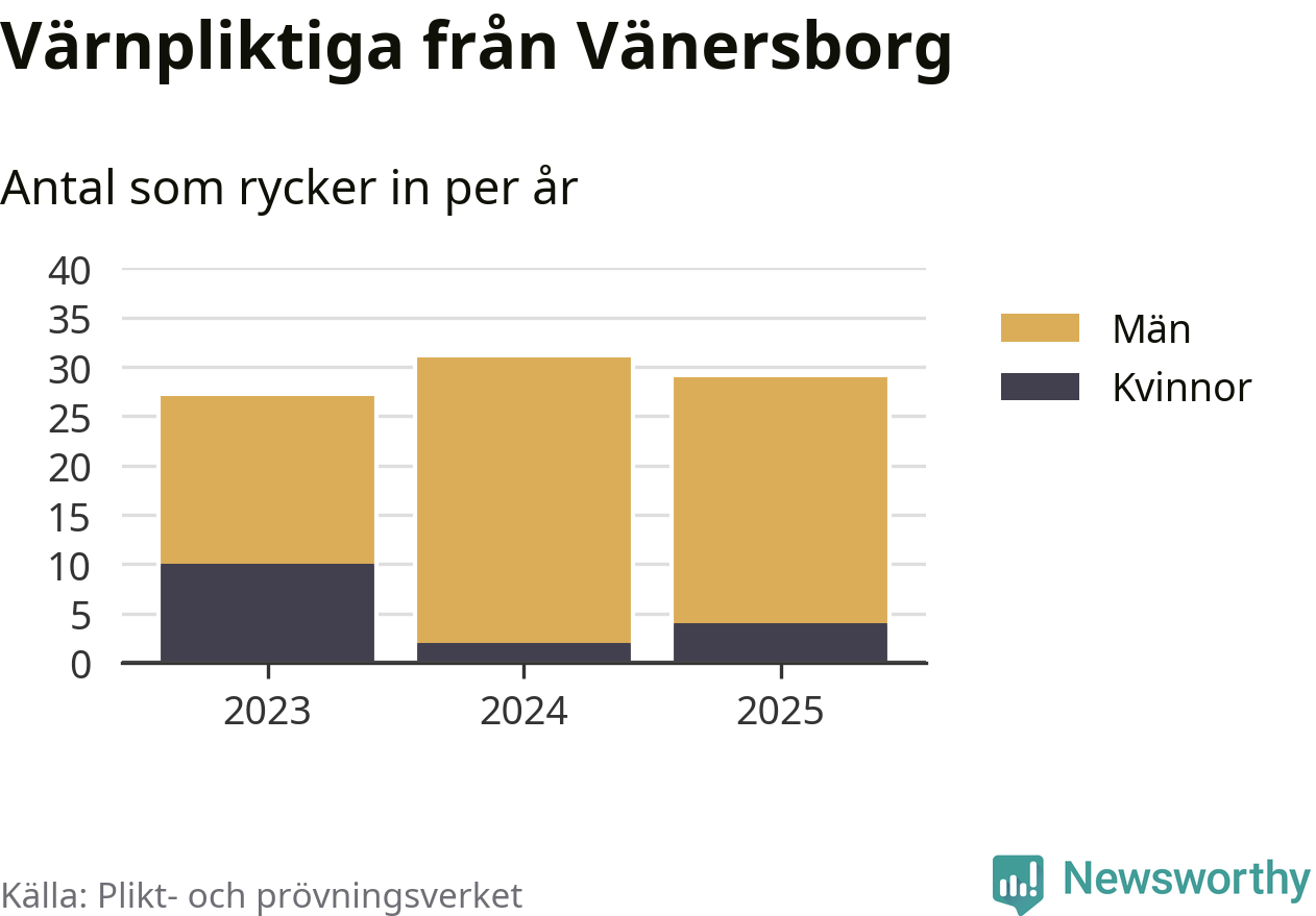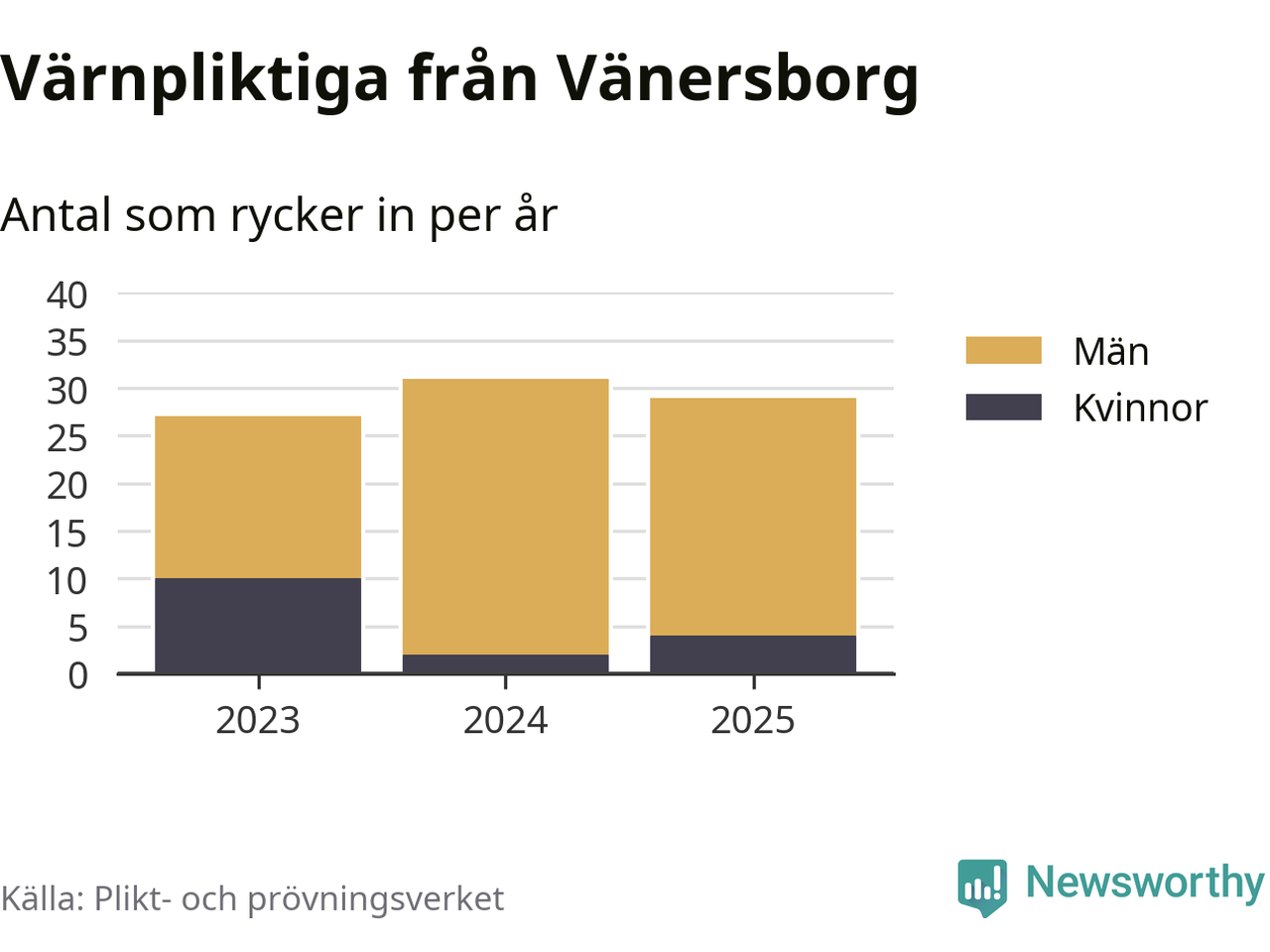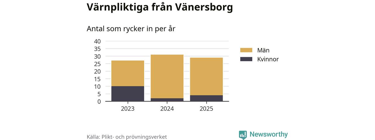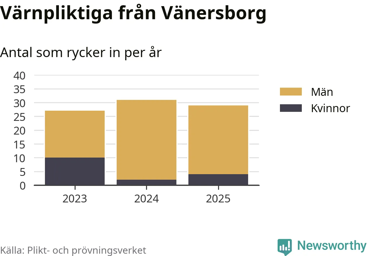 Sedan 2023 – som är det första året vi har jämförbara siffror för – har totalt 87 ungdomar från Vänersborg påbörjat sin värnplikt. Av dem har 16 varit kvinnor.