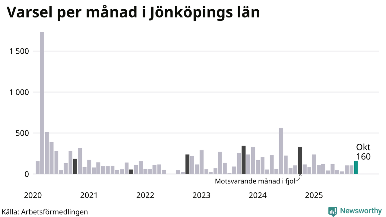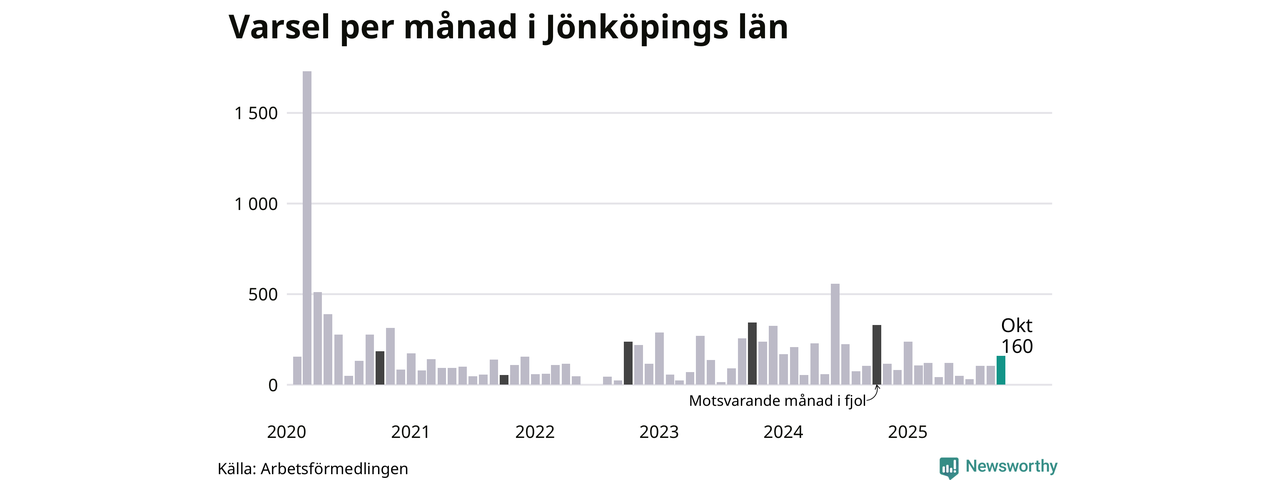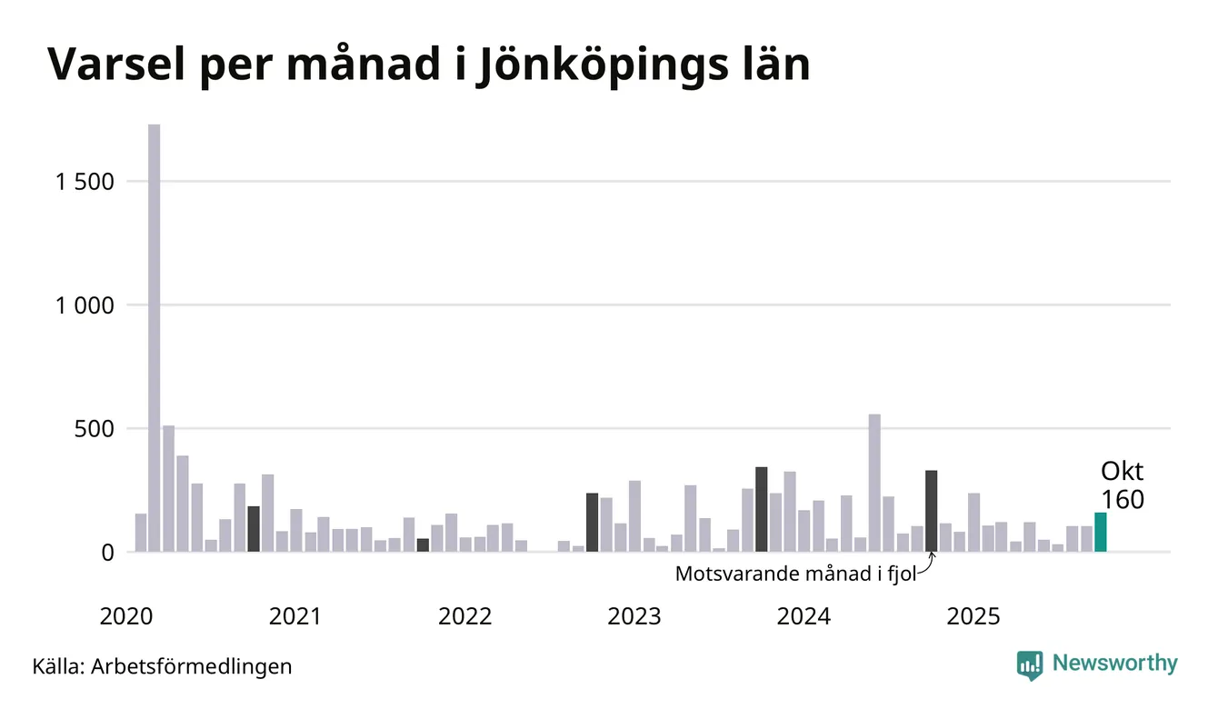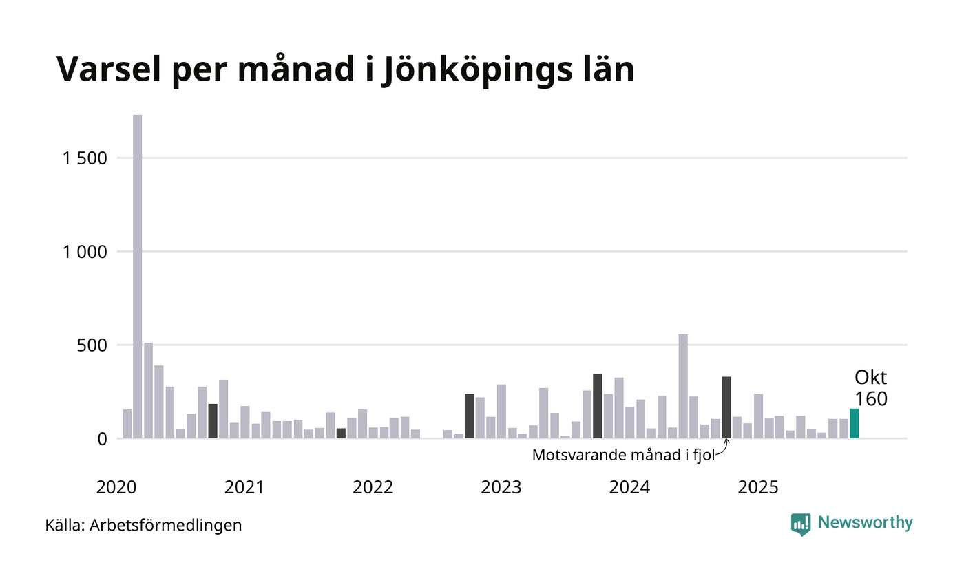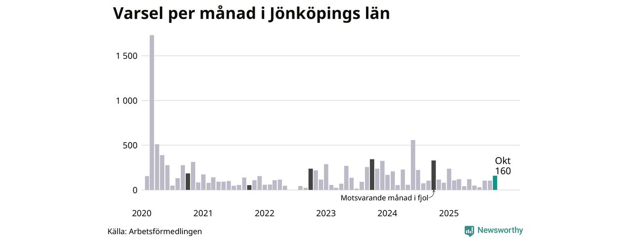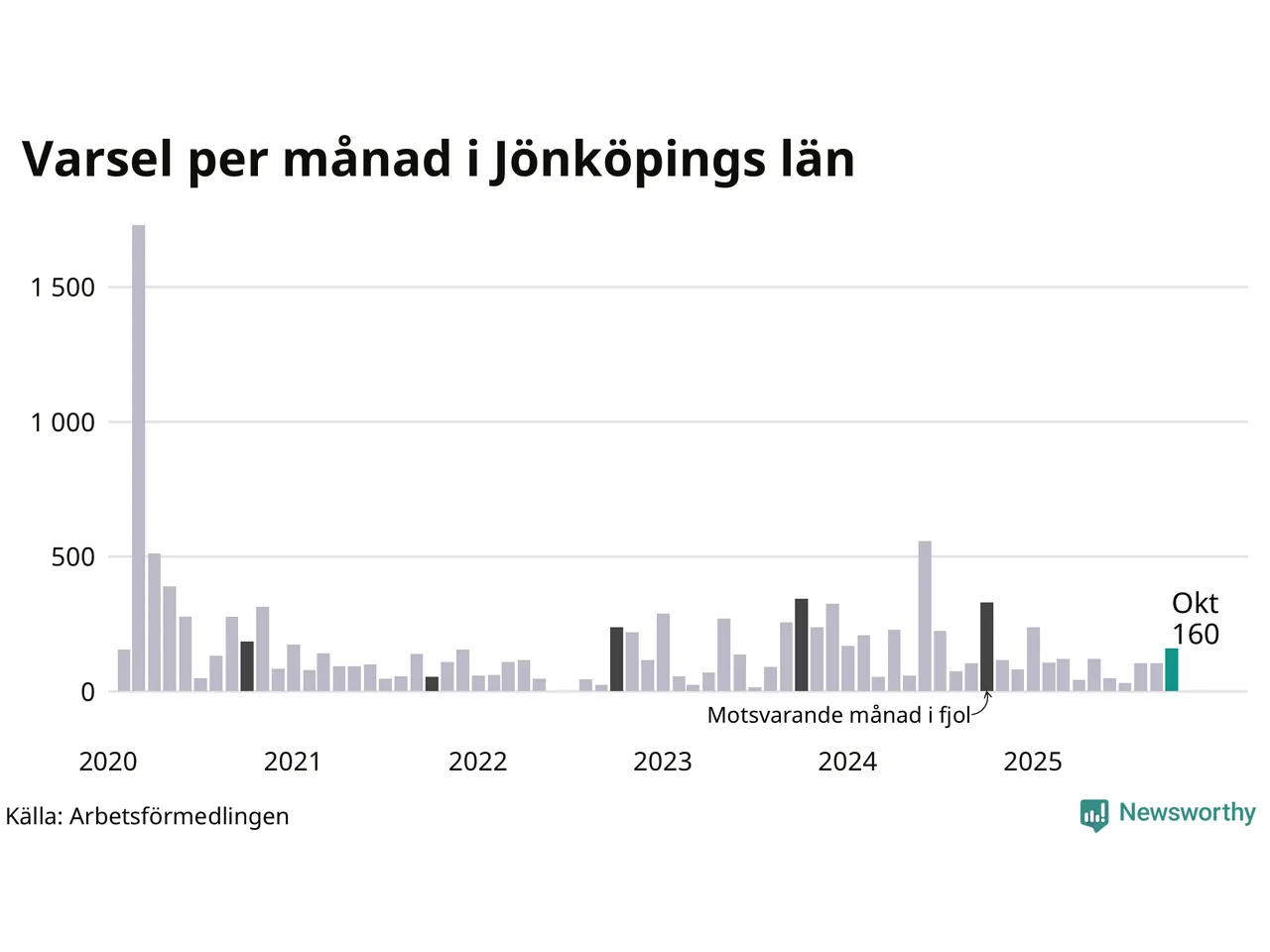 Efter två månader utan rapporterade varsel i länet varslades 160 personer i Jönköpings län under oktober 2025. Det är 56 fler än i september. För ett år sedan var antalet varsel 329 i länet. Sett över de tre senaste månaderna har totalt 368 varsel rapporterats i Jönköpings län, vilket är 139 färre än motsvarande period 2024. I början av pandemin, i mars 2020, varslades som mest 1 729 personer under en månad i Jönköpings län.