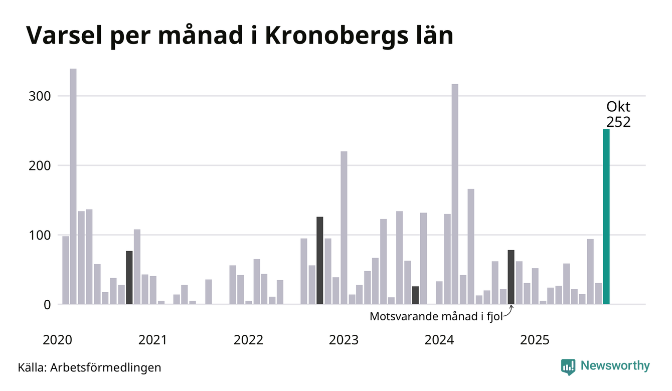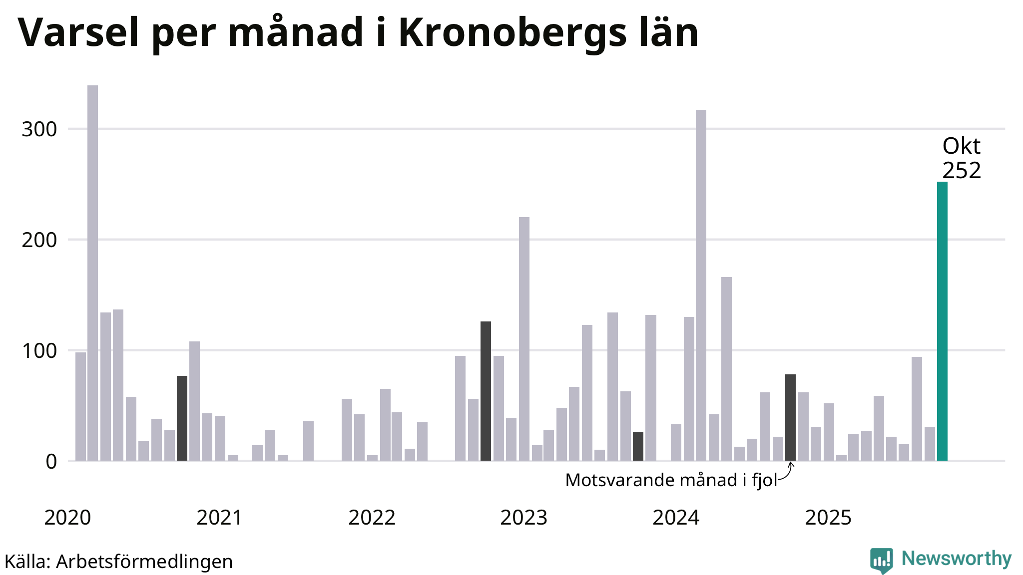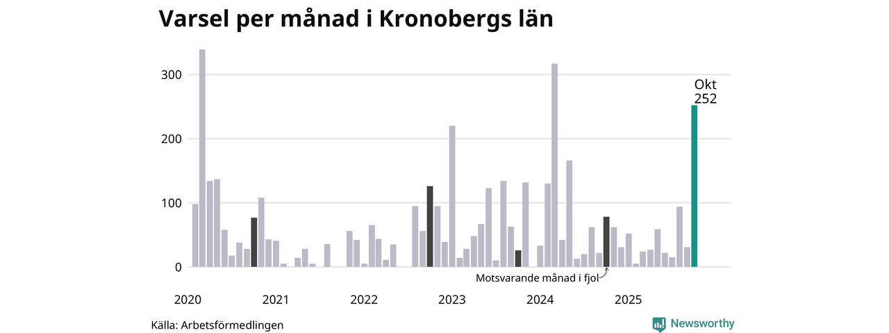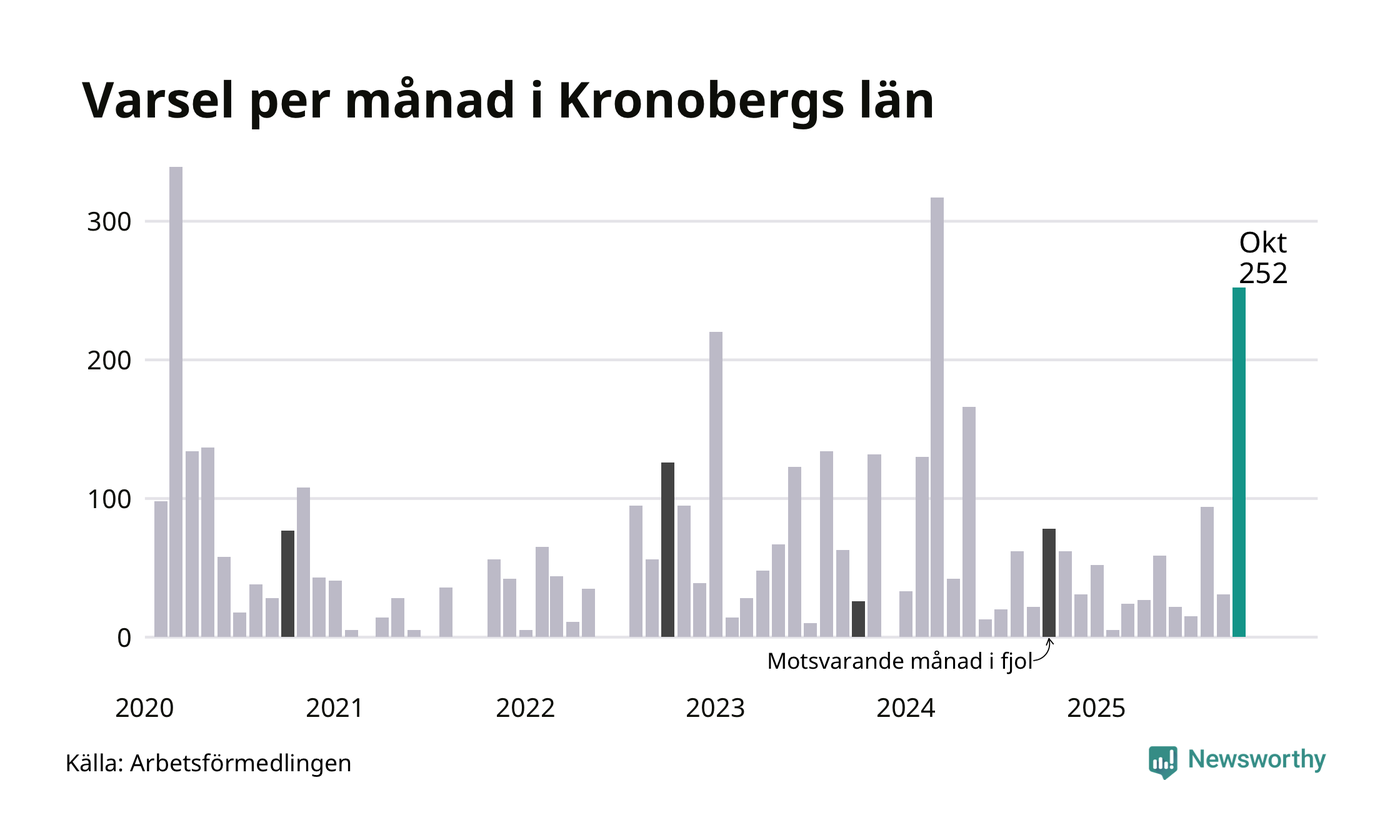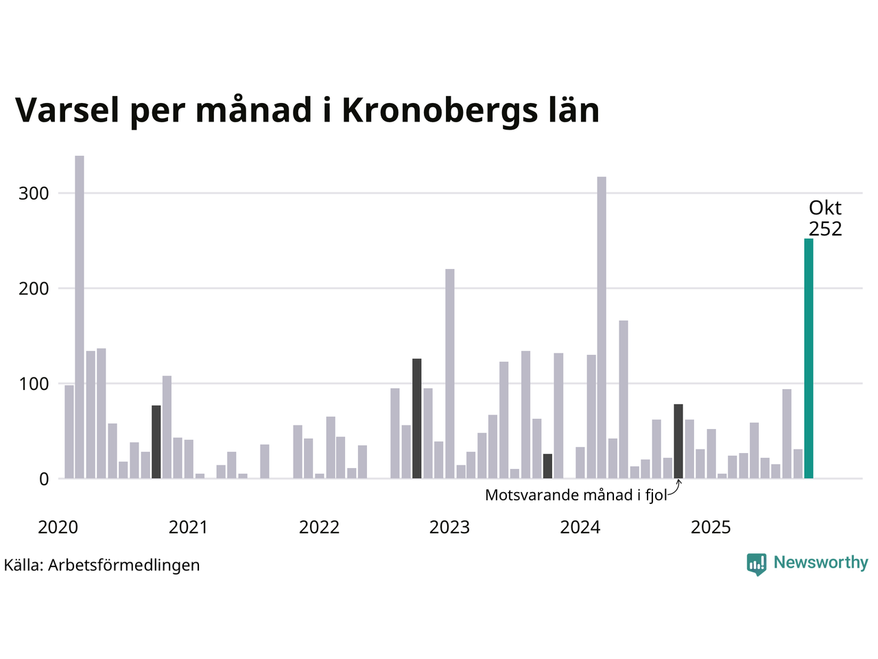 252 personer varslades om uppsägning i Kronoberg under oktober 2025. Det är 221 fler än i september och den högsta siffran sedan mars 2024. Däremot är det fortfarande färre än i början av pandemin, i mars 2020, då 339 personer varslades i Kronoberg. Sett över de tre senaste månaderna har totalt 377 varsel rapporterats i Kronoberg, vilket är mer än dubbelt så många som under motsvarande period i fjol.