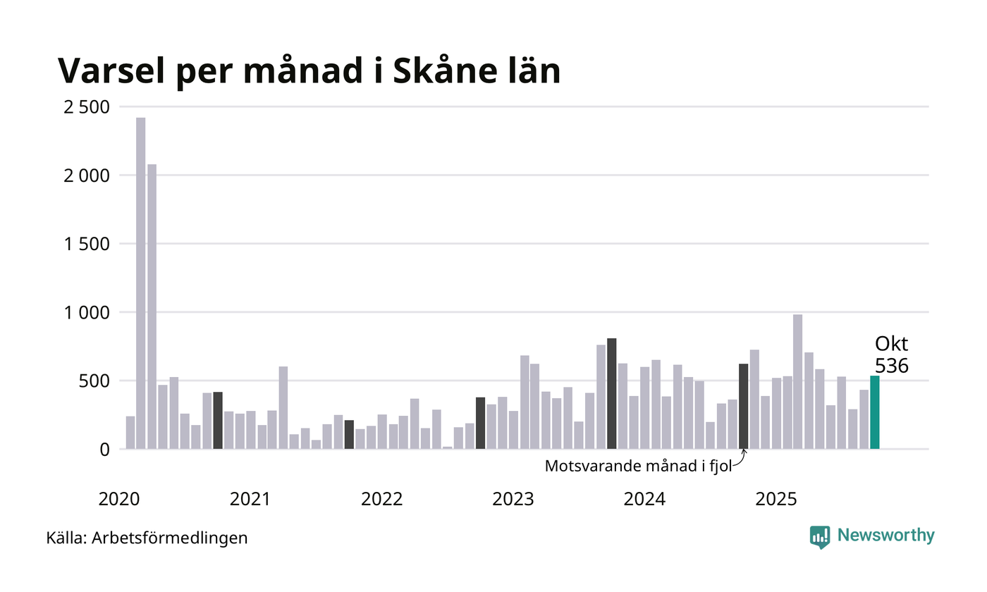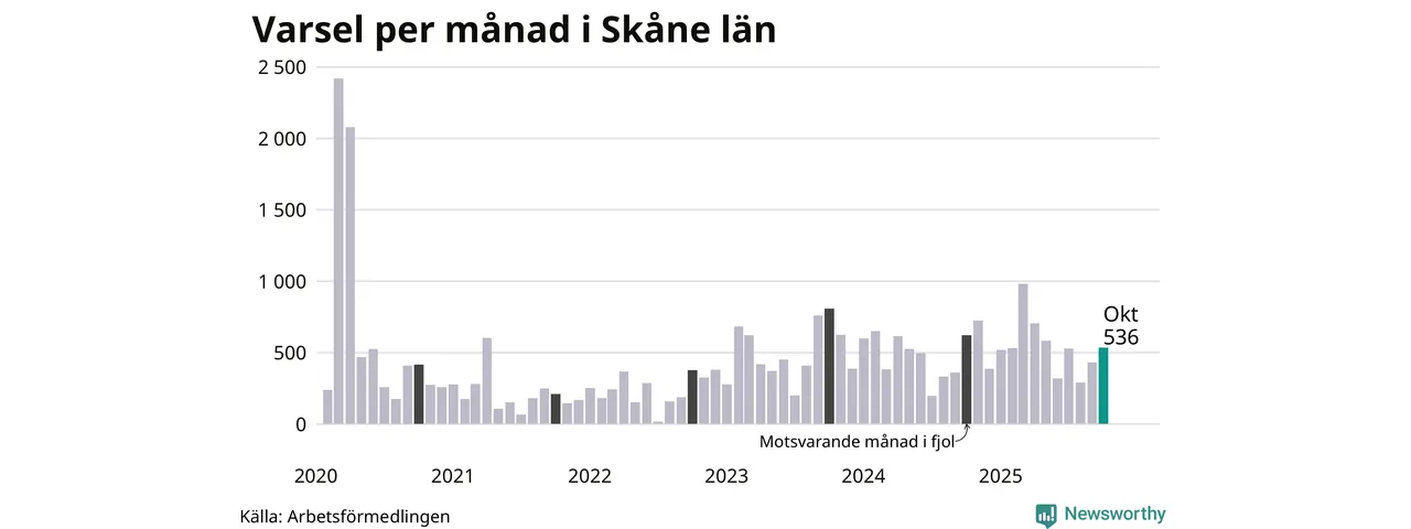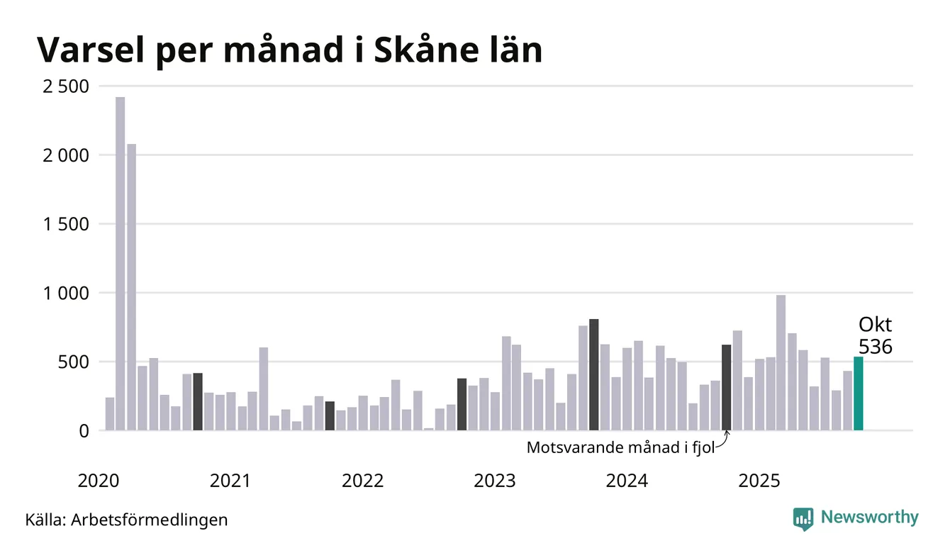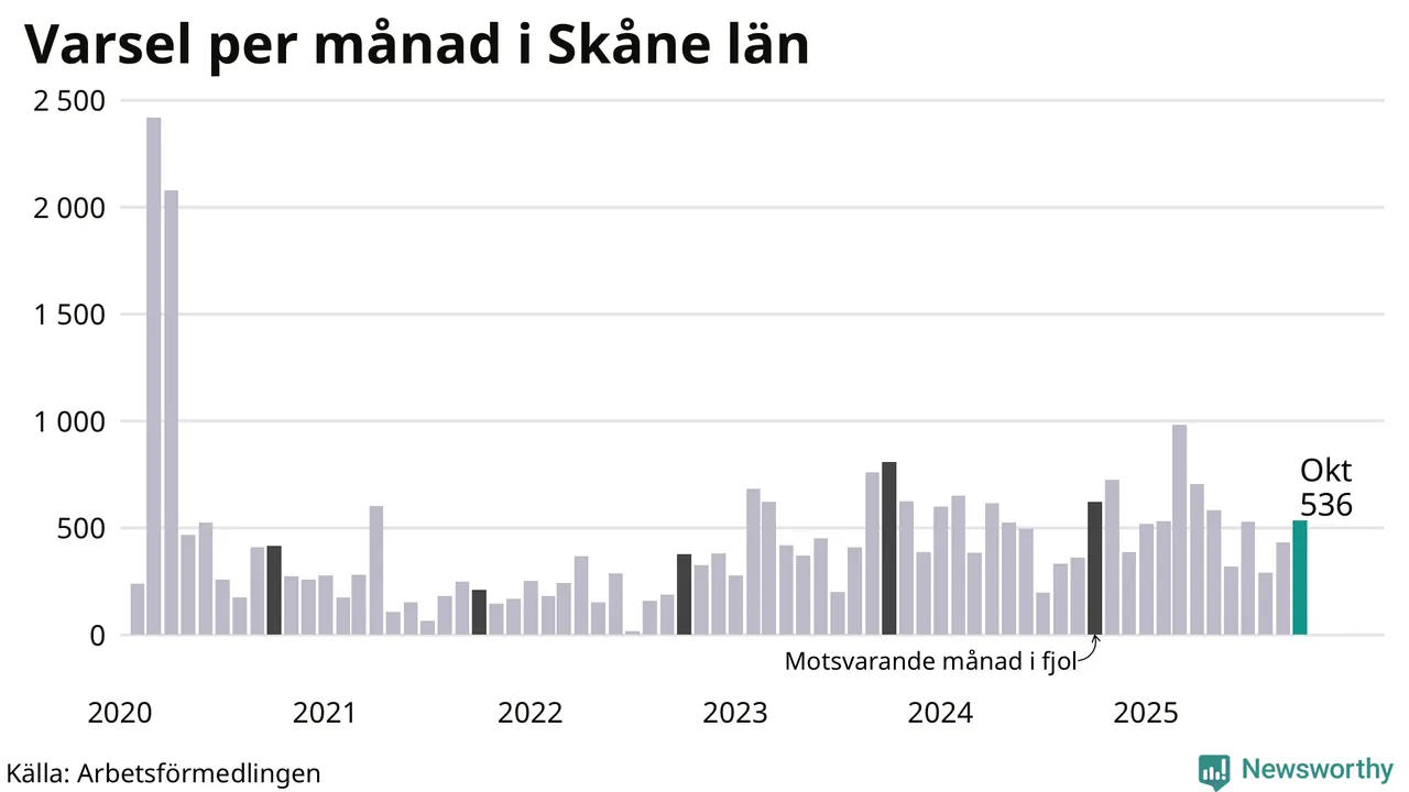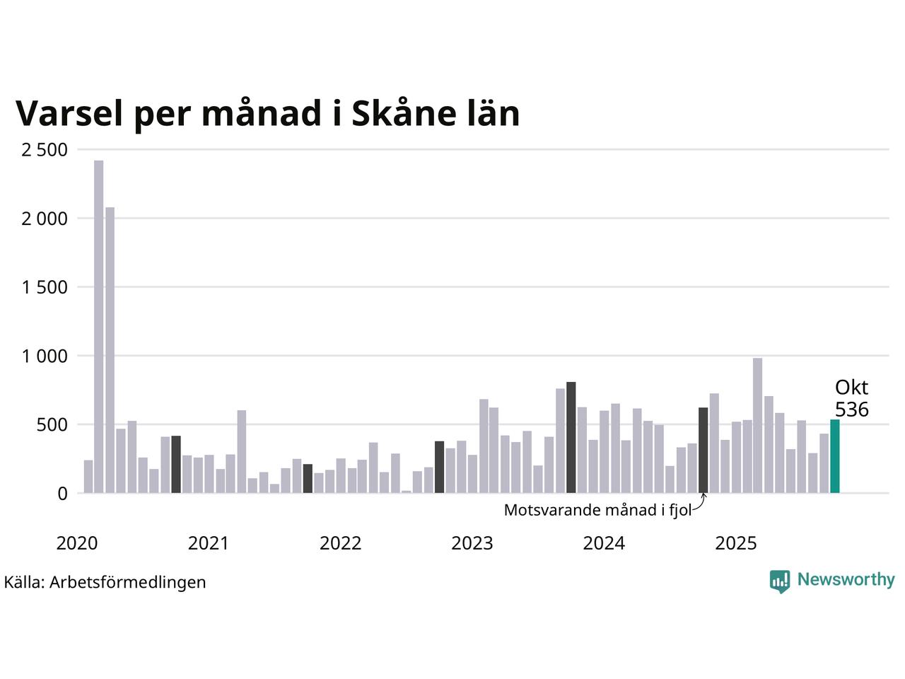 536 personer varslades om uppsägning i Skåne under oktober 2025. Det är 104 fler än i september. För ett år sedan var antalet varsel 623 i länet. Sett över de tre senaste månaderna har totalt 1 259 varsel rapporterats i Skåne, vilket är 60 färre än motsvarande period 2024. I början av pandemin, i mars 2020, varslades som mest 2 418 personer under en månad i Skåne.
