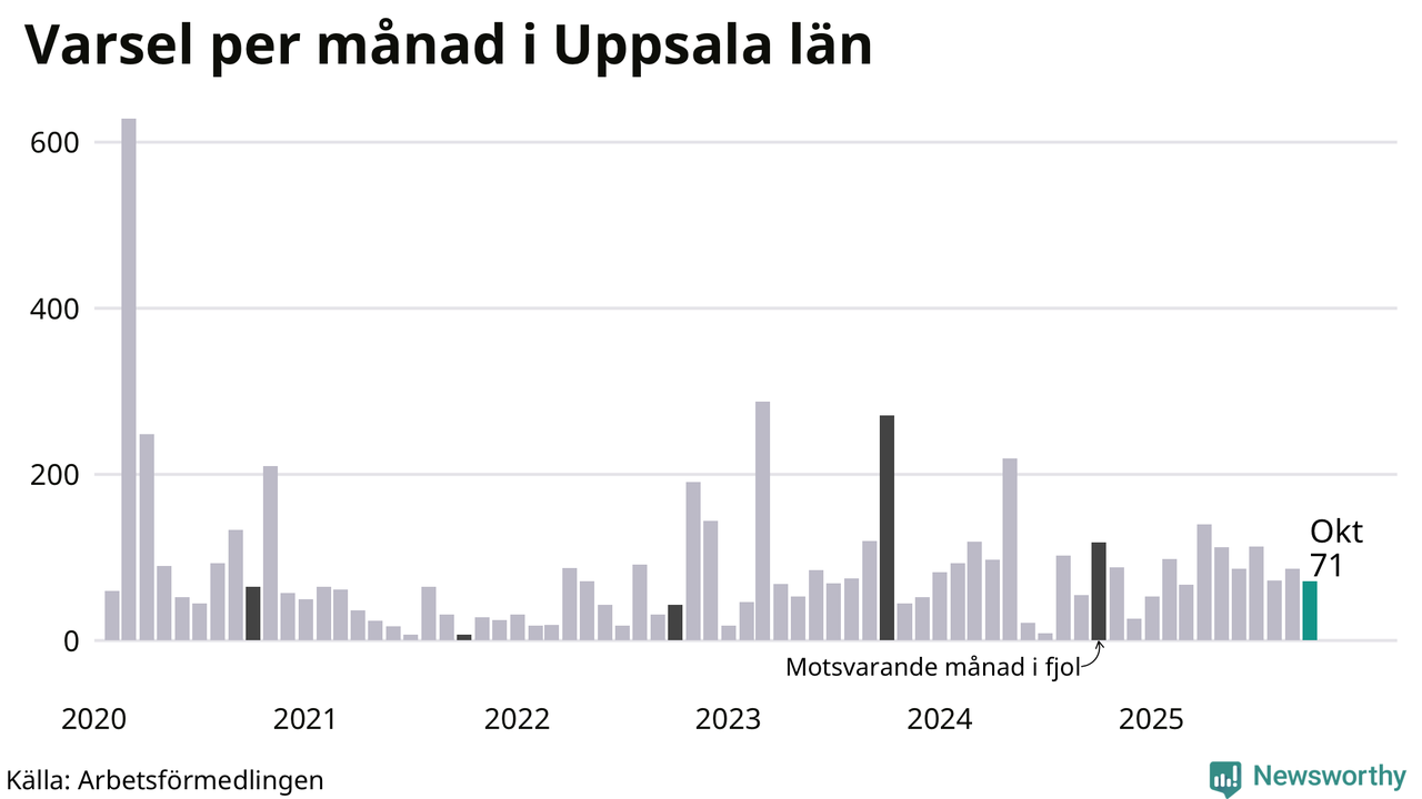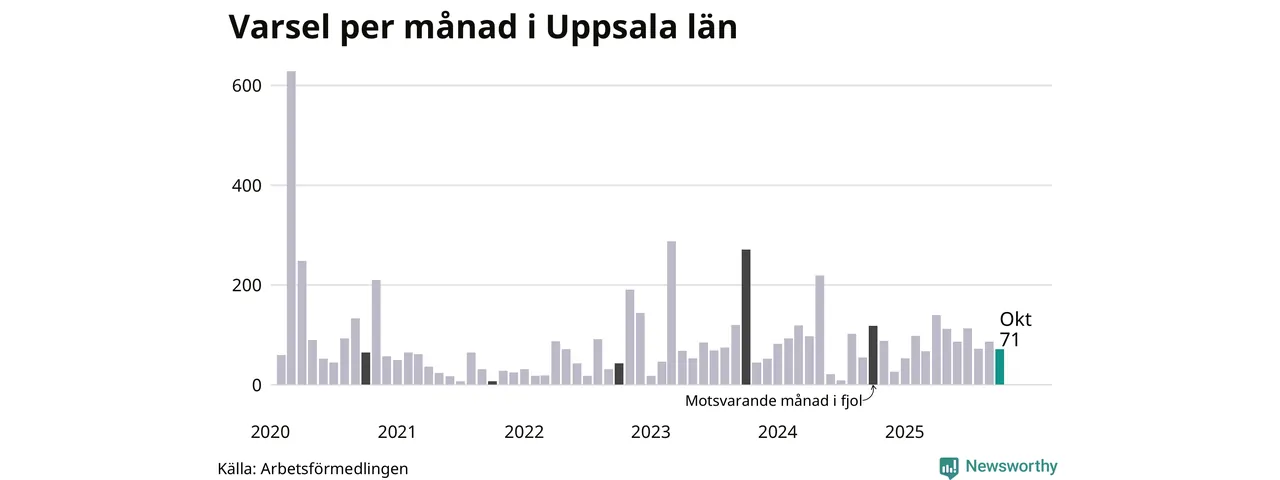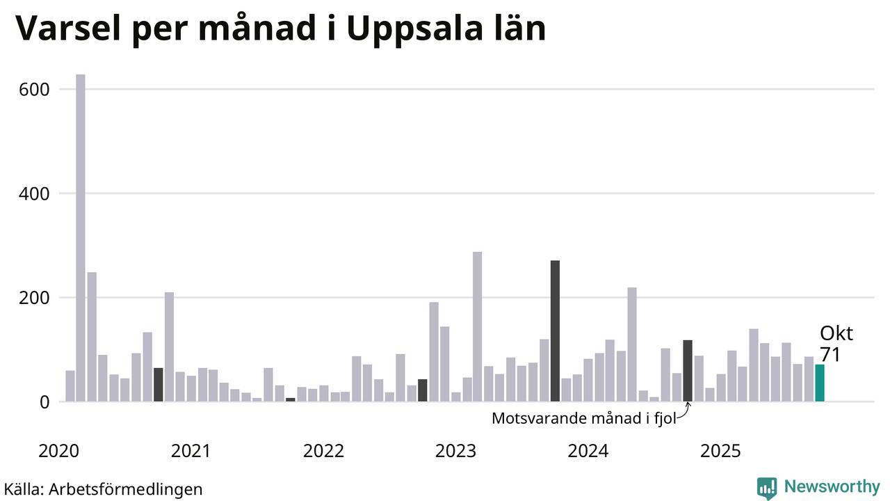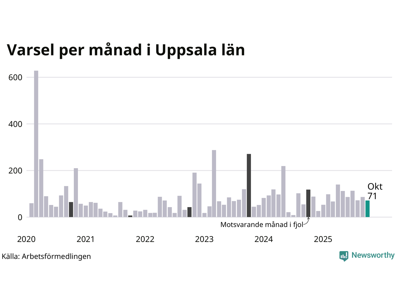 71 personer varslades om uppsägning i Uppsala län under oktober 2025. Det är 15 färre än i september. För ett år sedan var antalet varsel 118 i länet. Sett över de tre senaste månaderna har totalt 229 varsel rapporterats i Uppsala län, vilket är 46 färre än motsvarande period 2024. I början av pandemin, i mars 2020, varslades som mest 628 personer under en månad i Uppsala län.