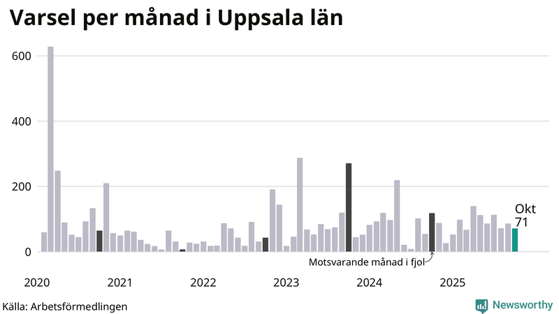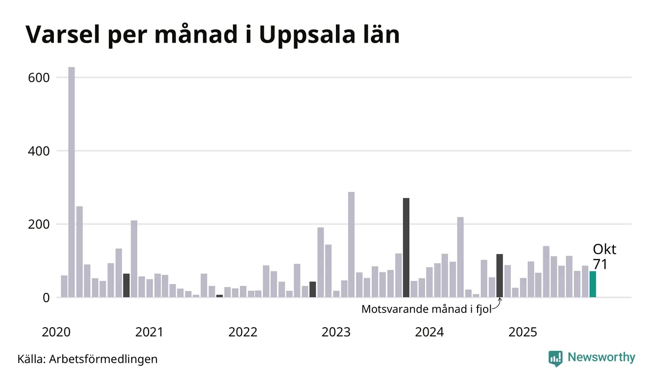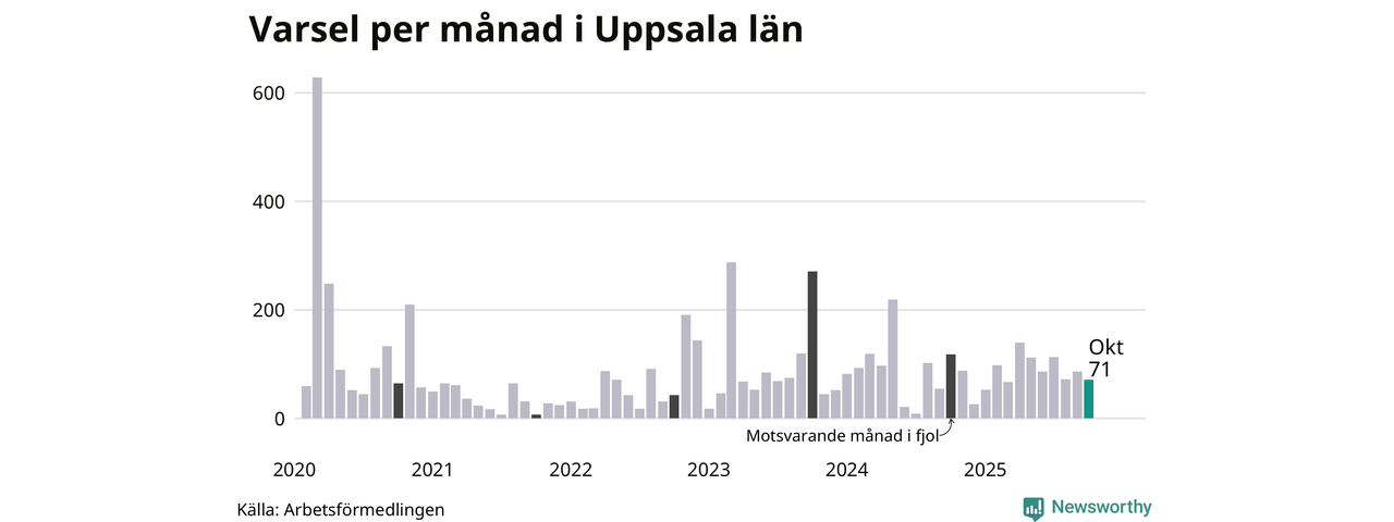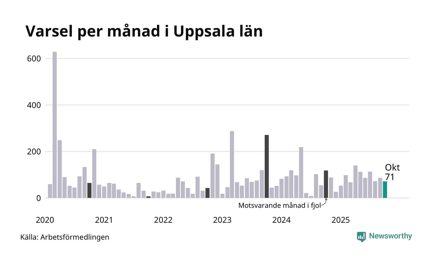 71 personer varslades om uppsägning i Uppsala län under oktober 2025. Det är 15 färre än i september. För ett år sedan var antalet varsel 118 i länet. Sett över de tre senaste månaderna har totalt 229 varsel rapporterats i Uppsala län, vilket är 46 färre än motsvarande period 2024. I början av pandemin, i mars 2020, varslades som mest 628 personer under en månad i Uppsala län.