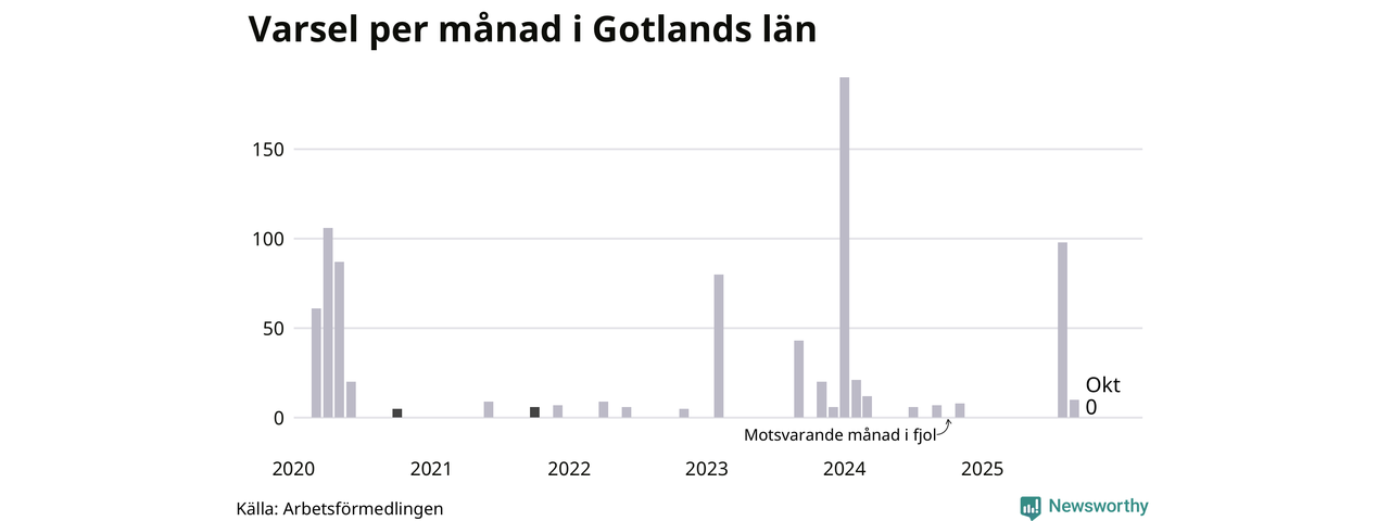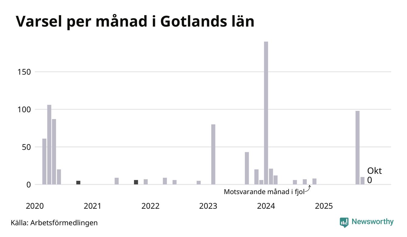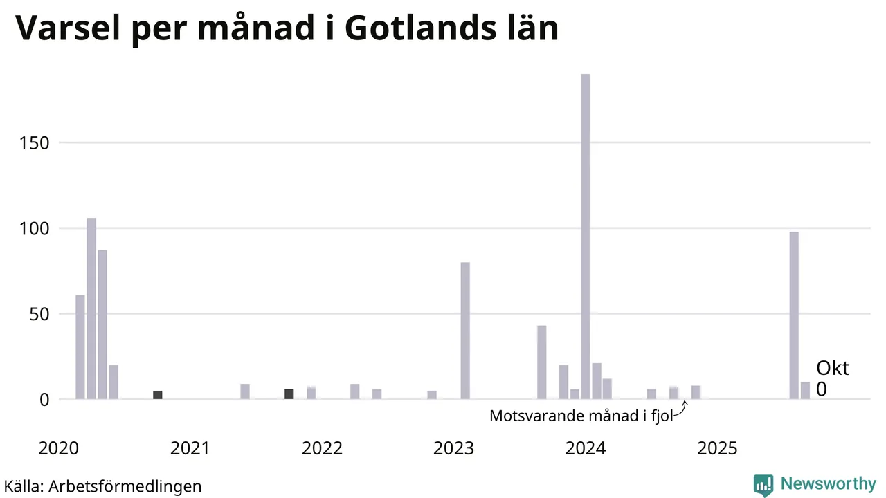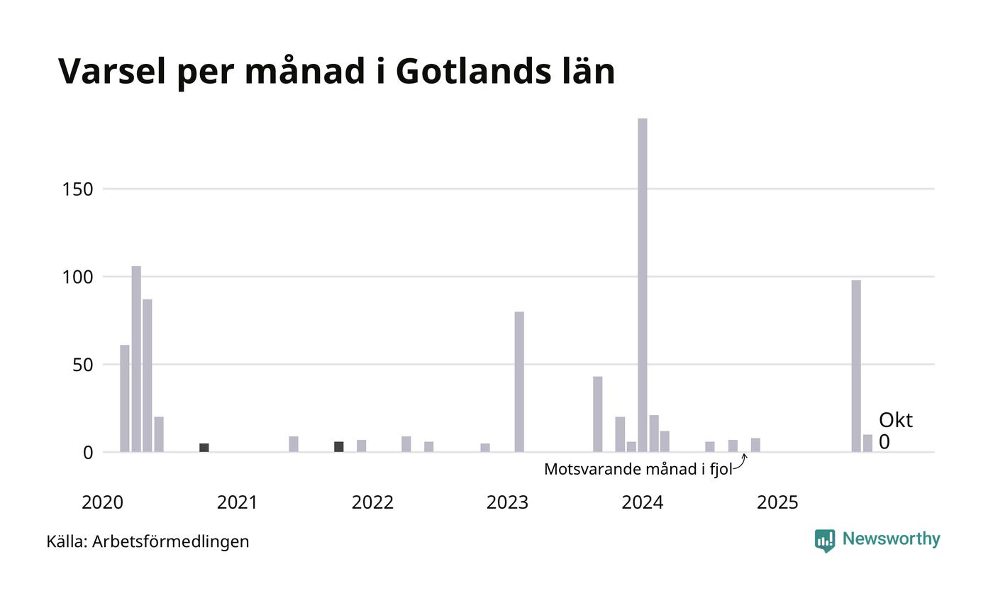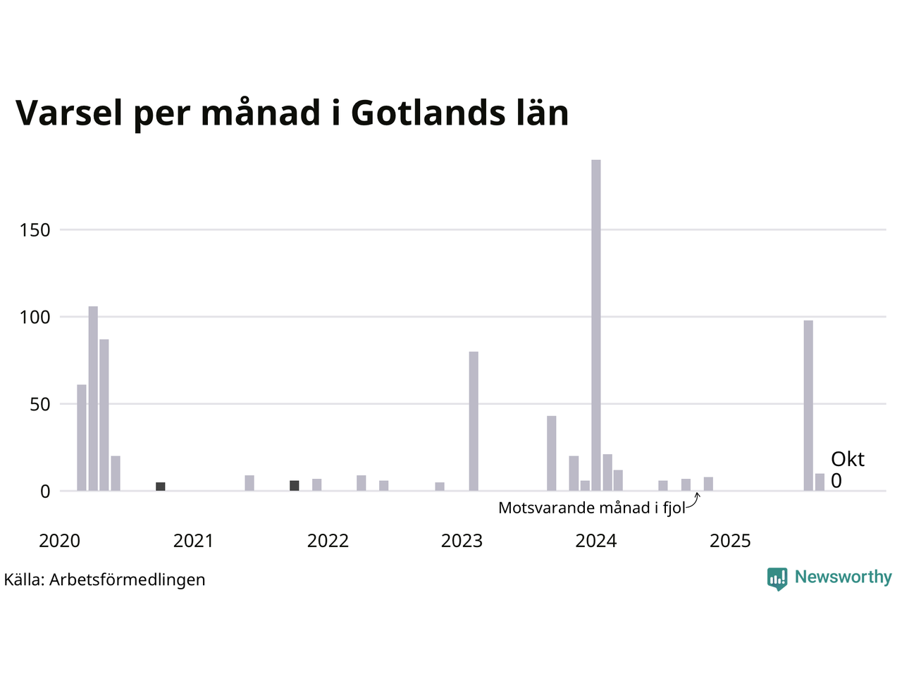 Inga varsel rapporterades på Gotland under oktober 2025. Senast något varsel rapporterades var i september 2025 – då berördes tio personer. För att arbetsgivare ska vara skyldiga att rapportera varsel krävs att minst fem personer berörs i länet – det kan alltså ha skett varsel som inte syns i statistiken. Det är inte ovanligt att det går månader utan några rapporterade varsel på Gotland.
