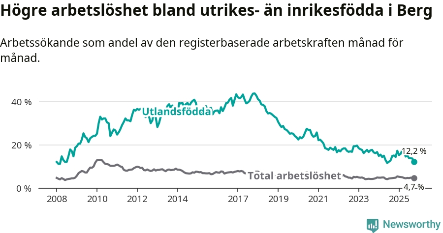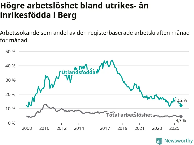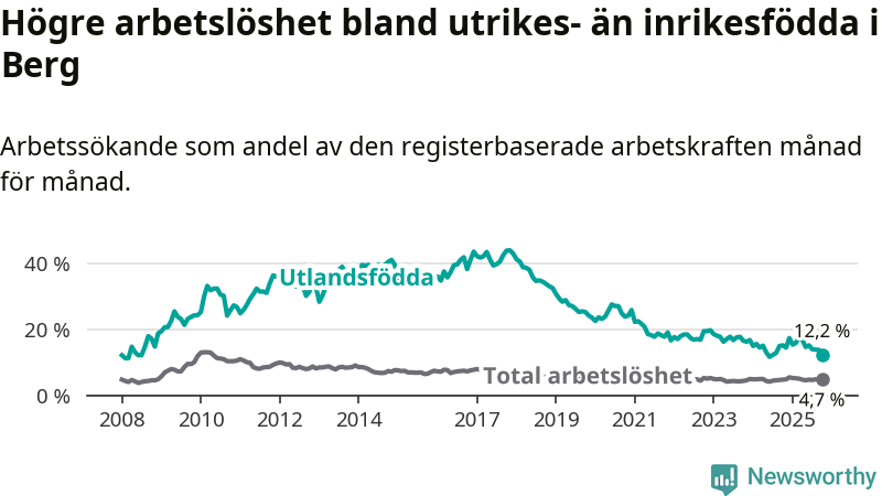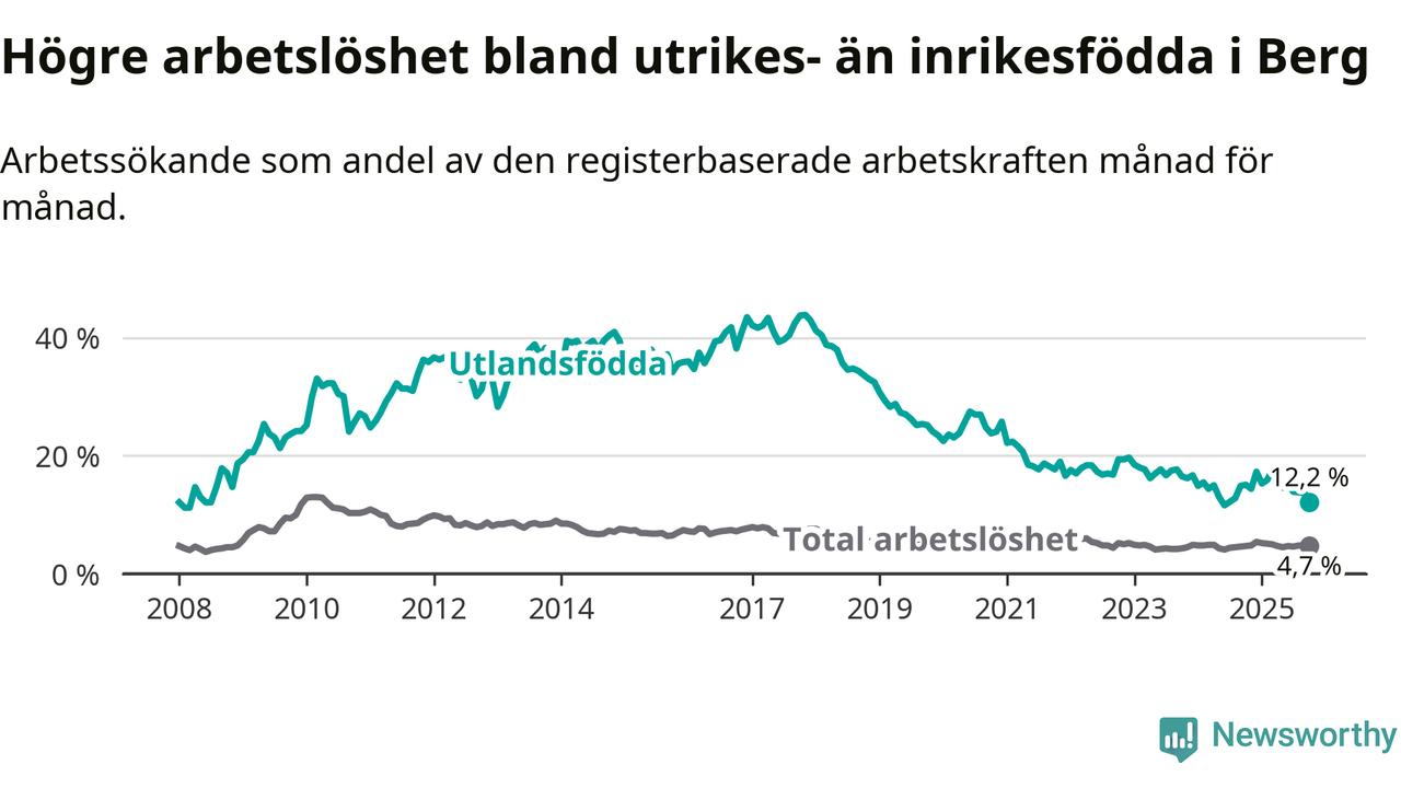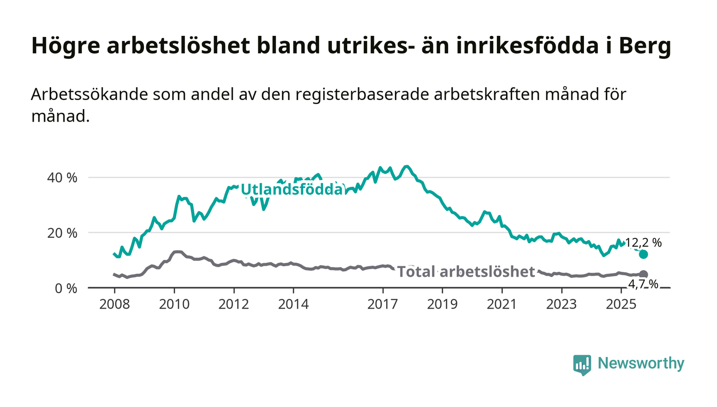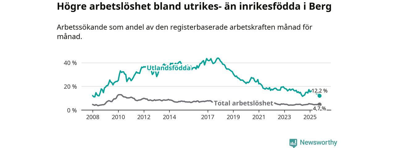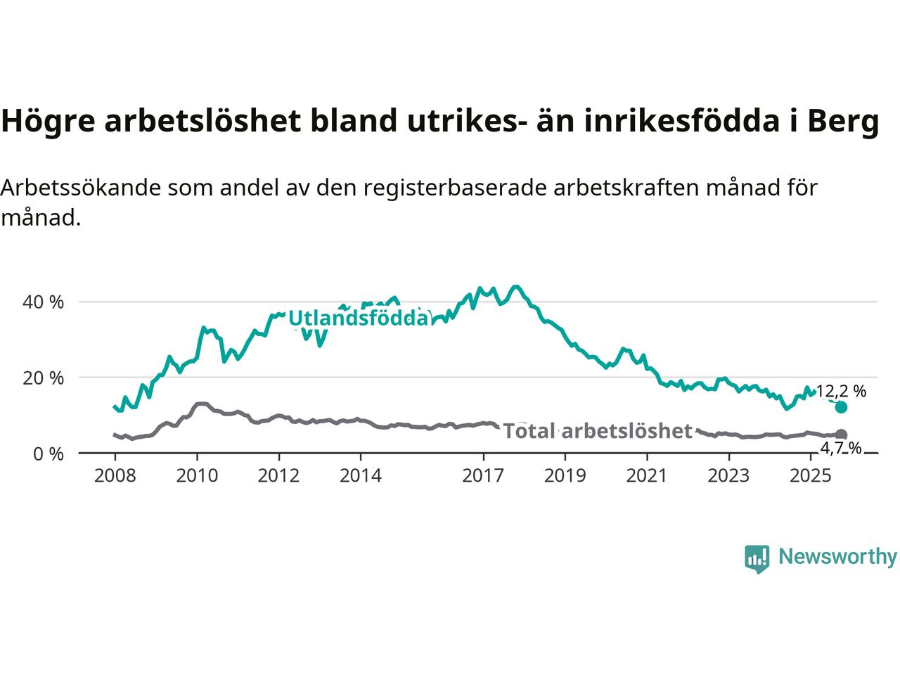 Arbetslösheten bland utlandsfödda var 12,2 procent i Berg under oktober månad, motsvarande 43 av 352 personer. Det är 2,9 procentenheter färre än vid samma tidpunkt i fjol (−9 om man räknar personer).